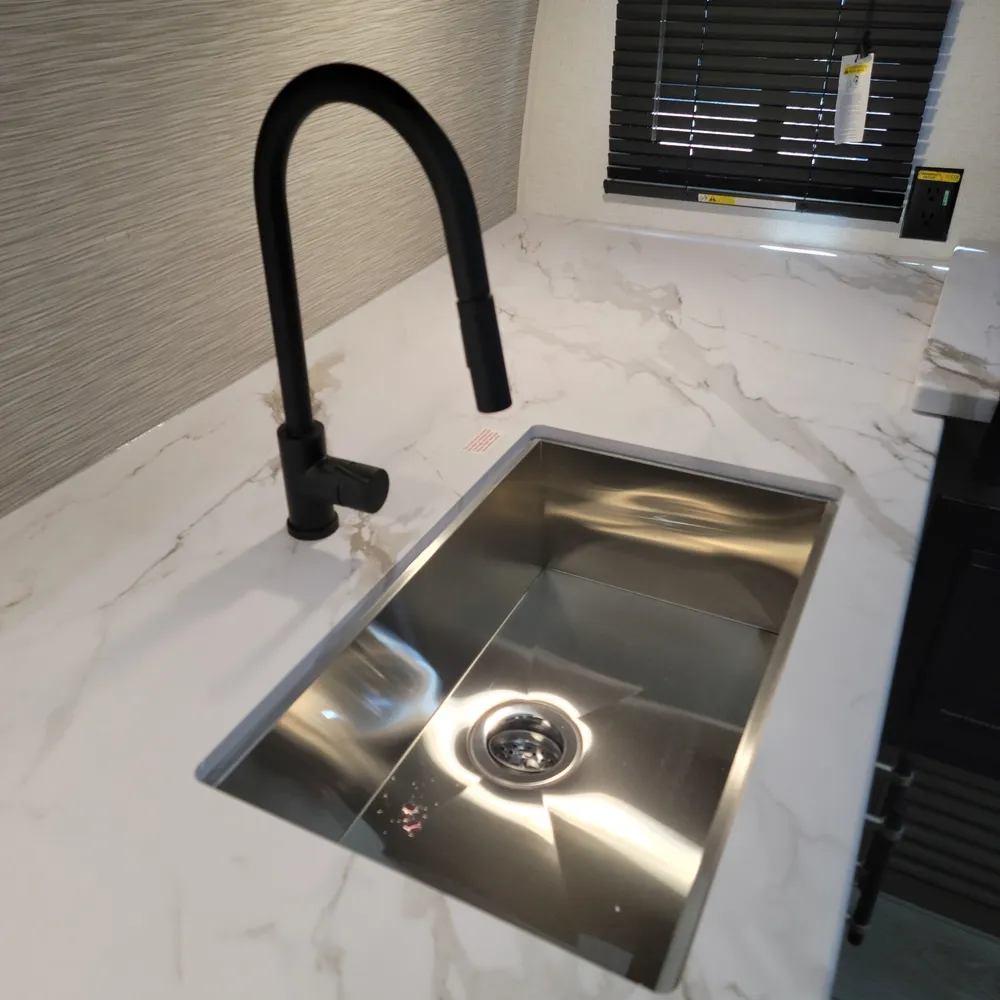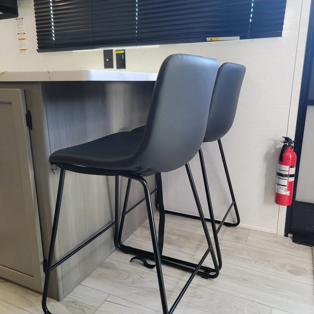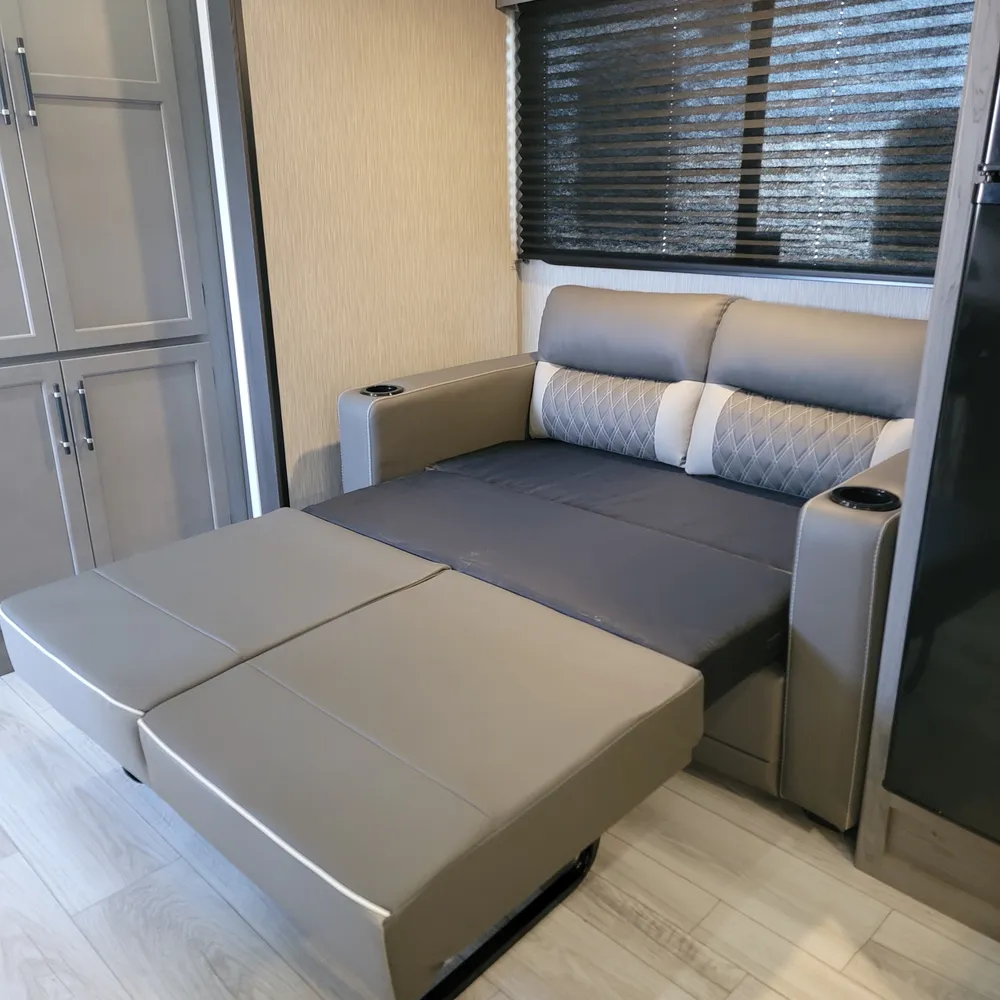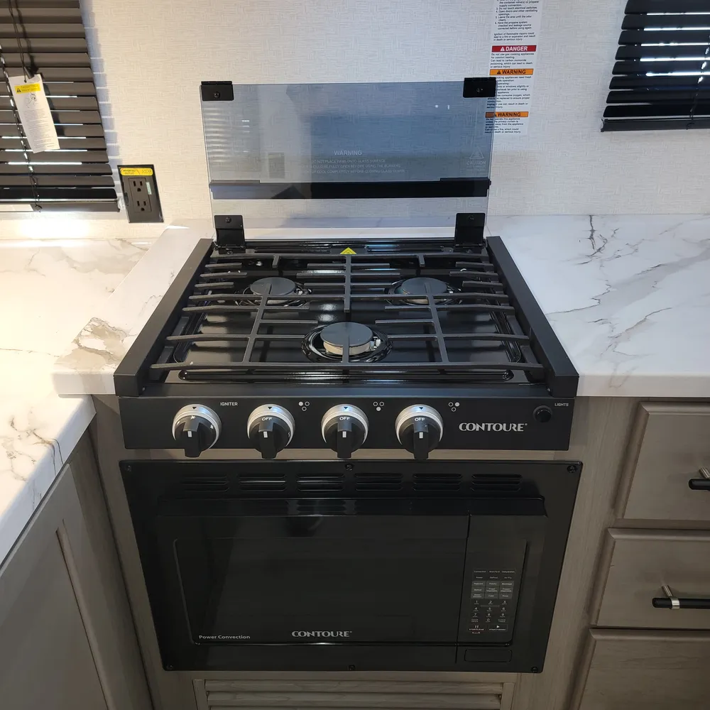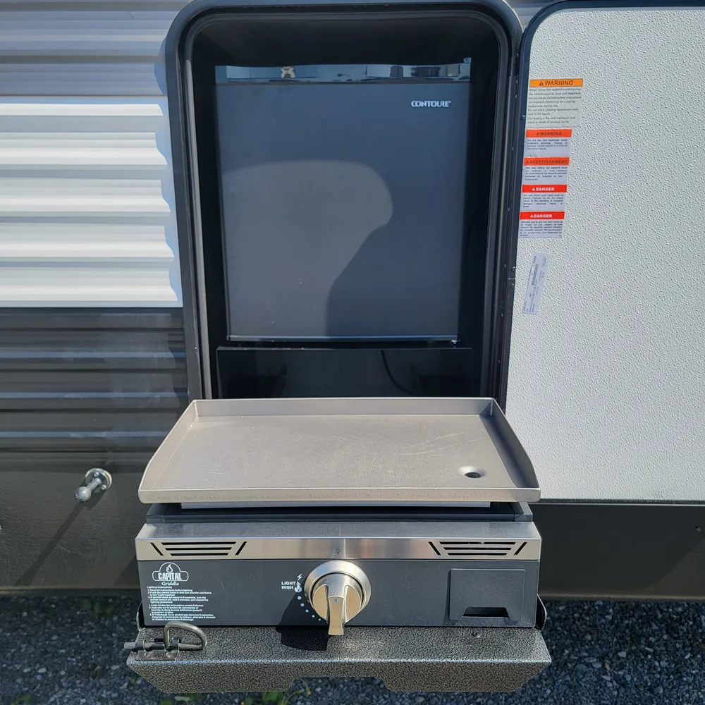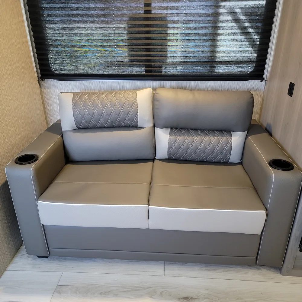 The 24FKS is a unique floorplan with the kitchen up front and the bedroom at the rear. The front slideout expands the kitchen area and brings out a tri-fold sofa and a counter with two chairs. The kitchen features good counter space and pantry storage. The 18′ power awning extends outdoor living space at the campsite.