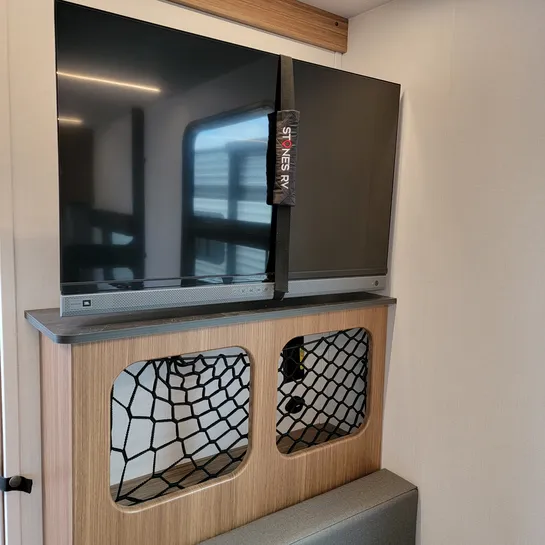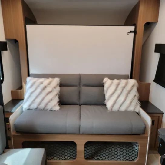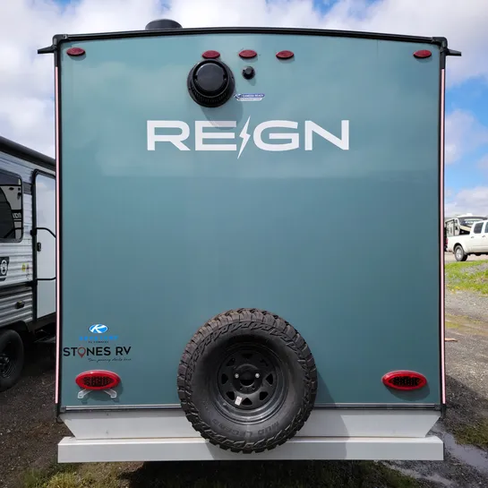 The 2025 Keystone Reign 15RB features a front Murphy bed, a booth dinette, and a rear bathroom, along with a kitchen with essential appliances and storage. The 15RB is built with durable materials like an automotive-finished aluminum exterior, a walkable roof, and a 100% composite floor.