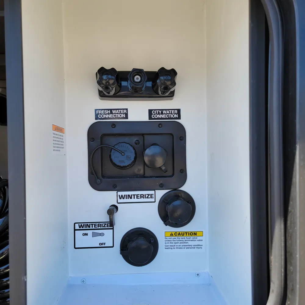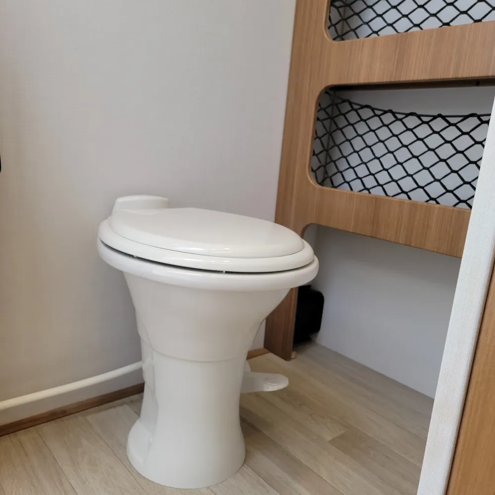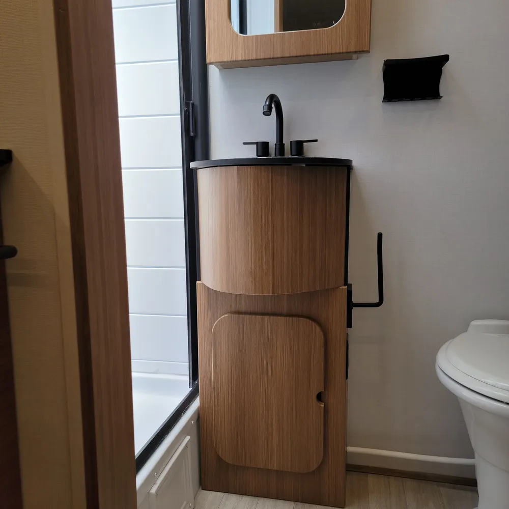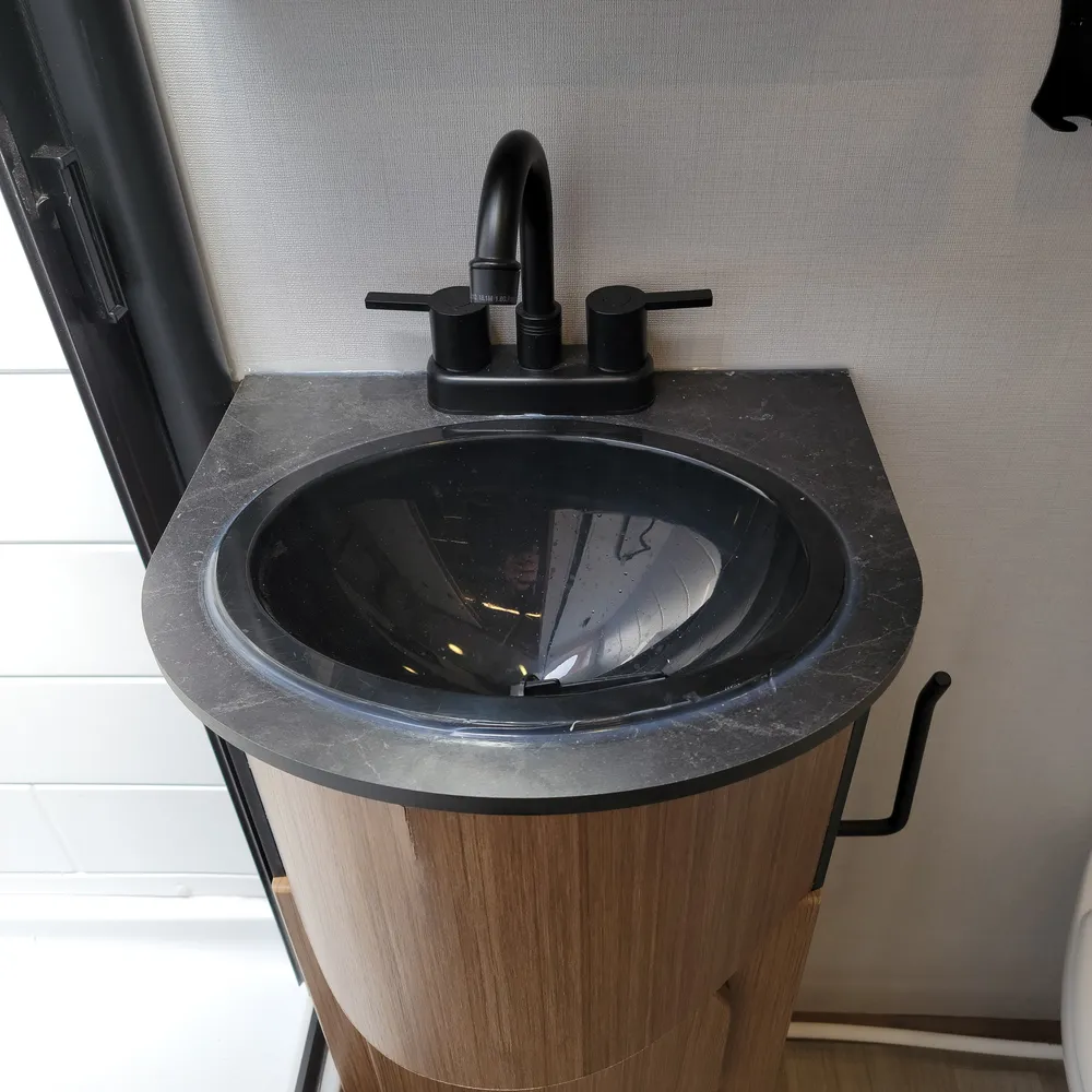 The rear bathroom has a porcelain toilet, vanity sink, and shower. USB-A and USB-C outlets are built in throughout.