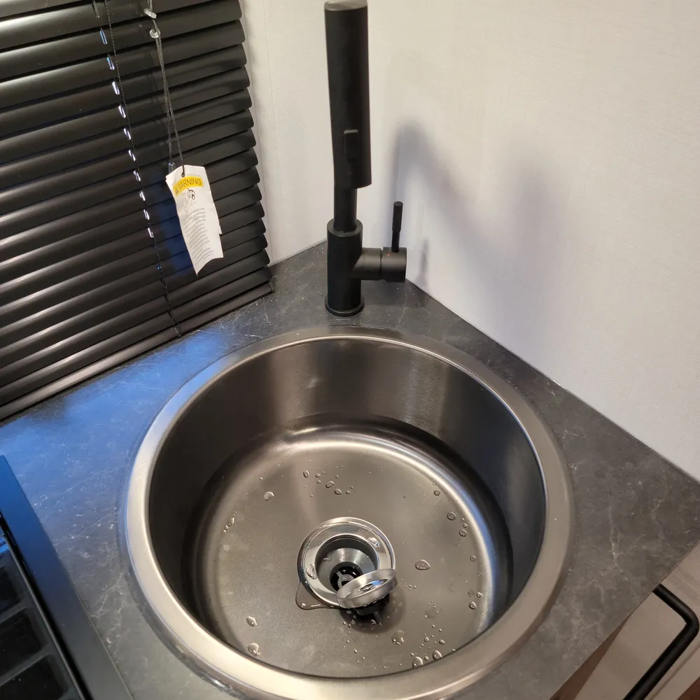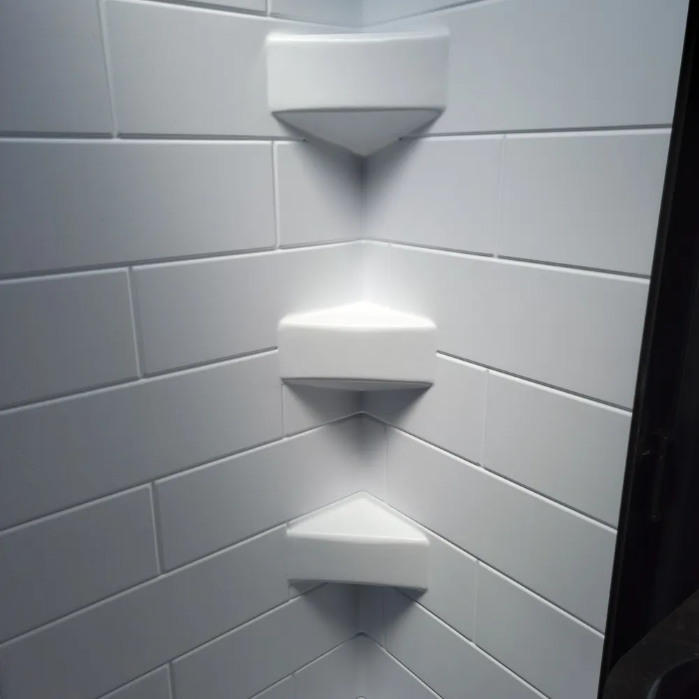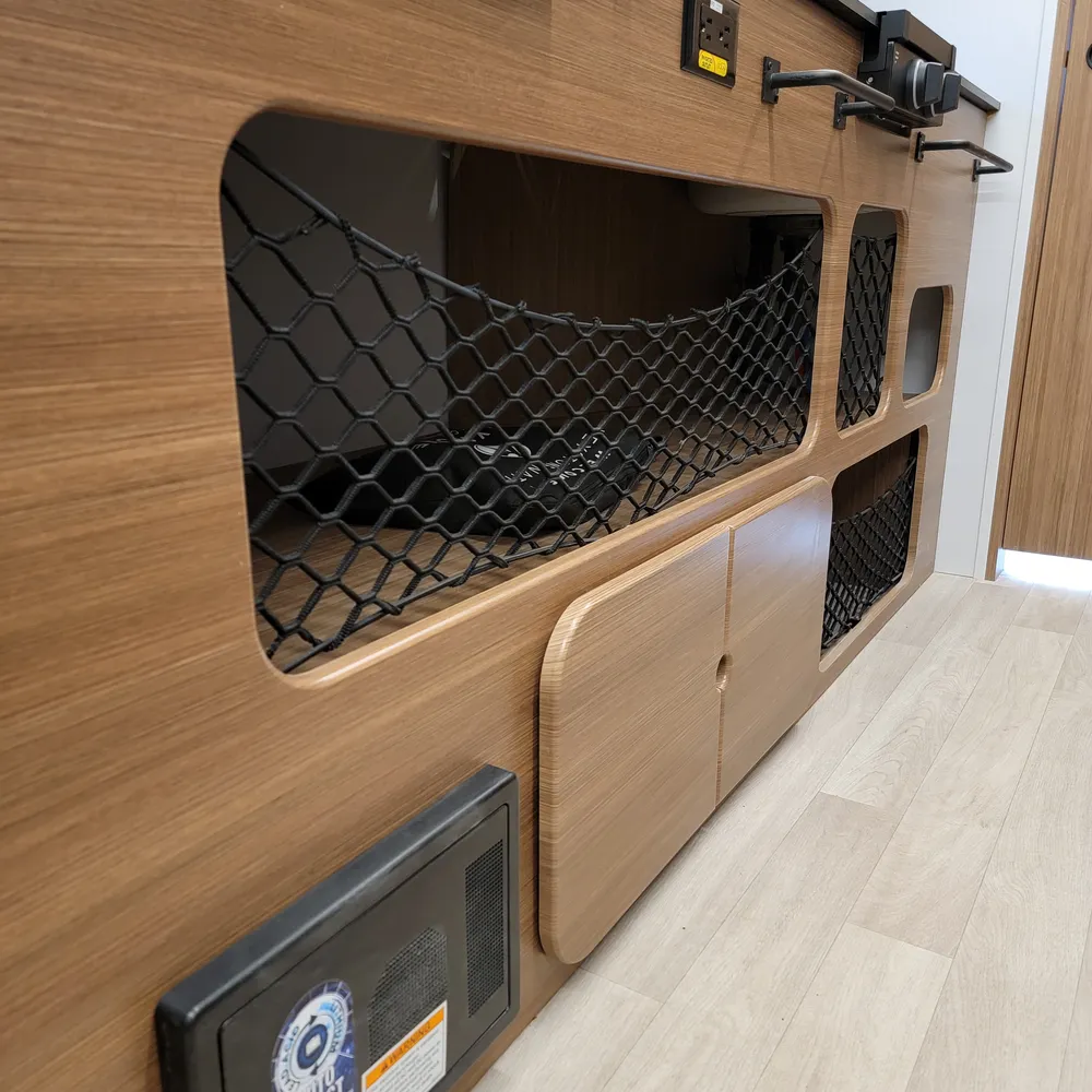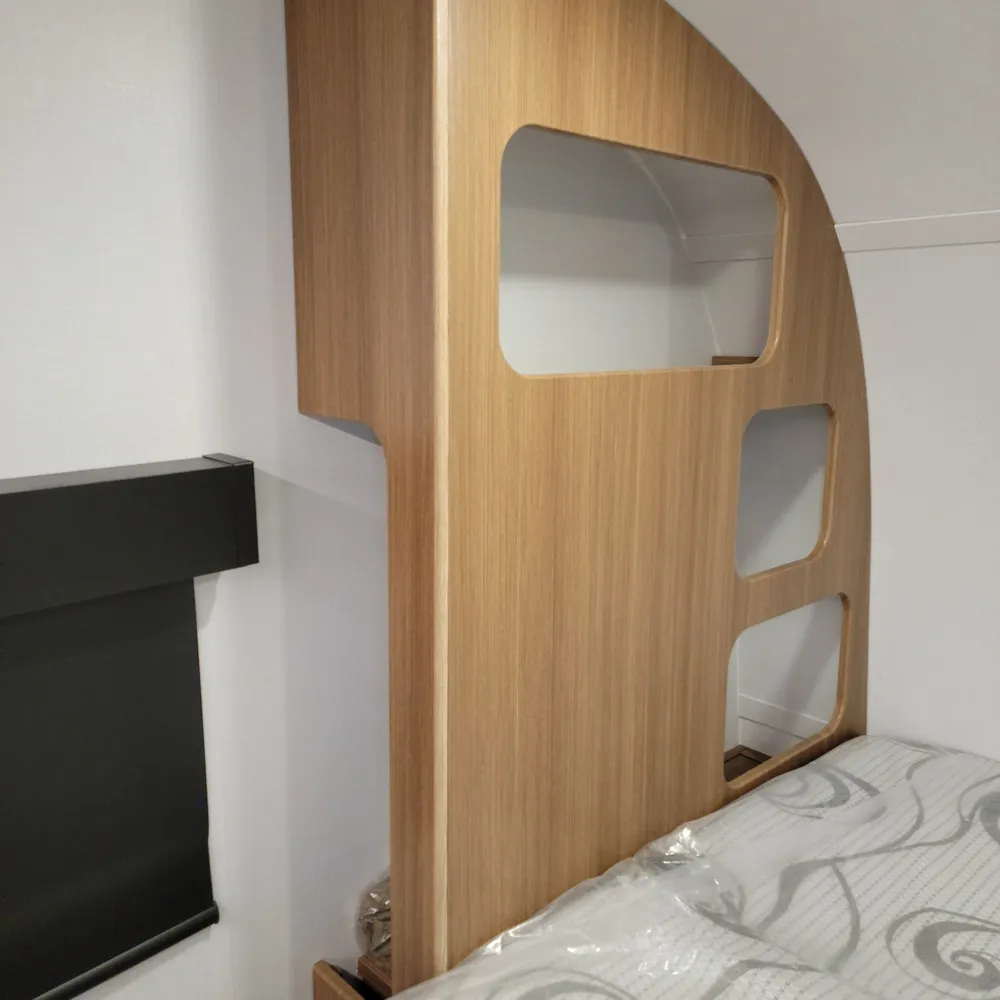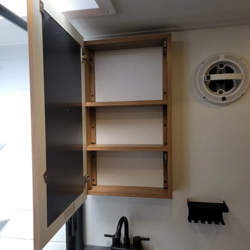 The rear bathroom has a porcelain toilet, vanity sink, and shower. USB-A and USB-C outlets are built in throughout.