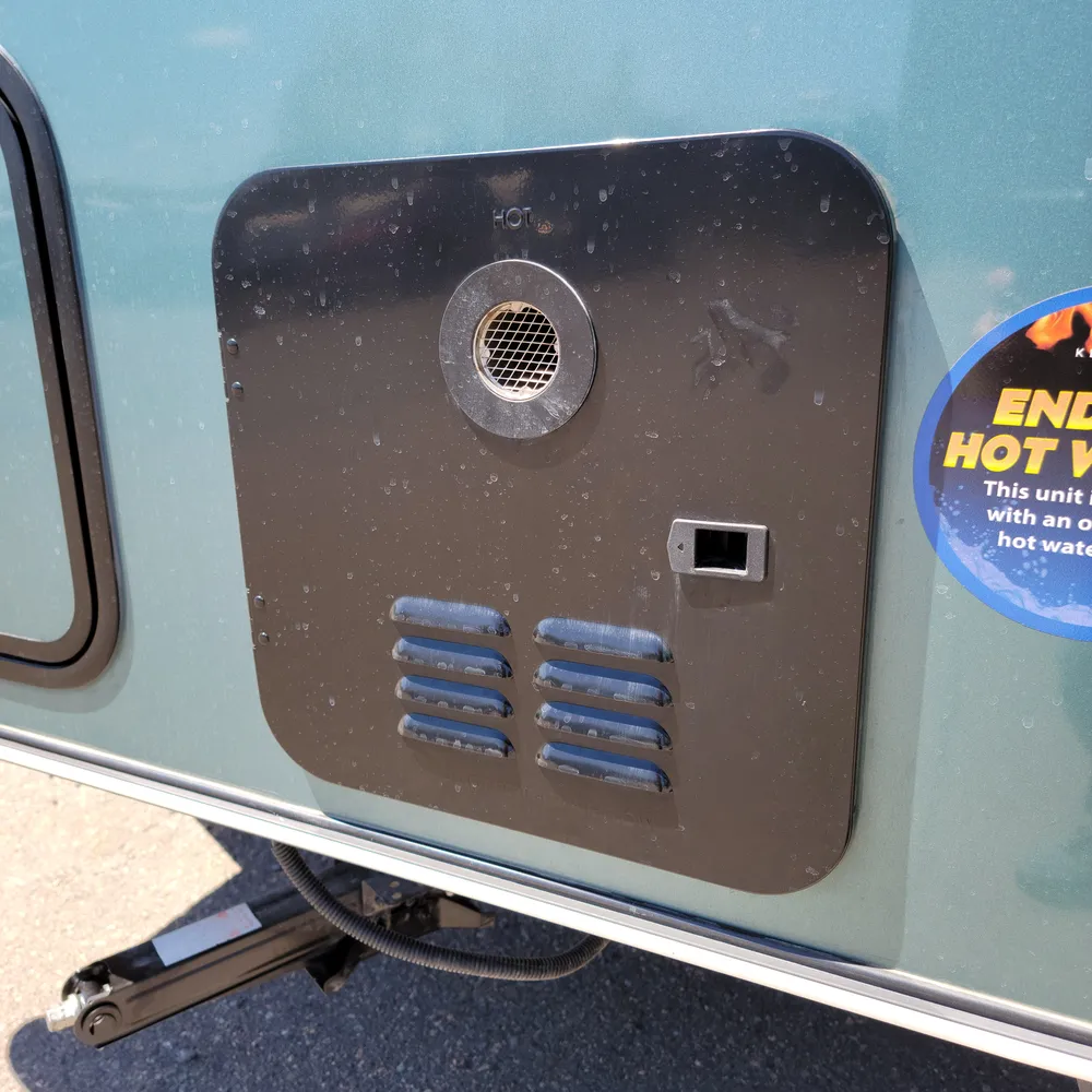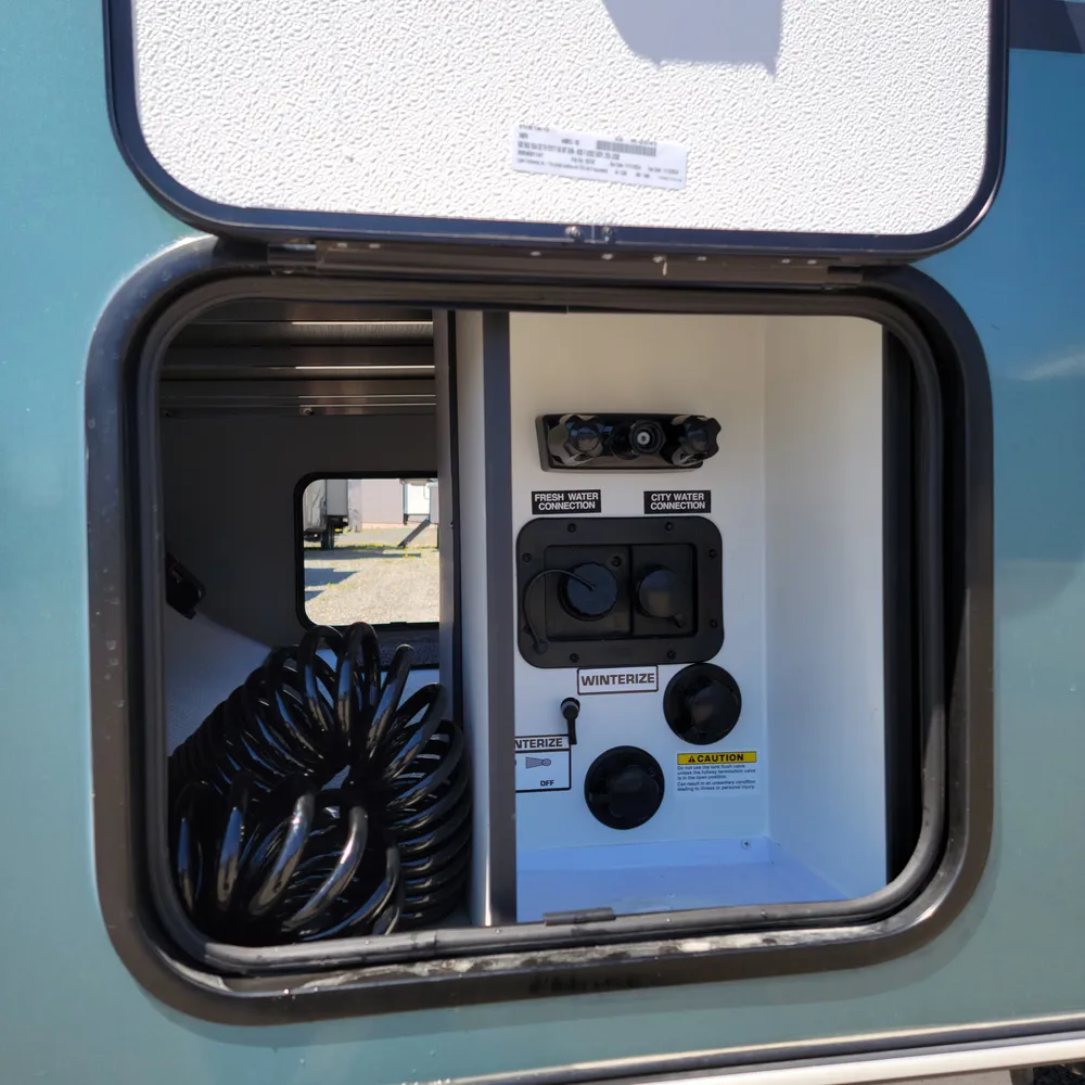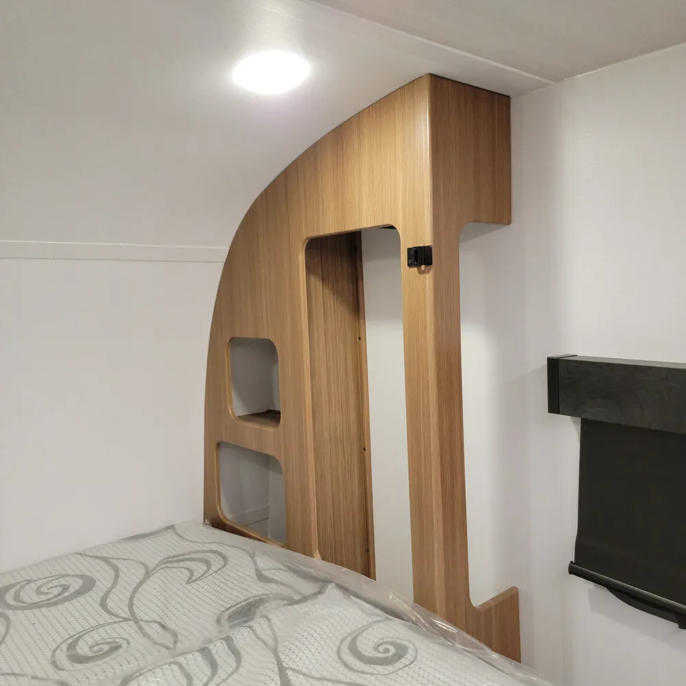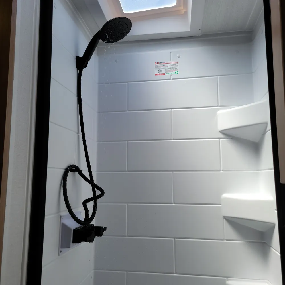 A Suburban tankless water heater, 13,500 BTU air conditioner, 20,000 BTU furnace, and 11′ power awning round out the Reign 18RB. The automotive-finished aluminum exterior, composite floor, and walkable roof are built to handle the camping season without fuss.