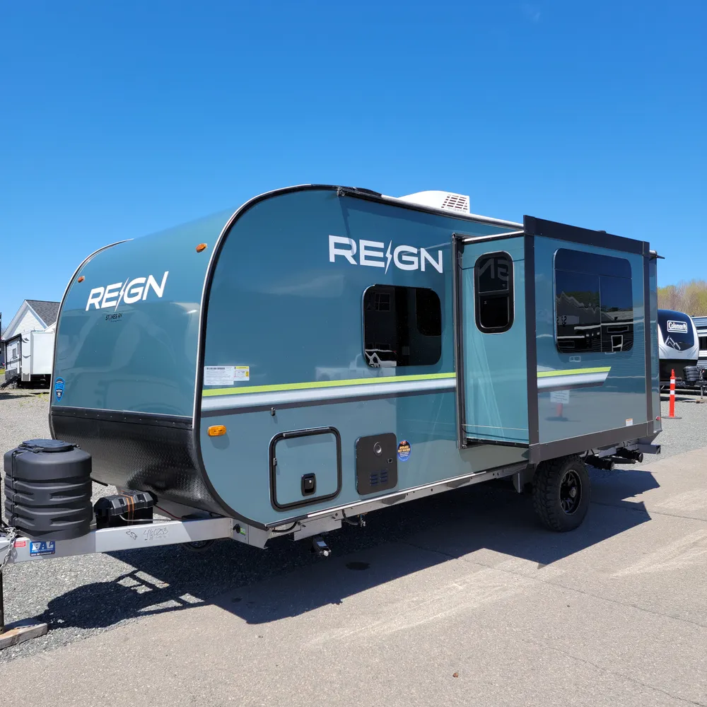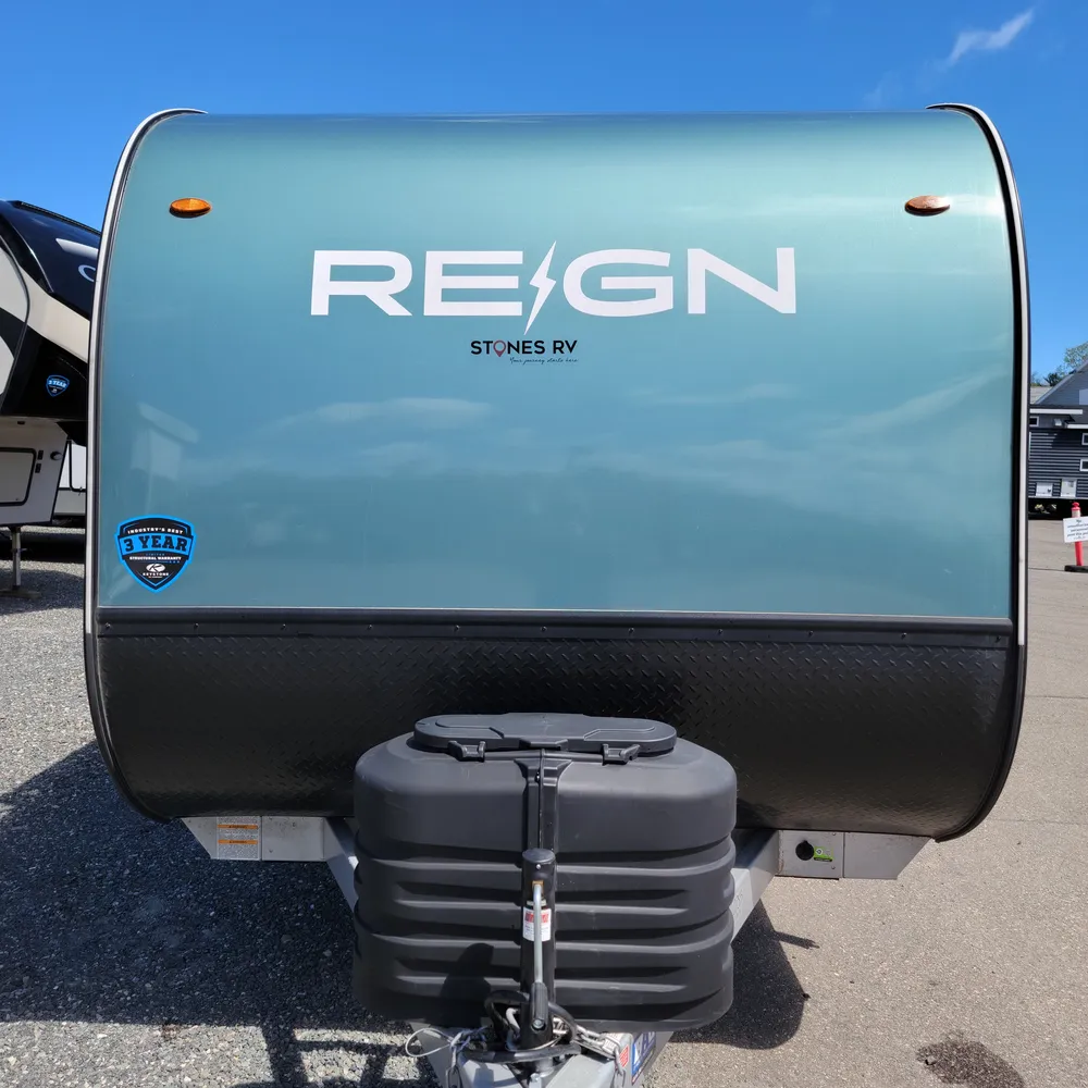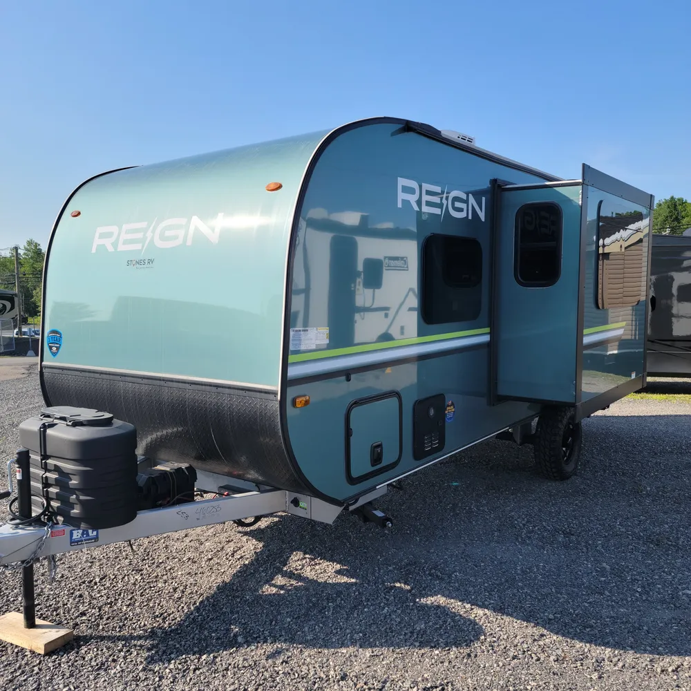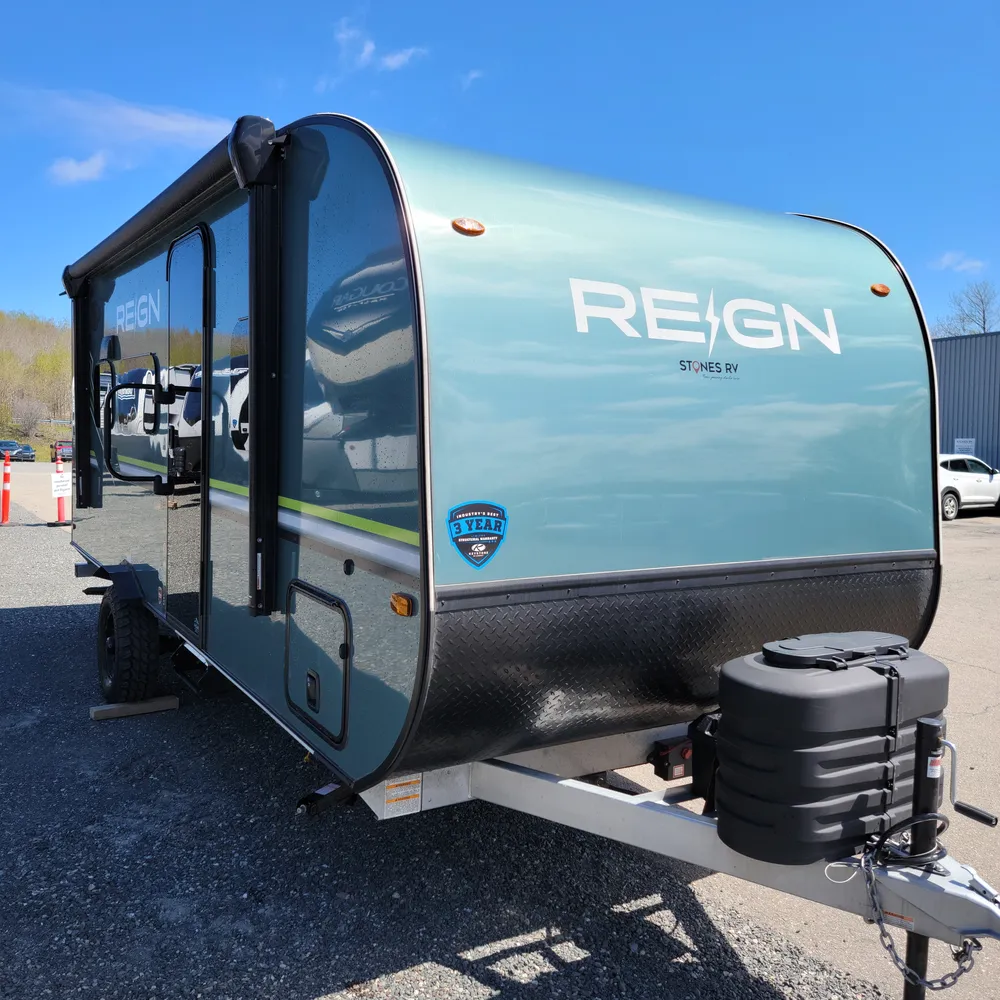 In stock at Stone’s RV, the 2025 Keystone Reign 18RB is a 22’8″ single-axle travel trailer that sleeps 3. With a dry weight of 3,995 lbs, the Reign 18RB tows behind most vehicles and gets into campgrounds that bigger trailers can’t.