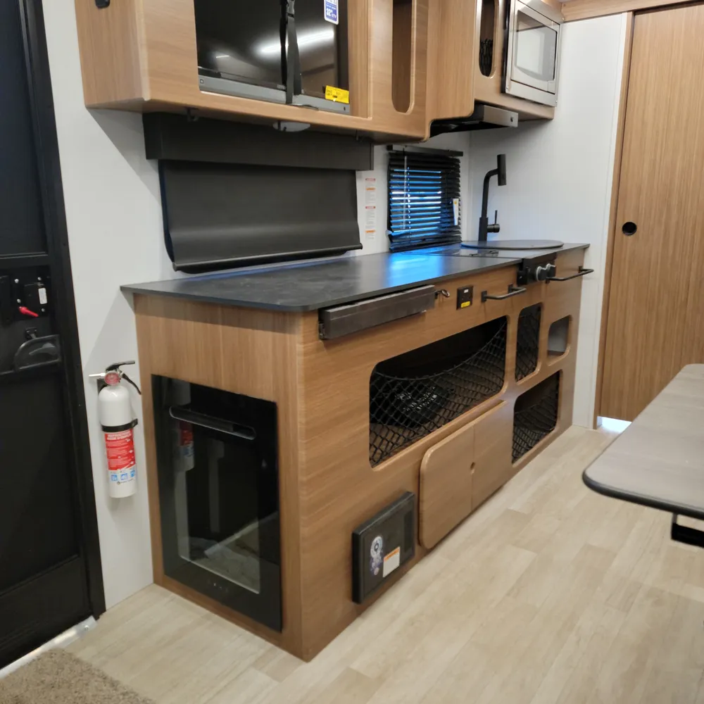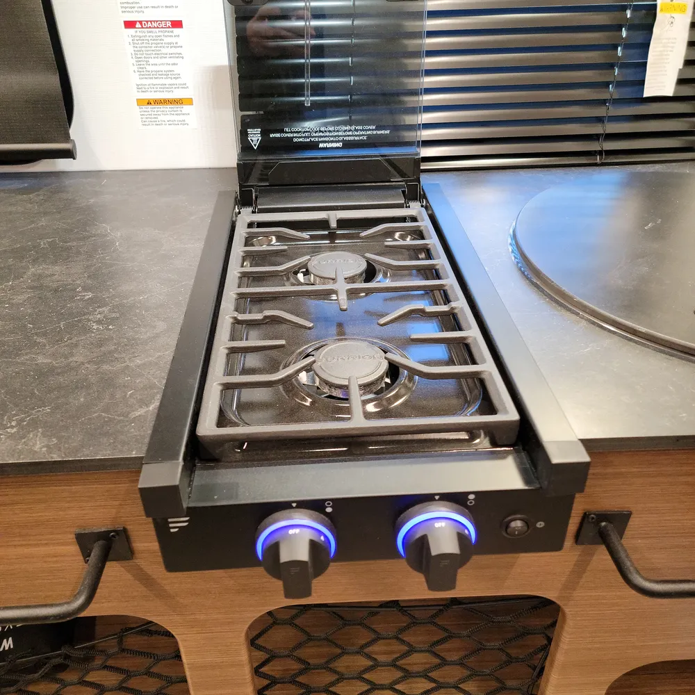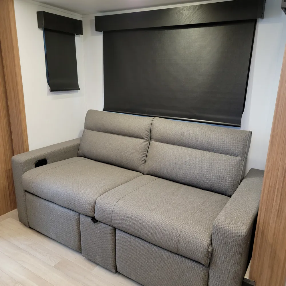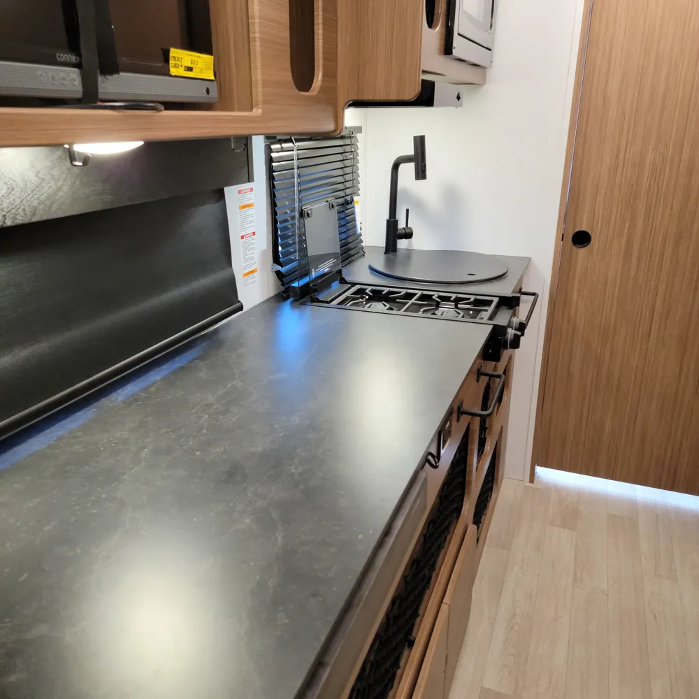 The front Murphy bed converts from a sofa to a bed, keeping the living space open during the day. The slideout holds theater seating and a dinette, giving you room to spread out for meals or to relax at the end of the day. The centre kitchen has a two-burner flush-mount gas range with glass cover, air fryer/convection microwave, solid surface countertops with a flip-up extension, and an 11 cu. ft. 12V refrigerator.