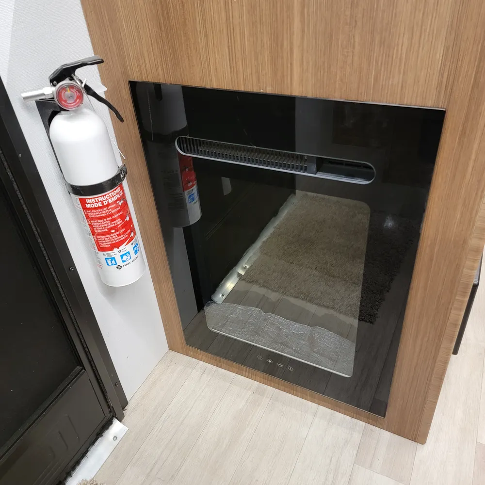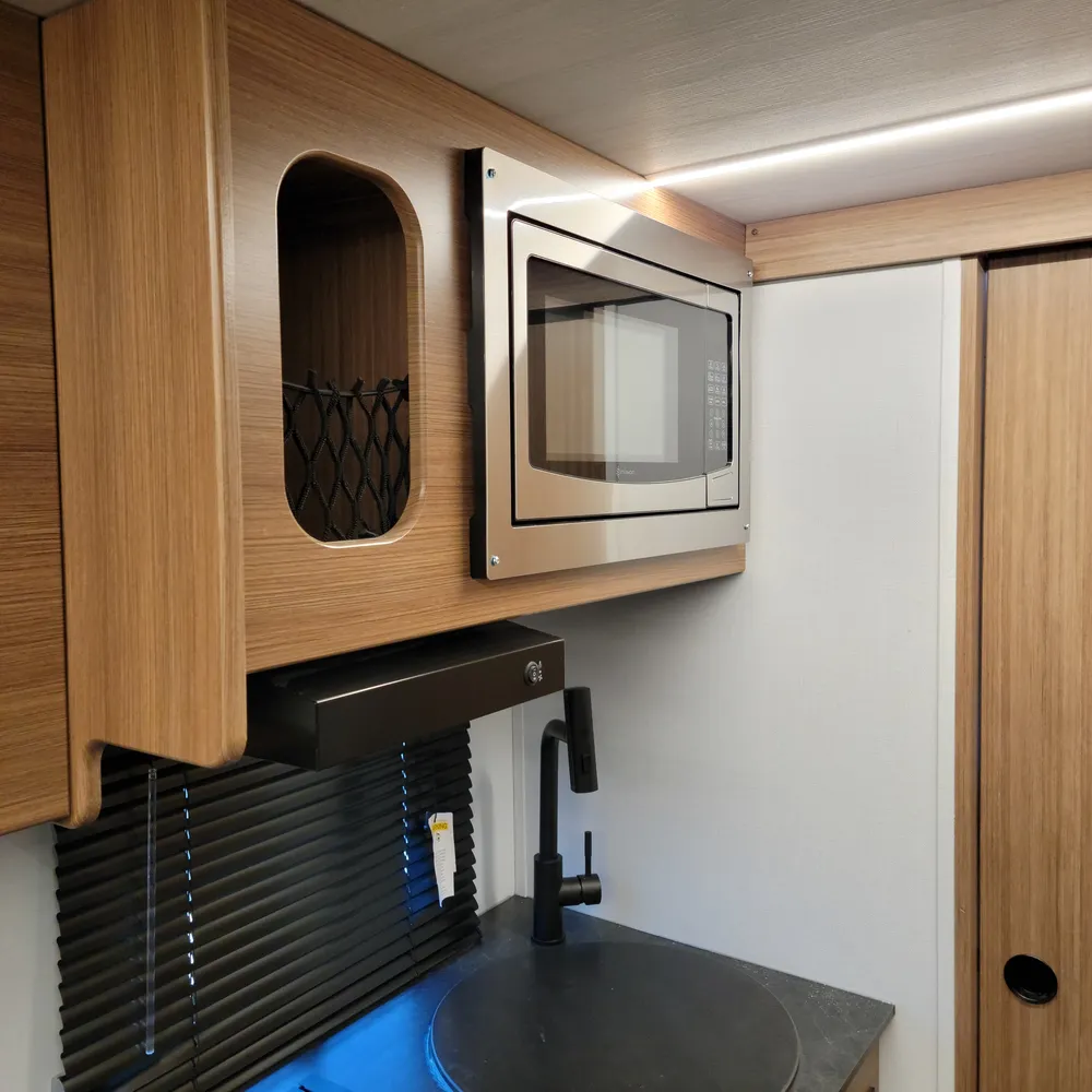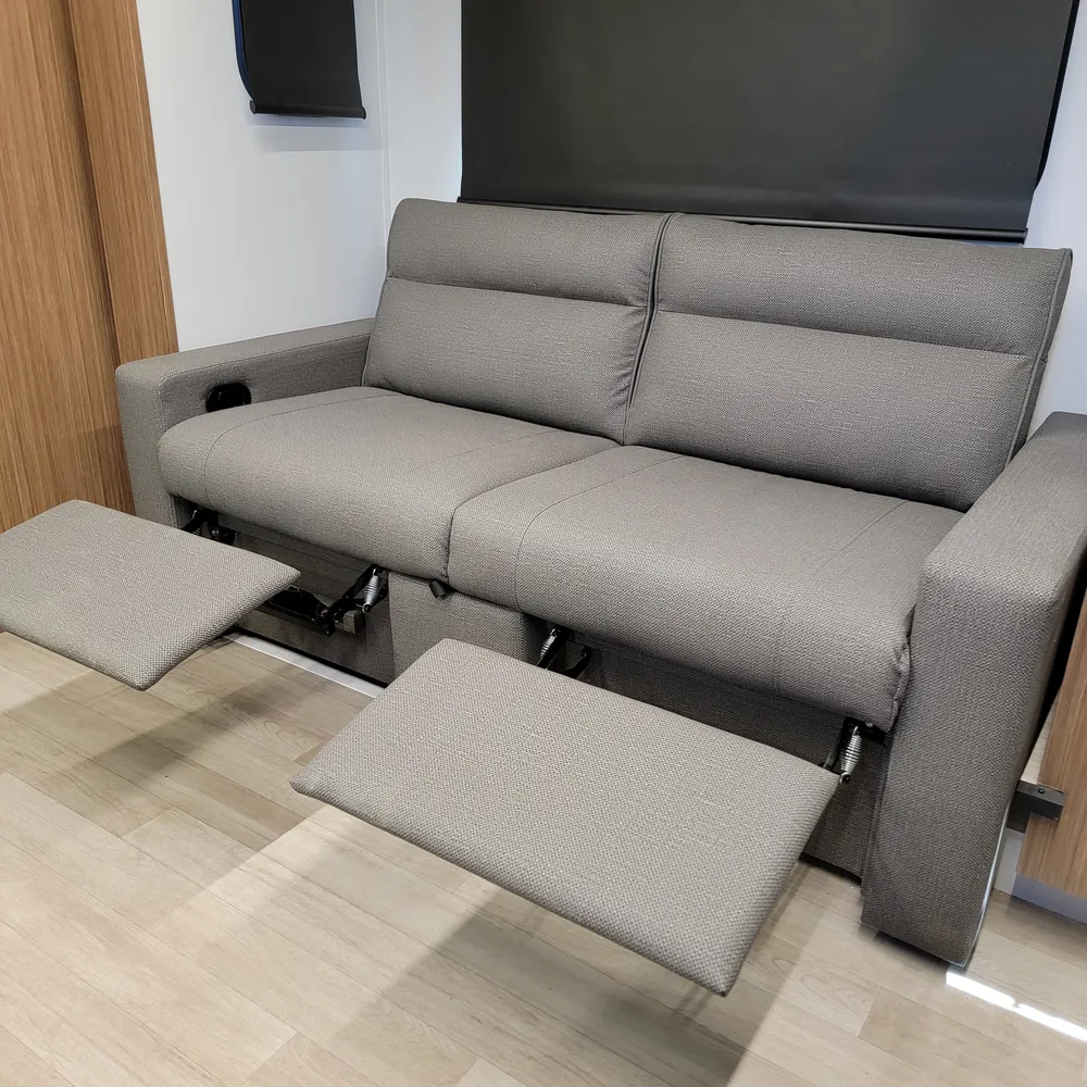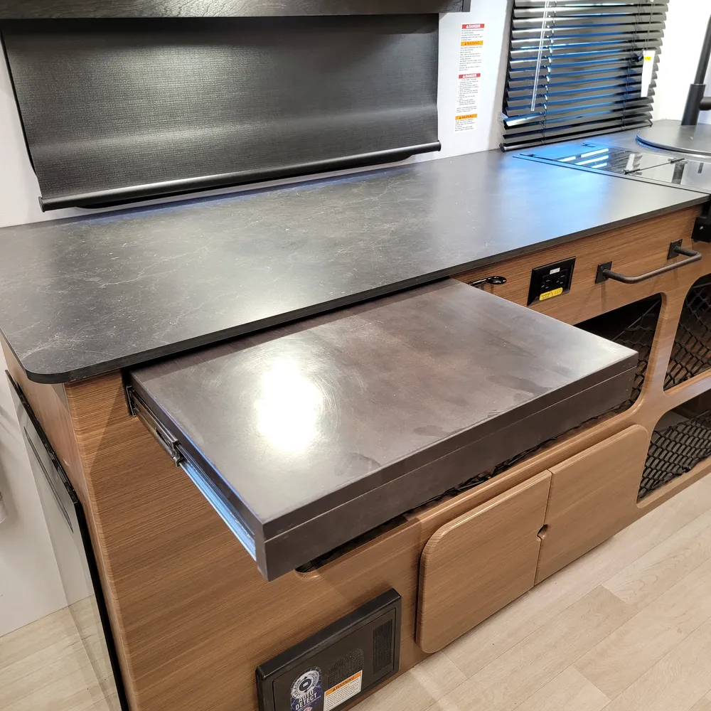 The front Murphy bed converts from a sofa to a bed, keeping the living space open during the day. The slideout holds theater seating and a dinette, giving you room to spread out for meals or to relax at the end of the day. The centre kitchen has a two-burner flush-mount gas range with glass cover, air fryer/convection microwave, solid surface countertops with a flip-up extension, and an 11 cu. ft. 12V refrigerator.