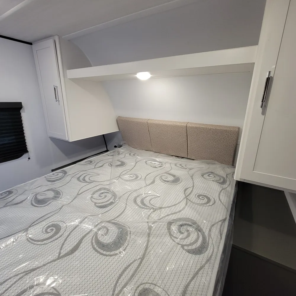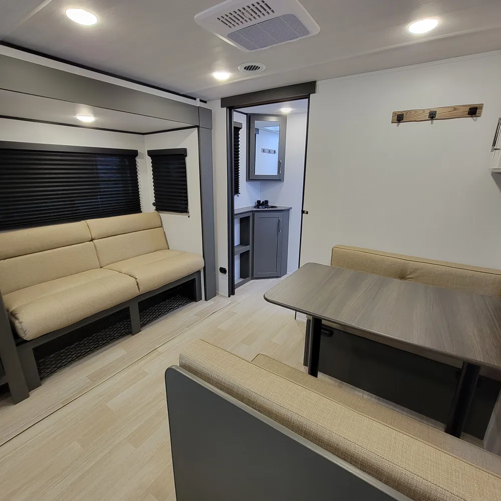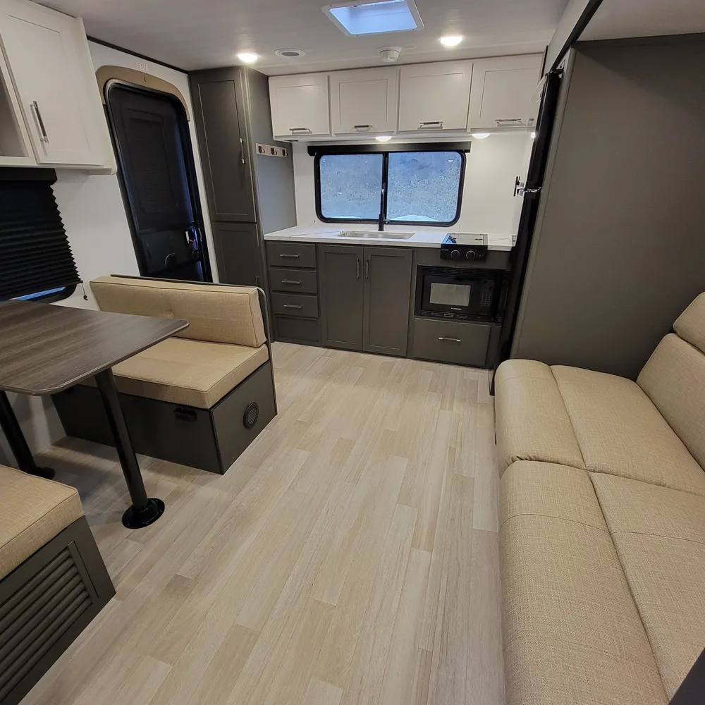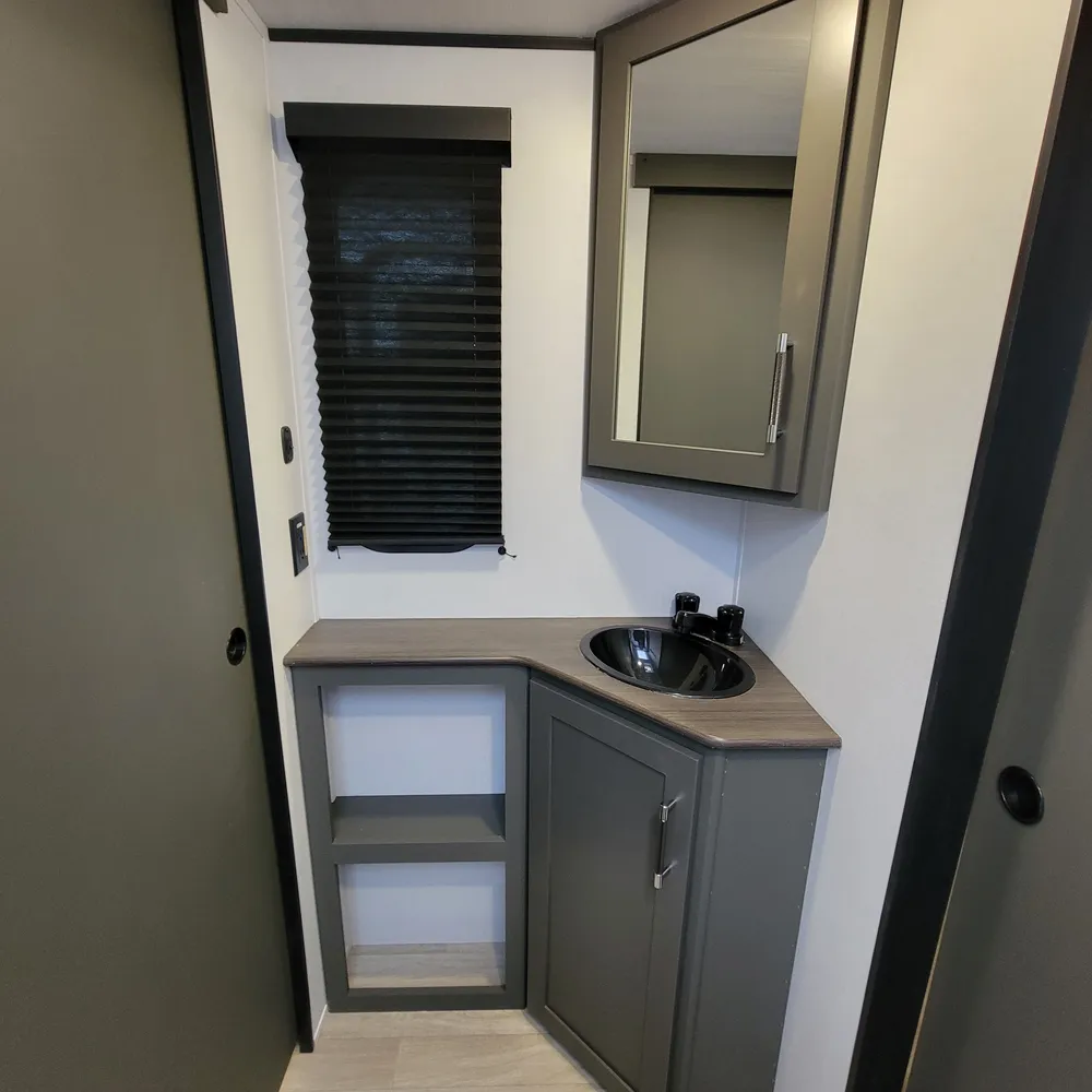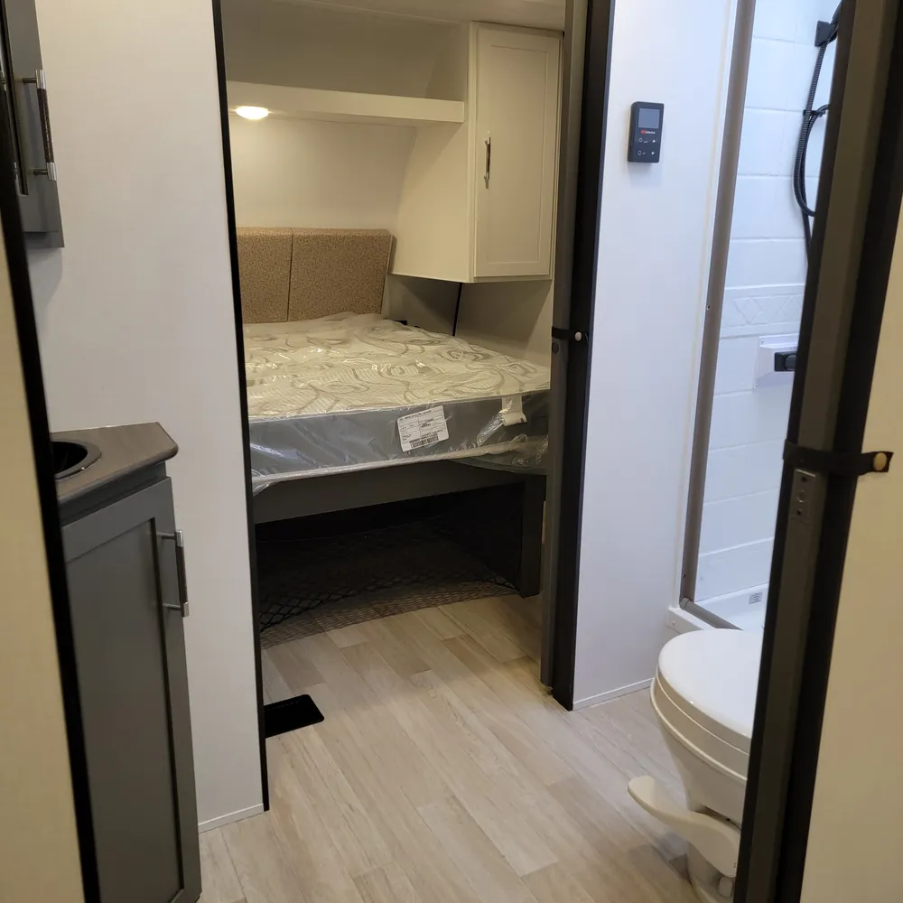 The walk-through bathroom is centrally located between the bedroom and living area, providing convenient access from both ends of the RV. The compact design makes it ideal for both experienced RVers and first-time buyers.
