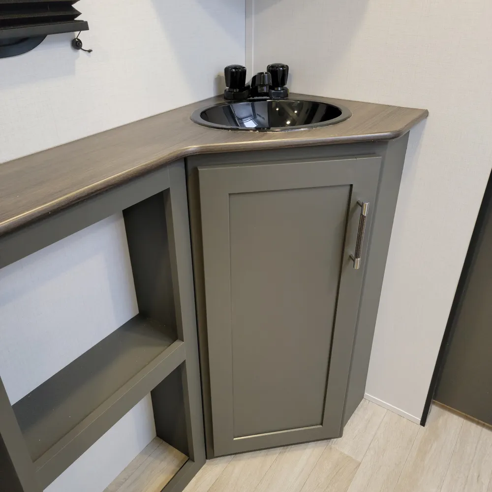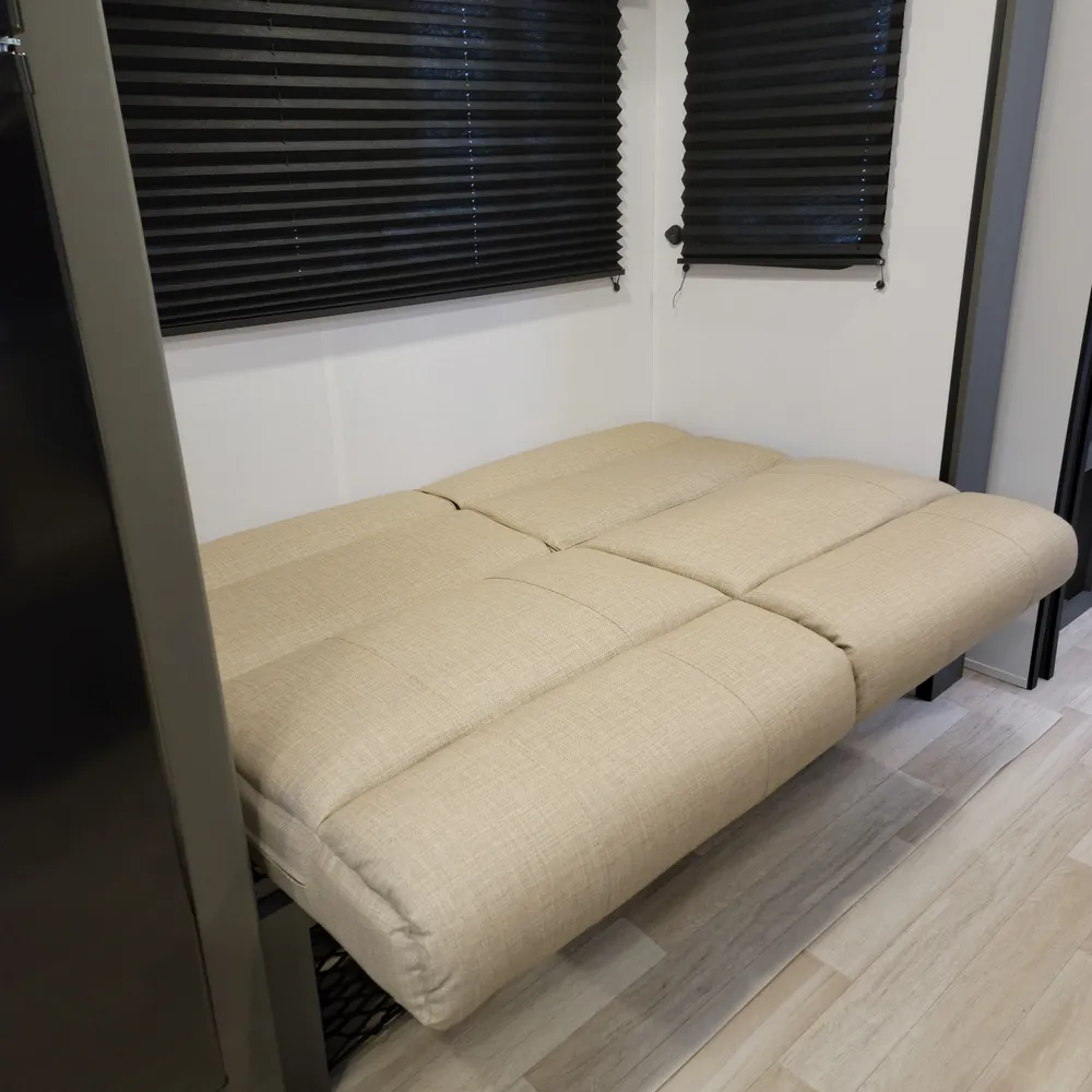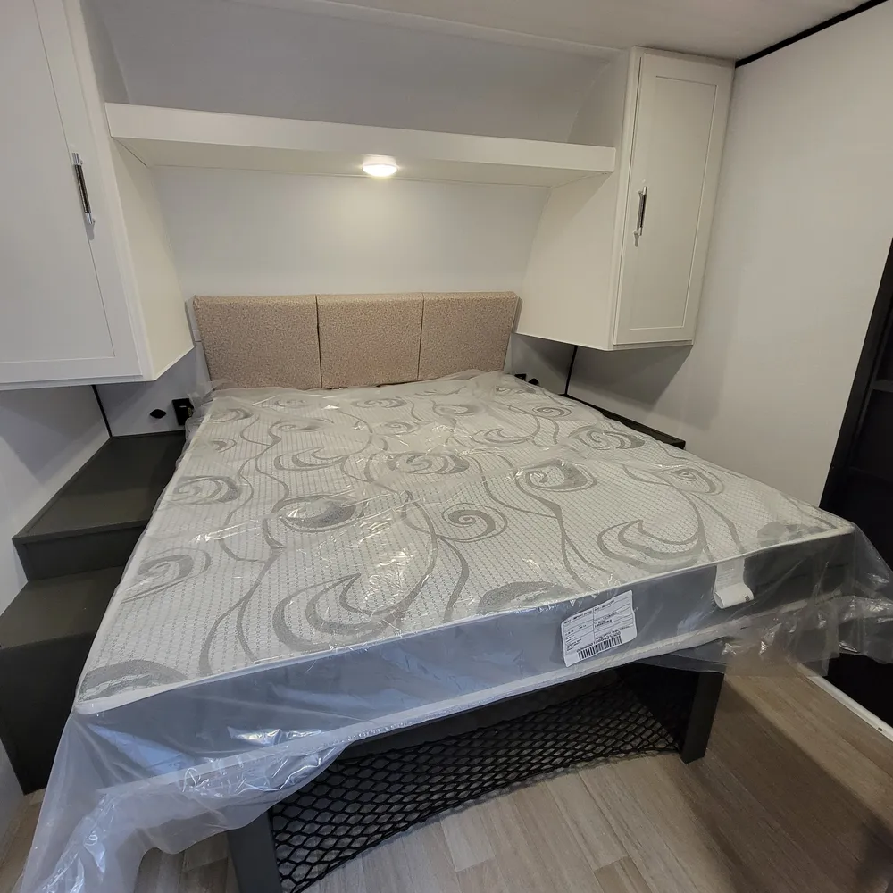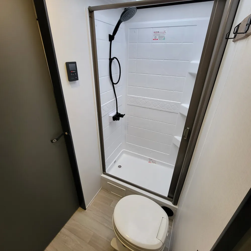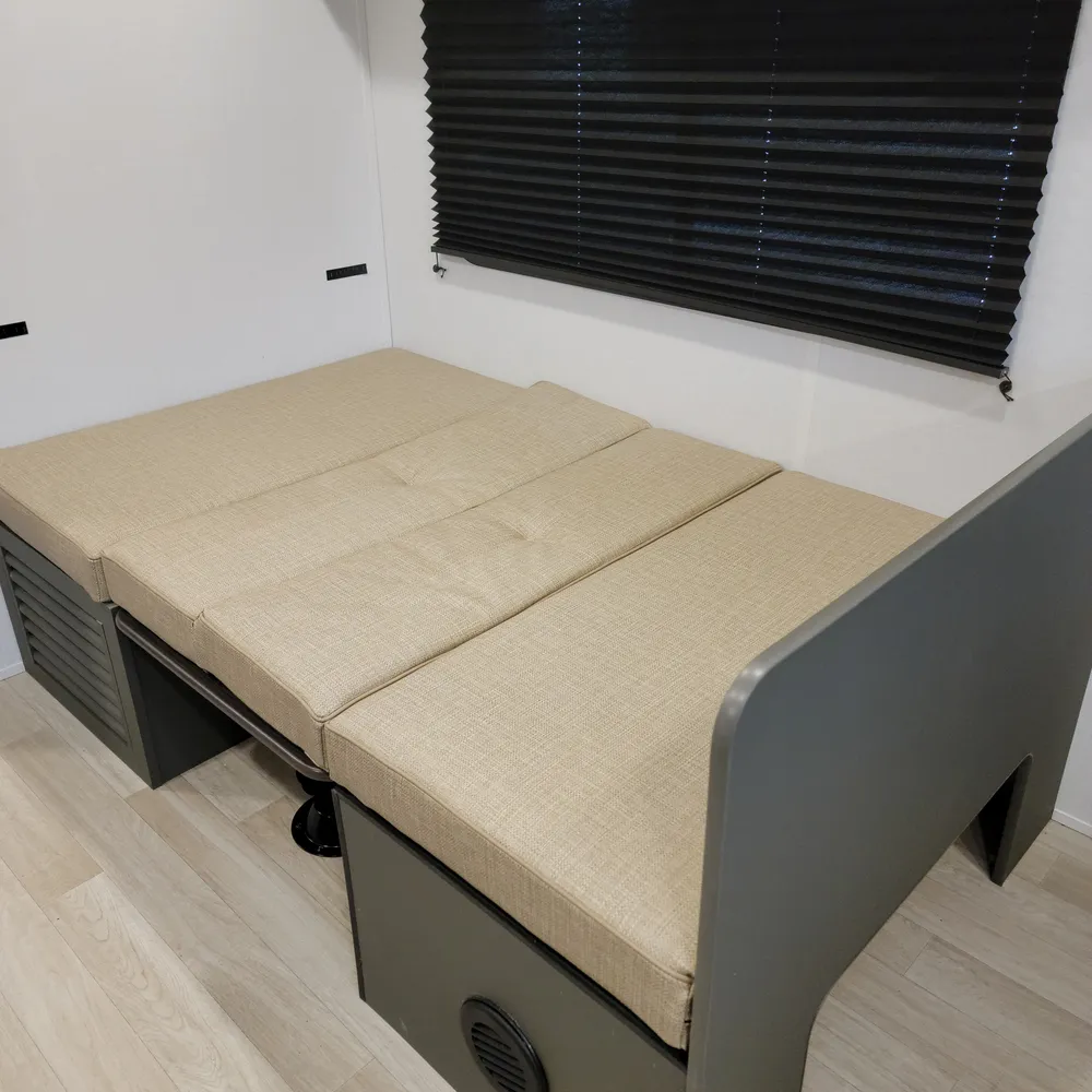 The walk-through bathroom is centrally located between the bedroom and living area, providing convenient access from both ends of the RV. The compact design makes it ideal for both experienced RVers and first-time buyers.