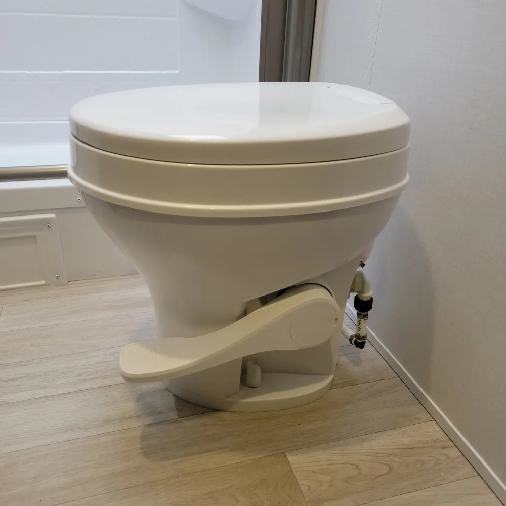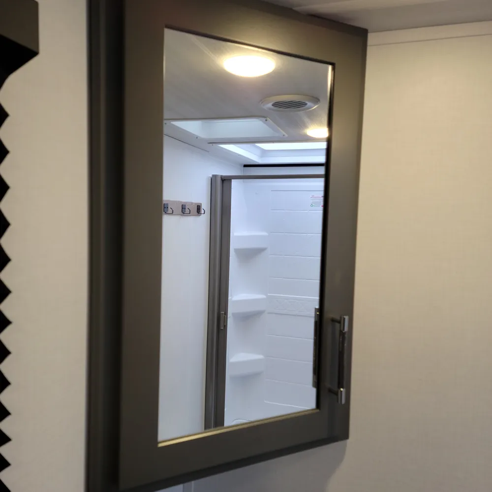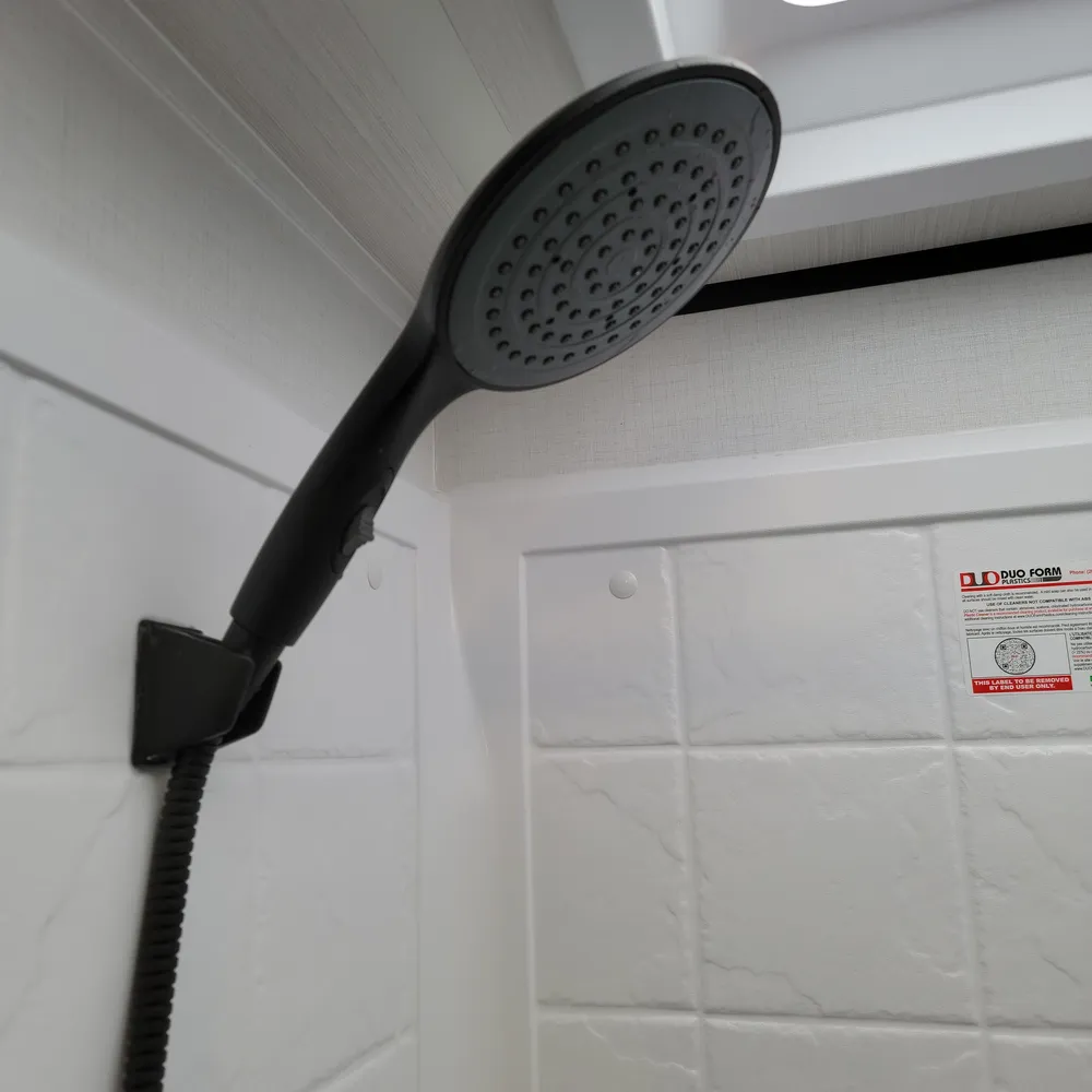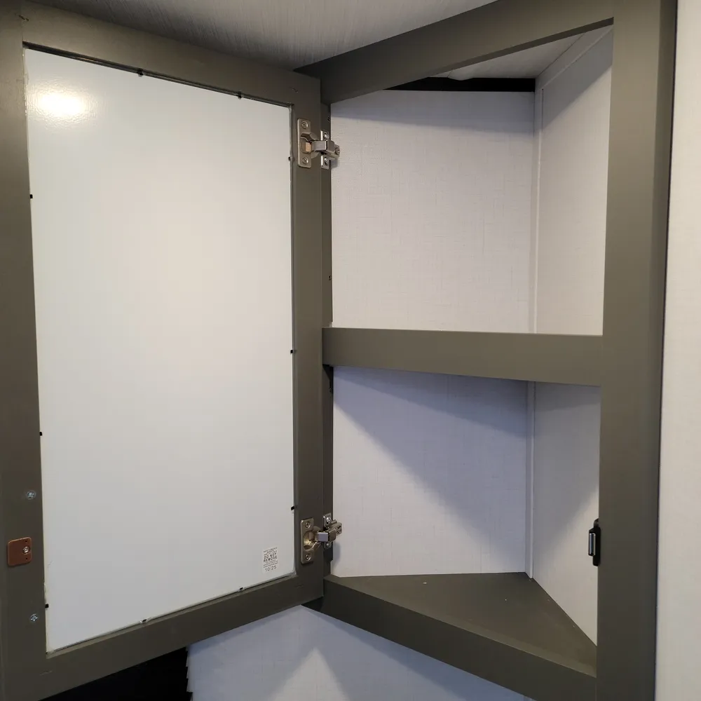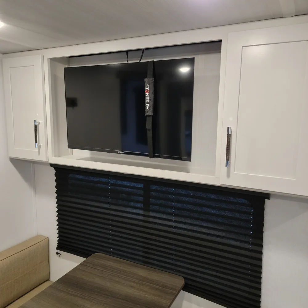The walk-through bathroom is centrally located between the bedroom and living area, providing convenient access from both ends of the RV. The compact design makes it ideal for both experienced RVers and first-time buyers.