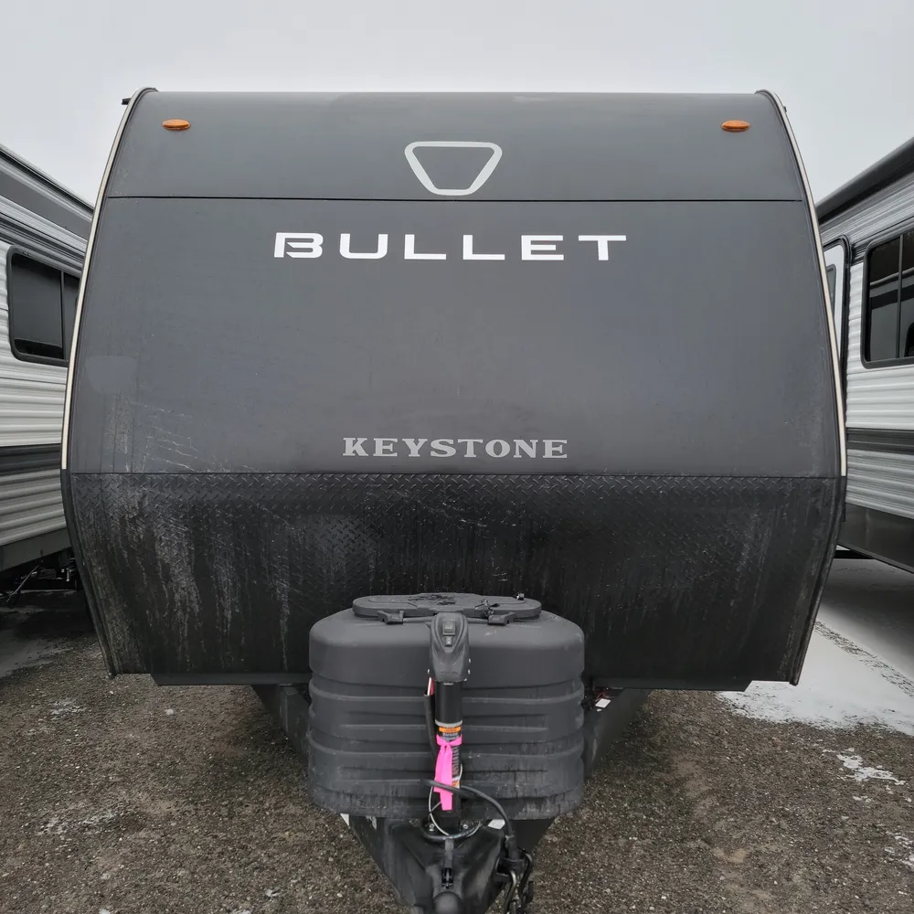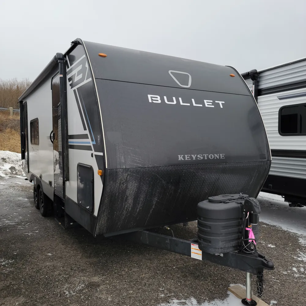 The 2026 Bullet Classic 21RKC is a 25-foot travel trailer featuring a rear kitchen layout and dual entry doors, sleeping up to 4 people. This lightweight travel trailer weighs just 4,635 lbs dry, making it an excellent choice for easy towing around the Maritimes.