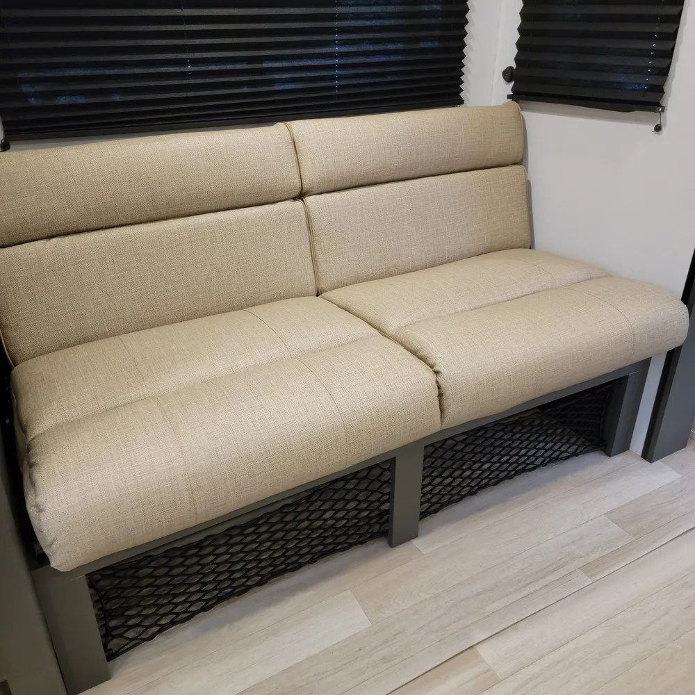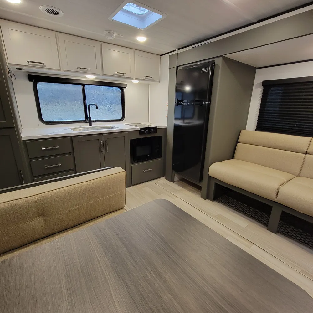 The 21RKC offers a space-efficient layout with a front bedroom featuring a queen-sized bed and a single slideout in the living area. The rear kitchen design provides a two-burner glass-top cooktop and 8 cubic foot 12V refrigerator. The living & dining area includes a booth dinette and jackknife sofa that converts to additional sleeping space.