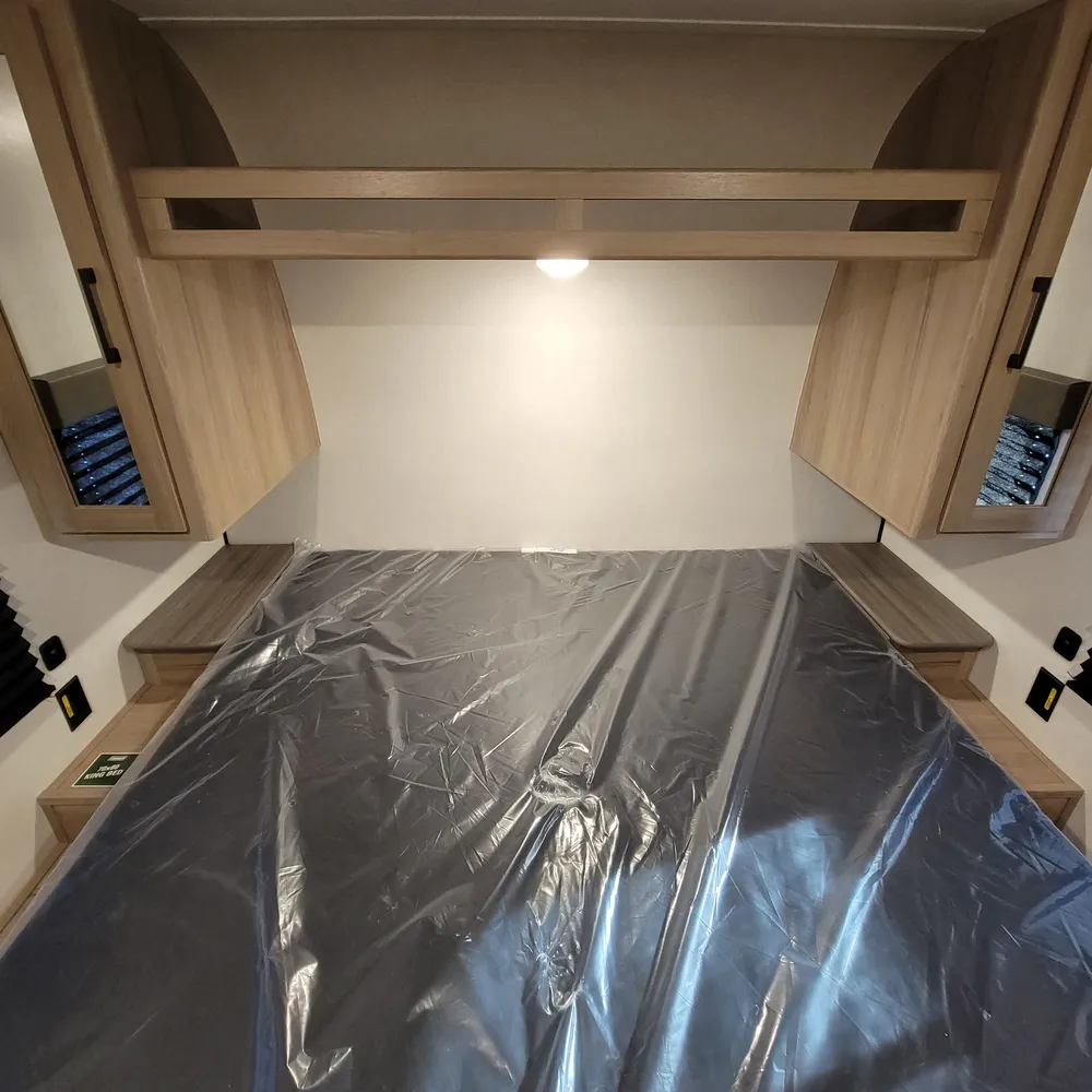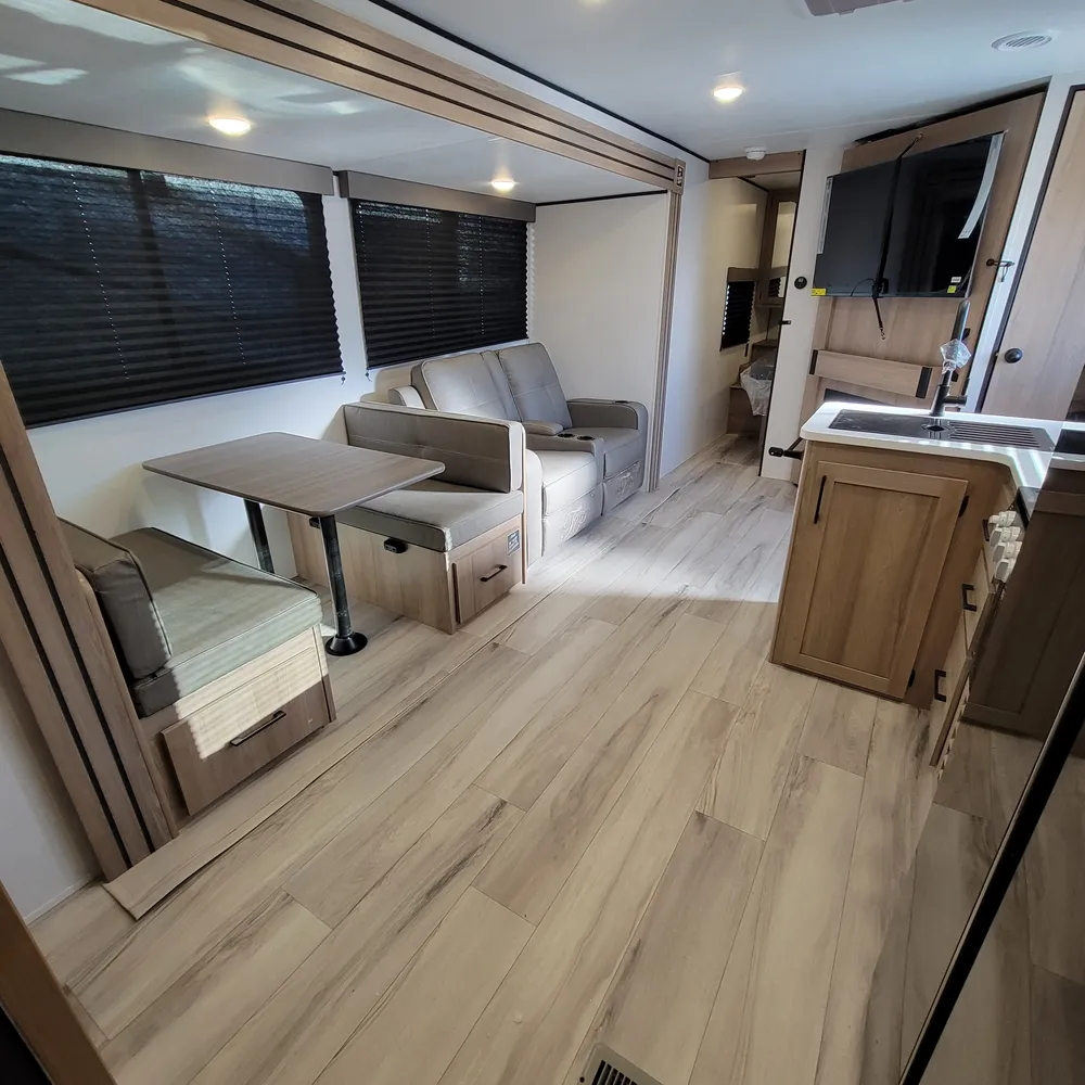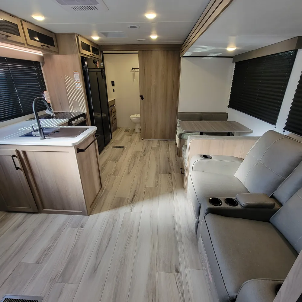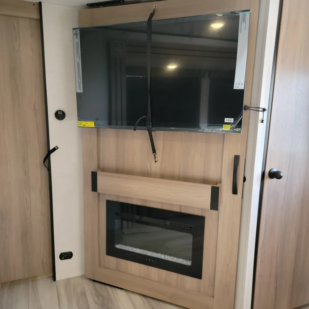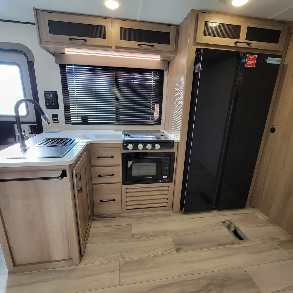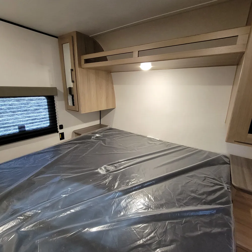 The 25RBS emphasizes livability with an 82-inch interior ceiling height and an expansive rear bathroom featuring an oversized 30″x40″ shower. The living area offers theater seating, an electric fireplace, and a full L-shaped kitchen with solid surface countertops and an air fryer/convection microwave. Outside, the 16-foot power awning and large pass-through storage offer great utility for your local adventures, making this a dependable choice for enjoying Nova Scotia’s parks and campgrounds.