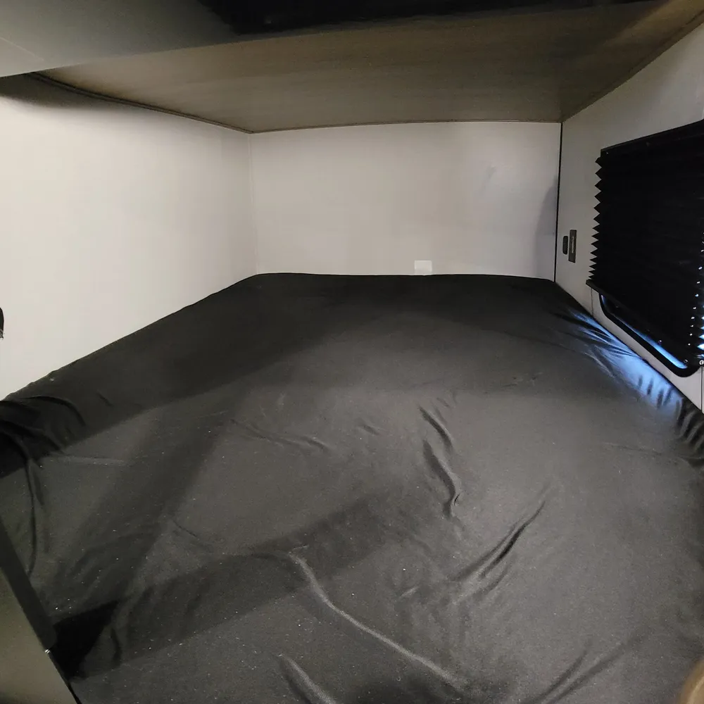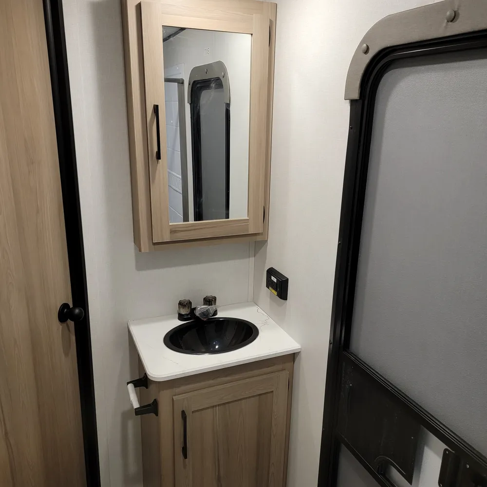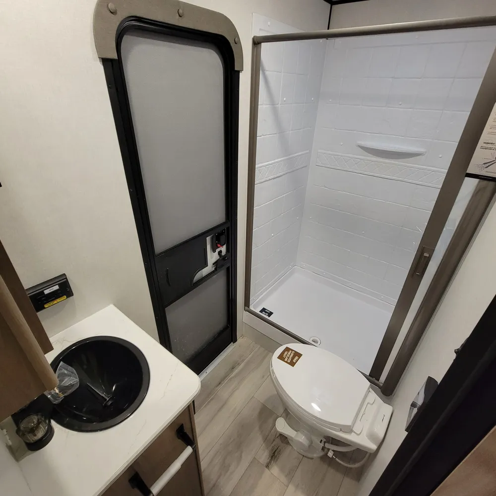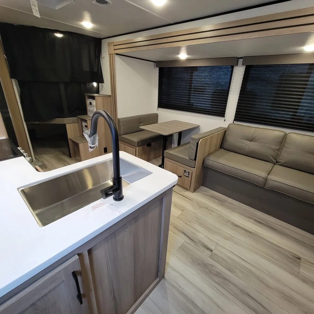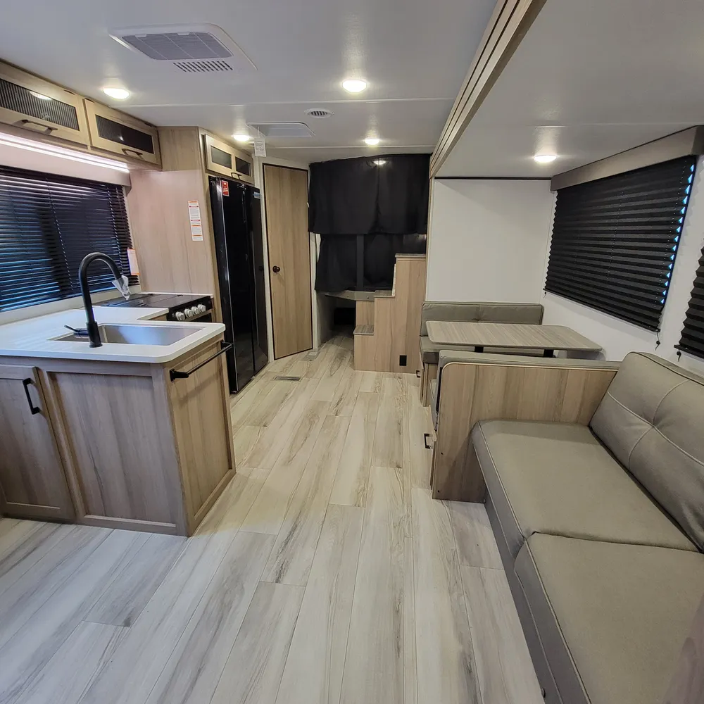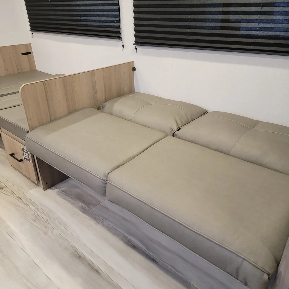 The 28BHS floor plan puts the master bedroom up front with a king bed, while double bunks in the rear give kids or guests their own space. The single slideout opens up the living area, housing both the sofa and dinette for comfortable family meals and relaxation. The full bathroom includes dual entry doors for convenience, and the 82-inch ceiling height throughout makes the space feel open and comfortable for everyone.