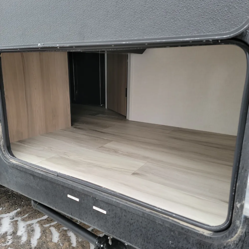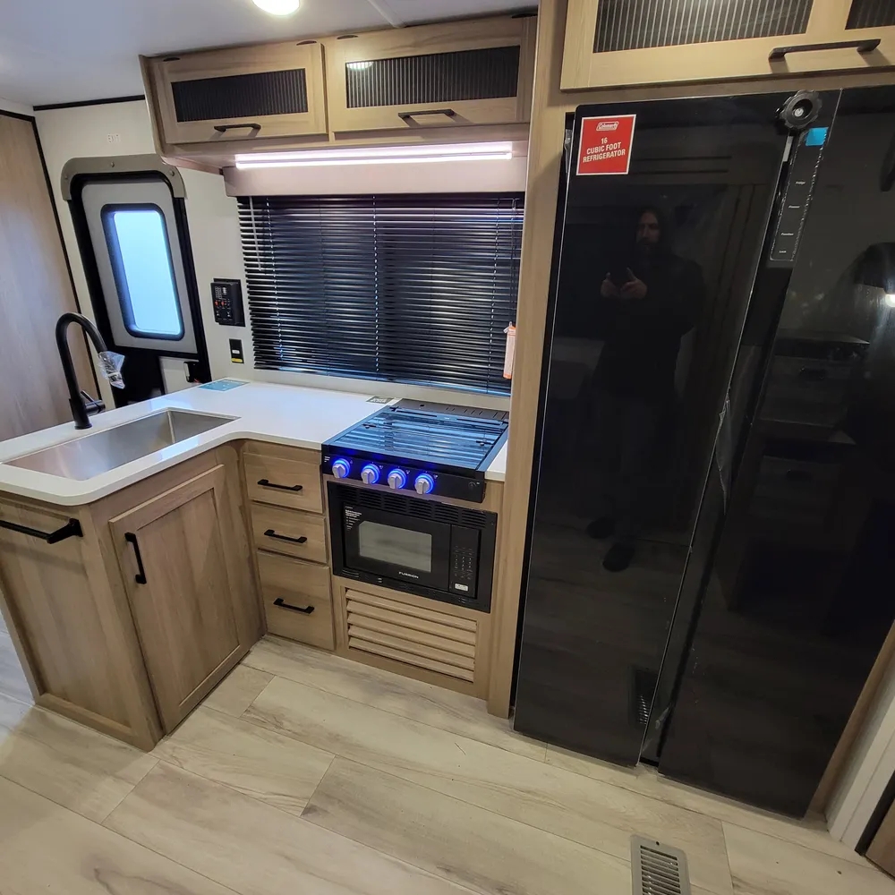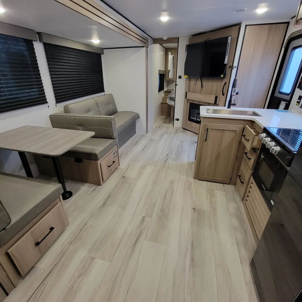 The kitchen comes equipped with a 16-cubic-foot 12V refrigerator, three-burner range, and convection microwave with air fryer. A 50-inch TV sits above the fireplace with hidden storage shelves, and a walk-in pantry. Outside, the 21-foot power awning provides shade, and a 2.6-cubic-foot outdoor refrigerator keeps drinks cold at your campsite.