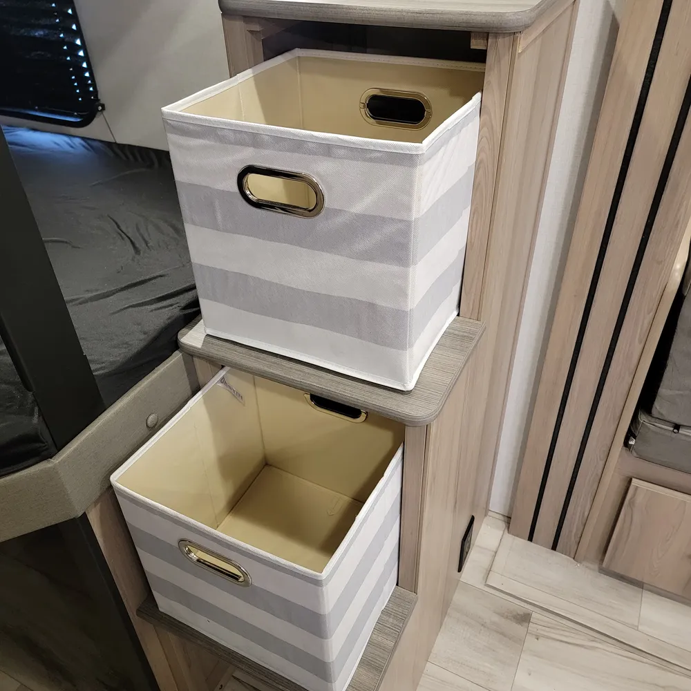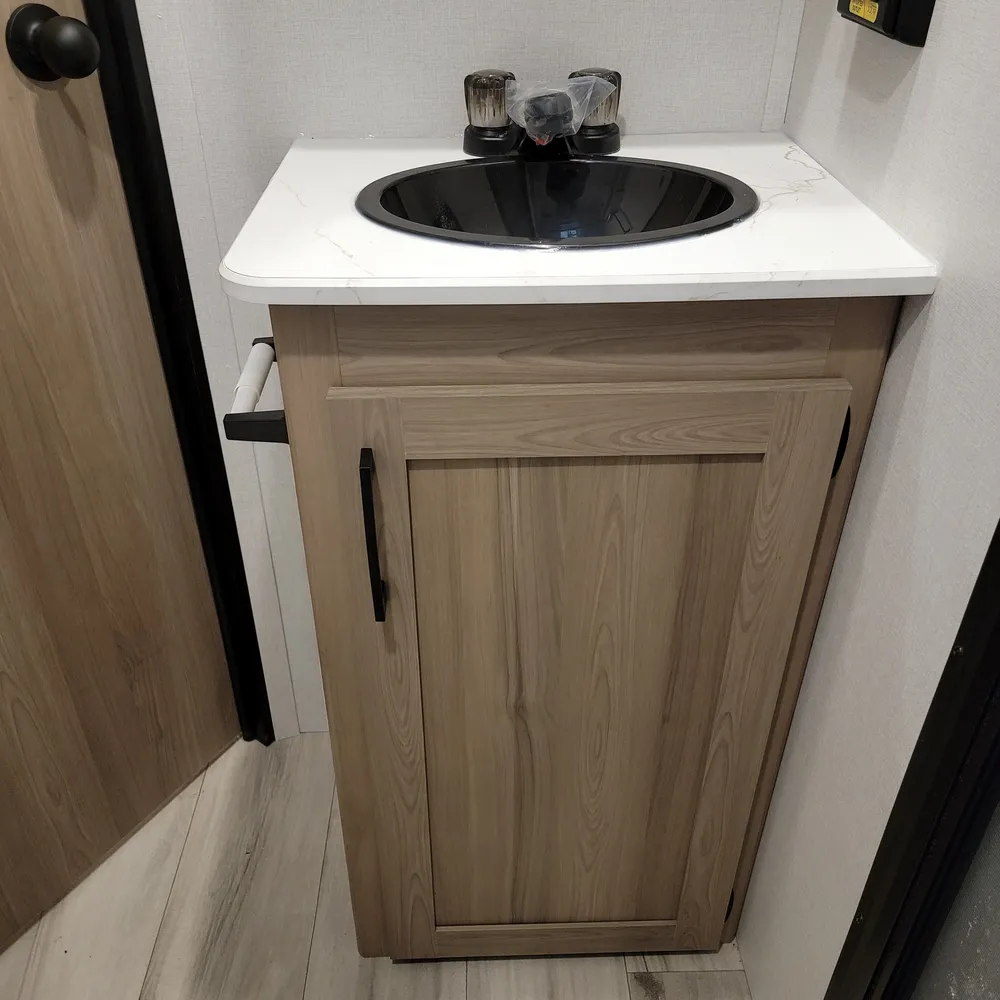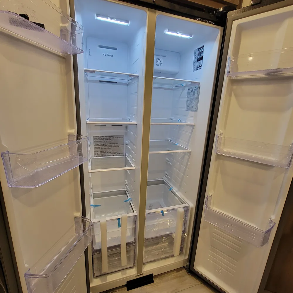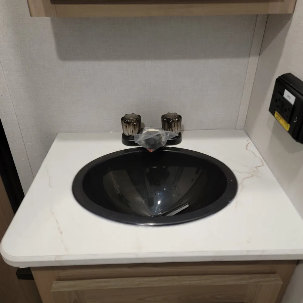 The kitchen comes equipped with a 16-cubic-foot 12V refrigerator, three-burner range, and convection microwave with air fryer. A 50-inch TV sits above the fireplace with hidden storage shelves, and a walk-in pantry. Outside, the 21-foot power awning provides shade, and a 2.6-cubic-foot outdoor refrigerator keeps drinks cold at your campsite.