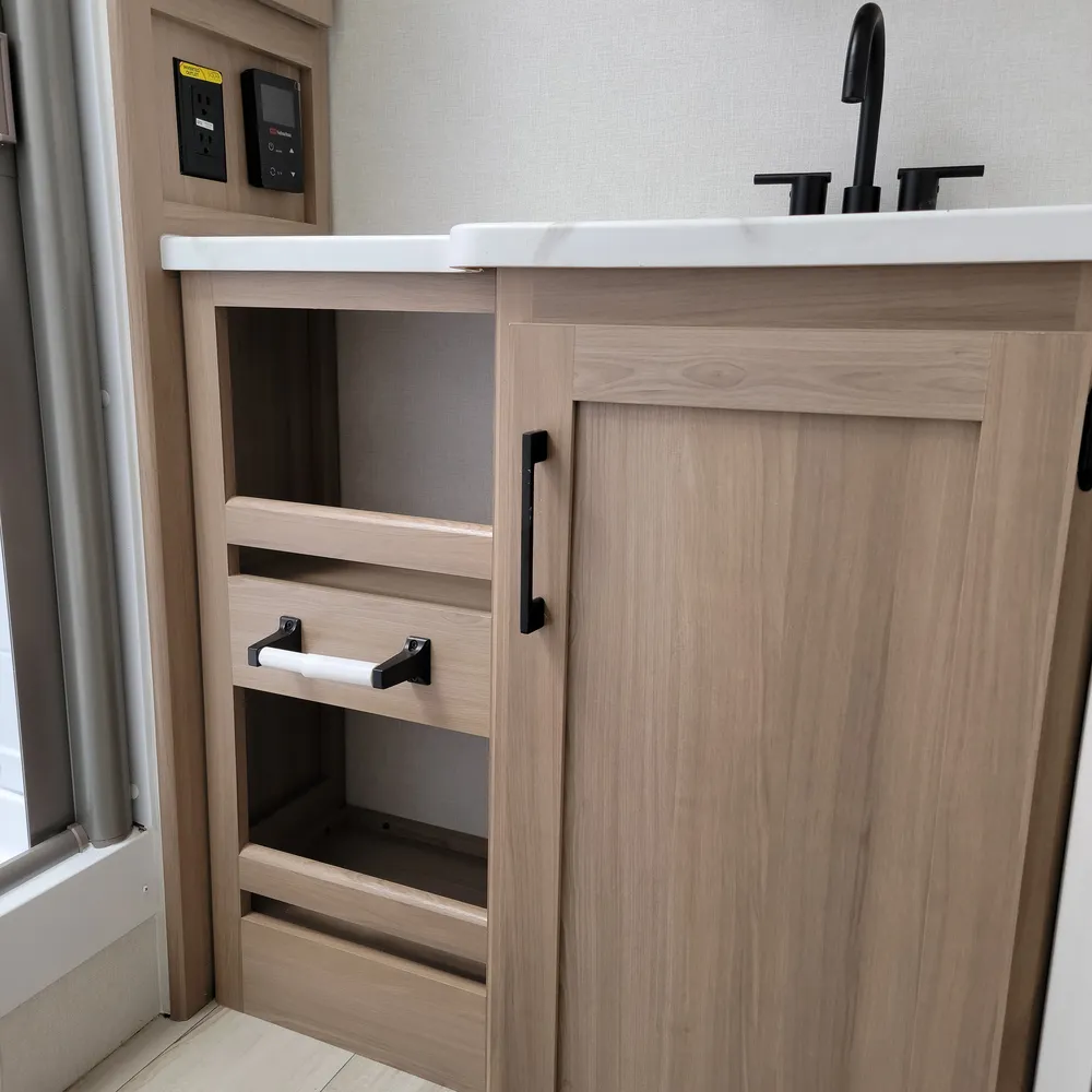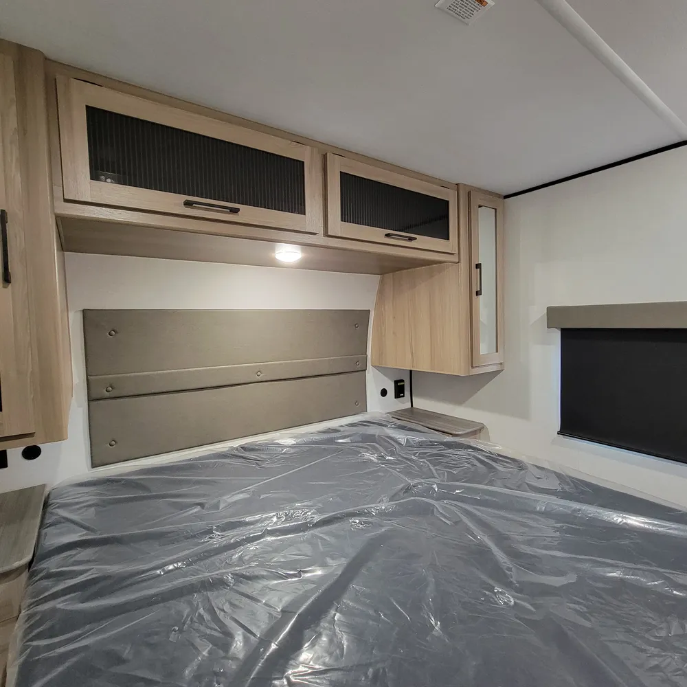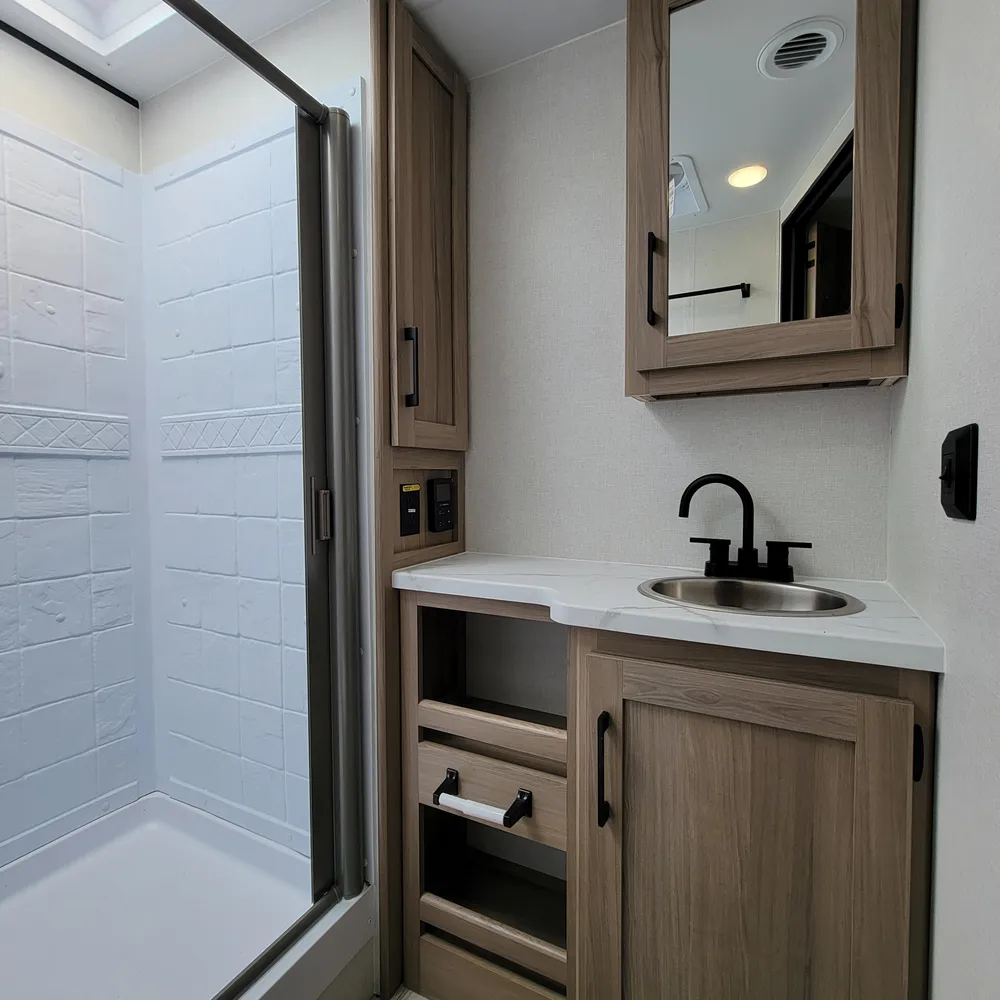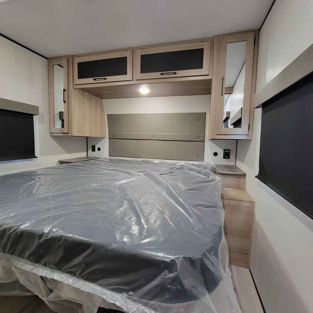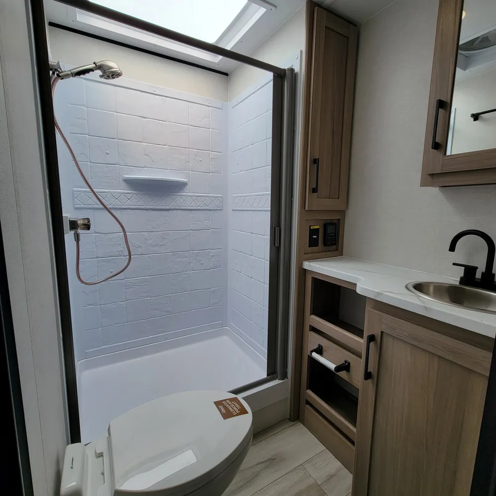 The front bedroom features a king bed with versatile underbed storage, nightstands with hidden storage, and wardrobe for hanging clothes. The bathroom provides a spacious 30″ x 40″ shower with retractable door, elongated porcelain foot-flush toilet, upgraded Oxygenics Fury showerhead, and extra-tall medicine cabinet. The 82-inch interior height and 72-inch slide height create an open, residential feel throughout.