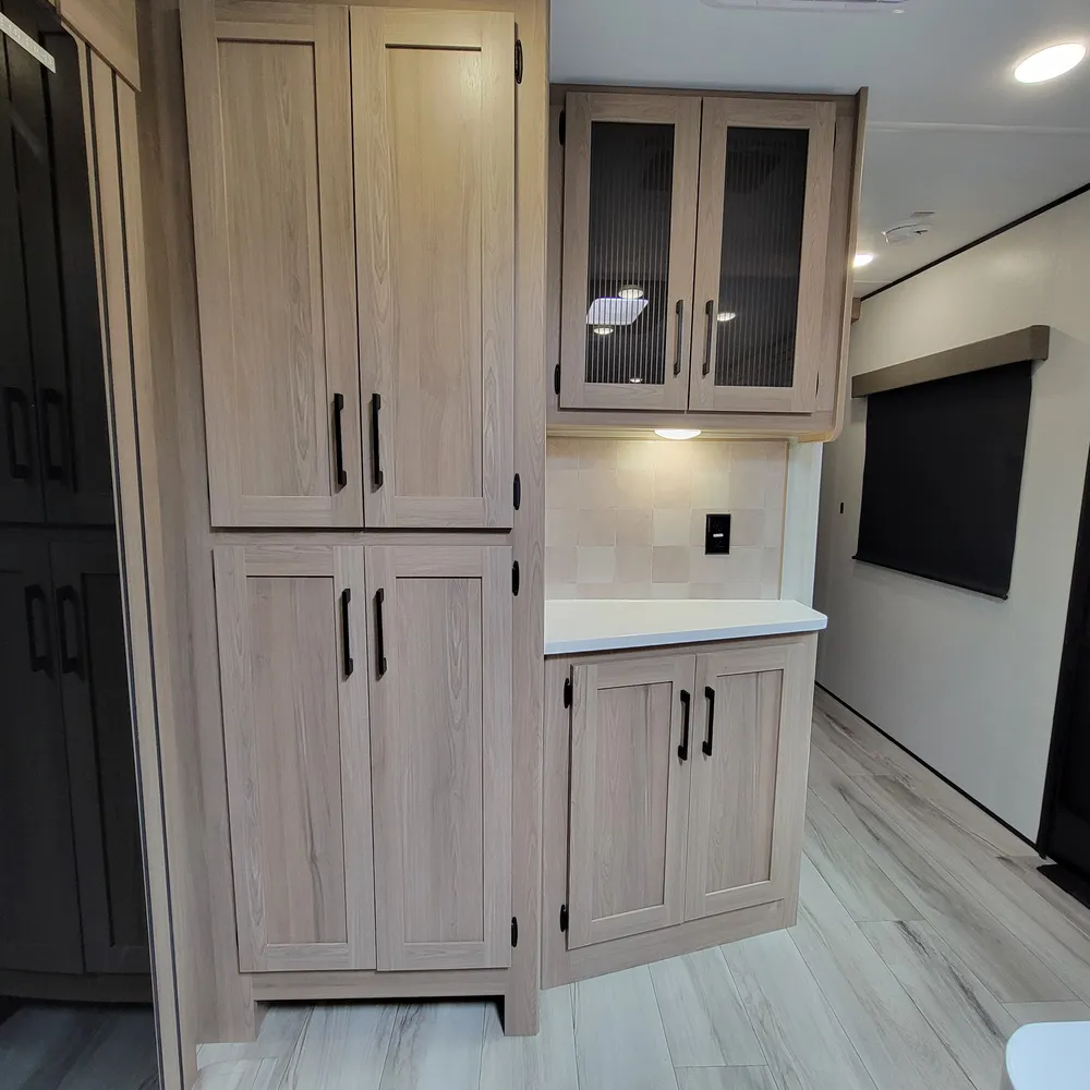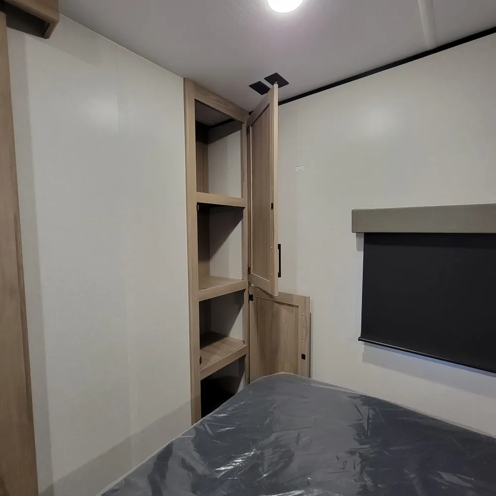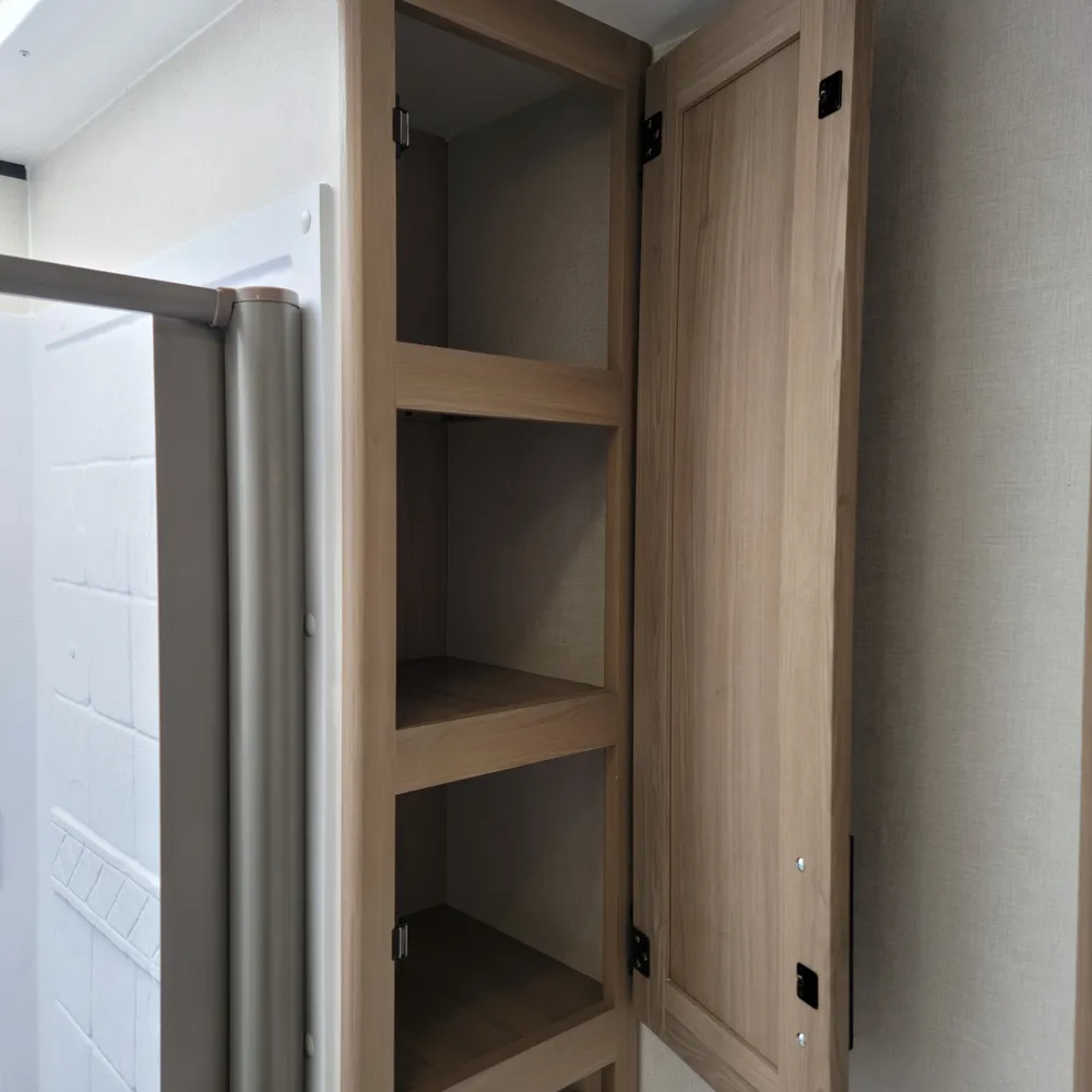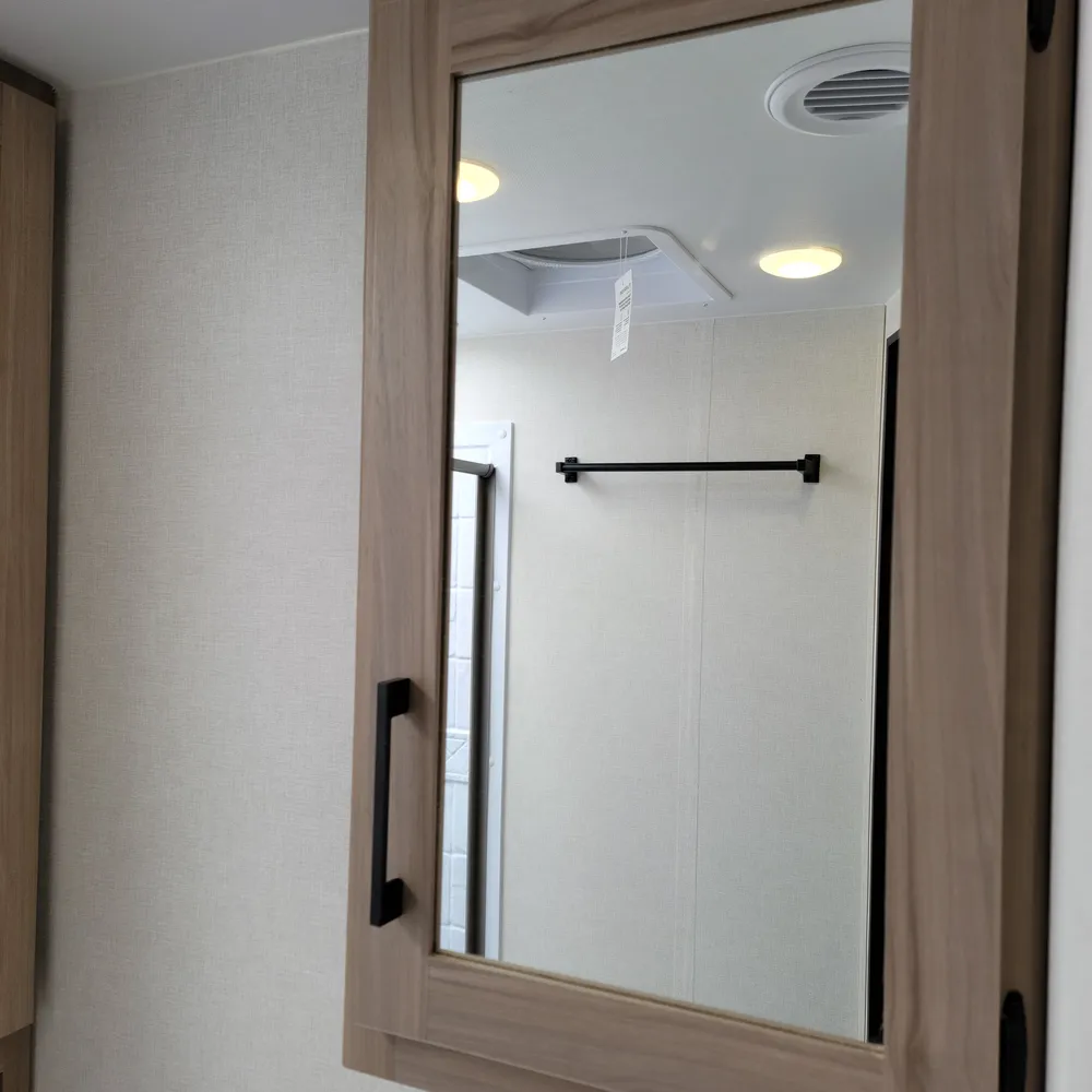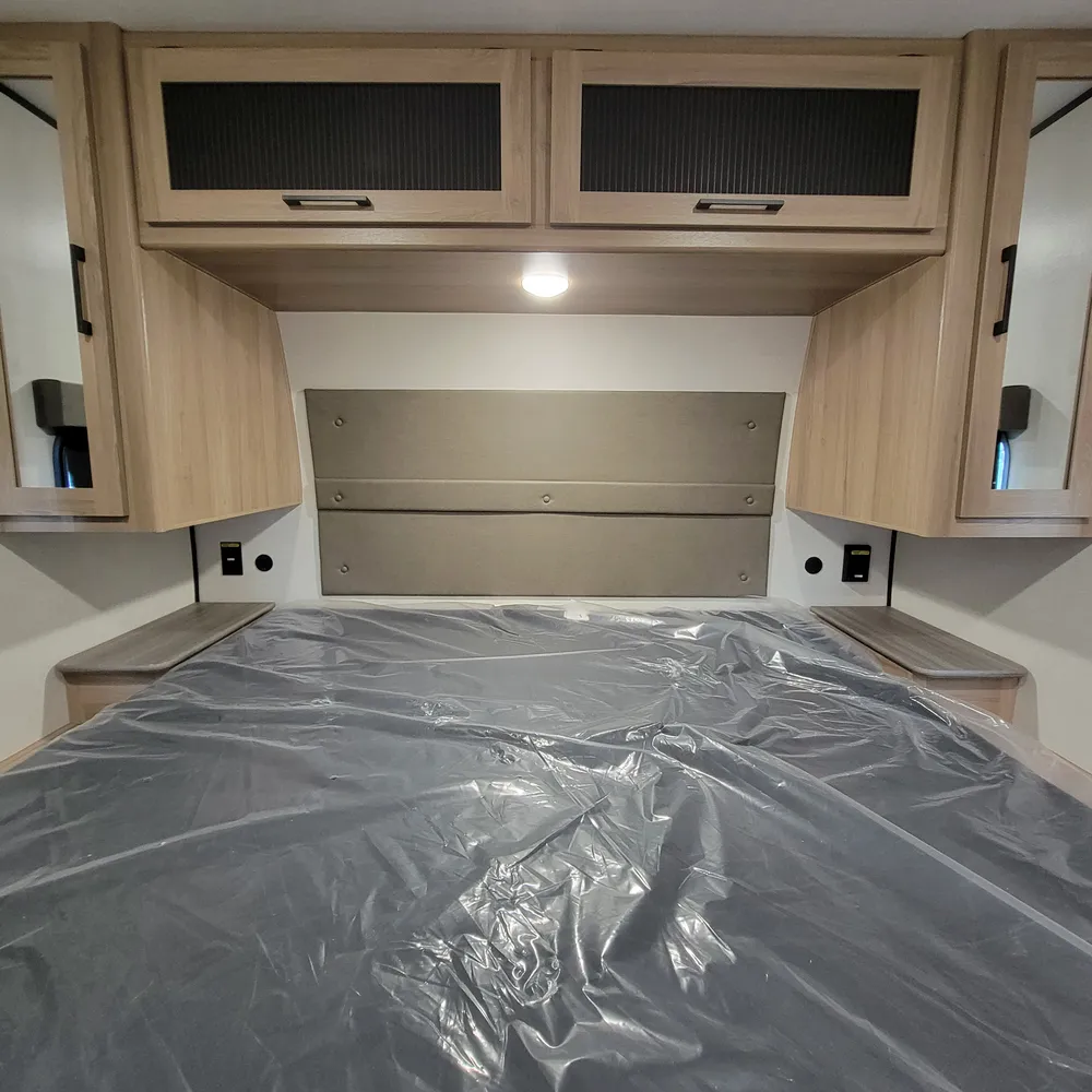 The front bedroom features a king bed with versatile underbed storage, nightstands with hidden storage, and wardrobe for hanging clothes. The bathroom provides a spacious 30″ x 40″ shower with retractable door, elongated porcelain foot-flush toilet, upgraded Oxygenics Fury showerhead, and extra-tall medicine cabinet. The 82-inch interior height and 72-inch slide height create an open, residential feel throughout.