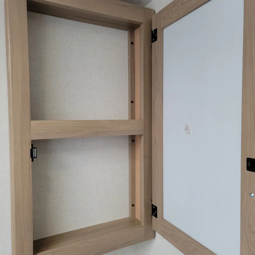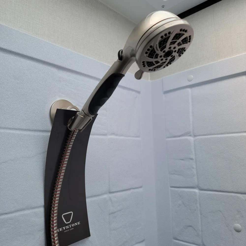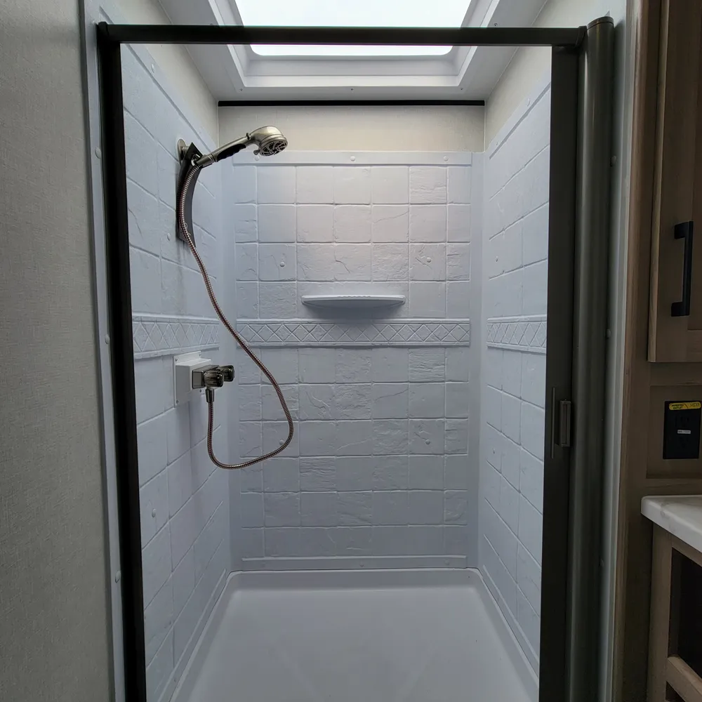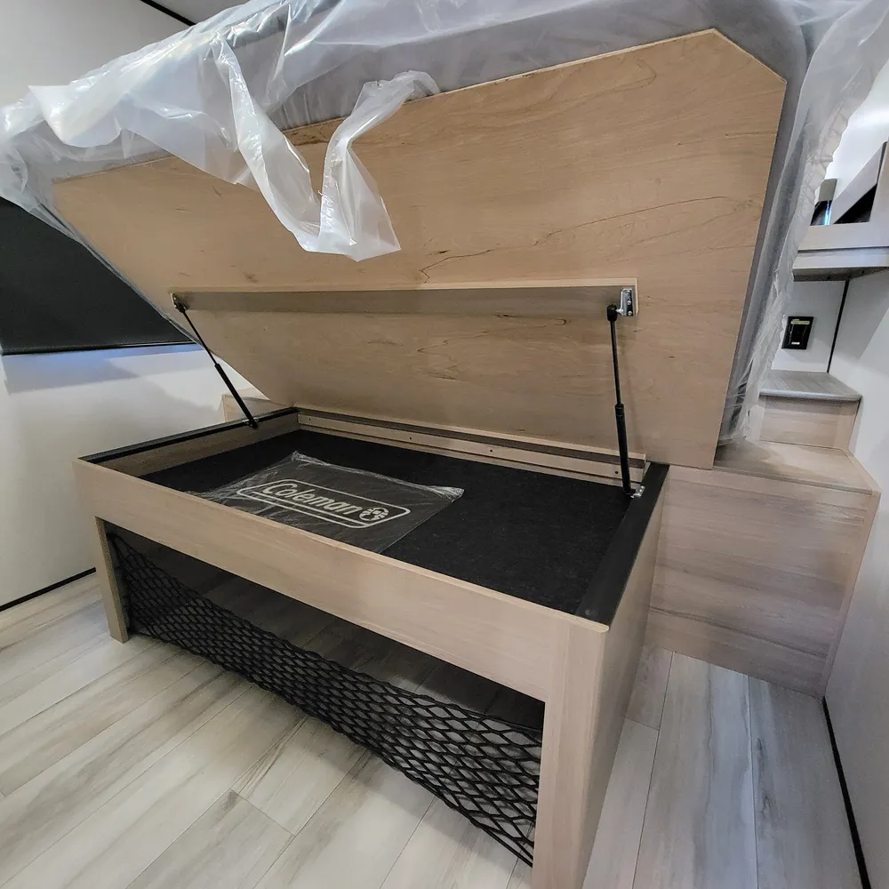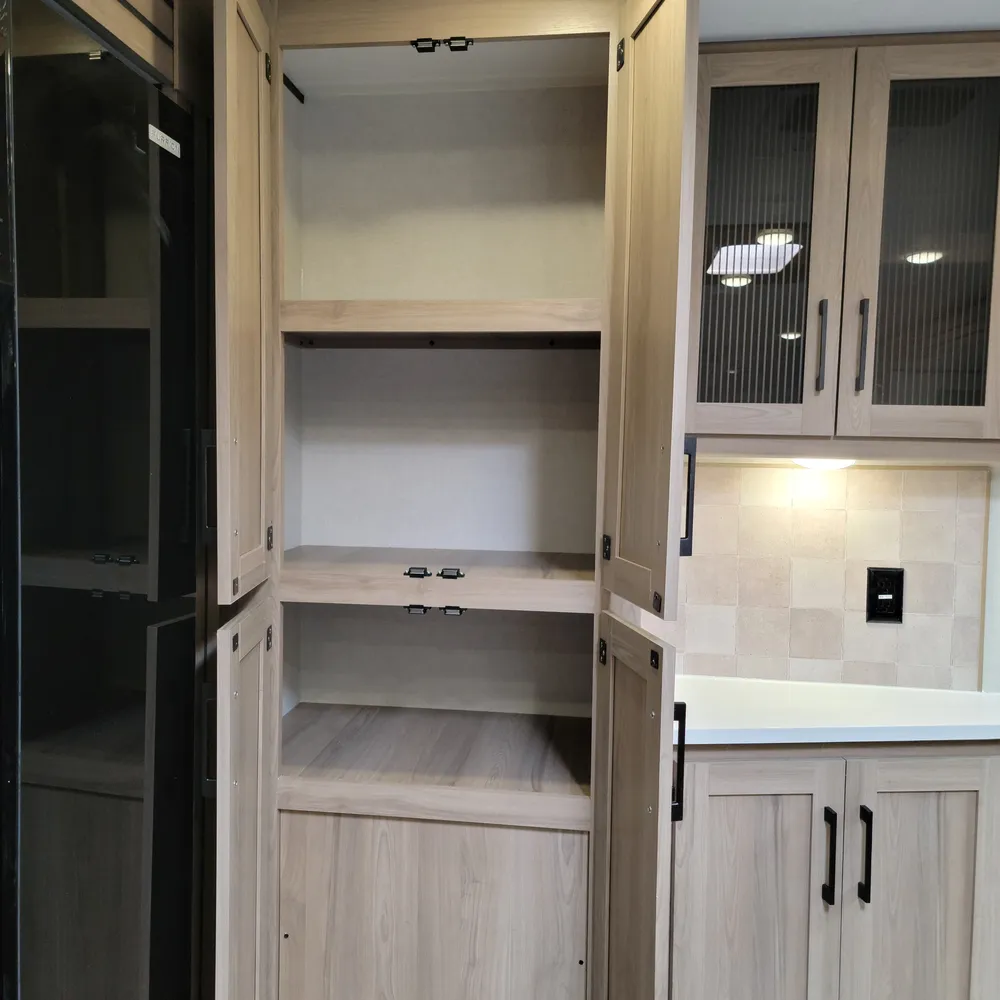The front bedroom features a king bed with versatile underbed storage, nightstands with hidden storage, and wardrobe for hanging clothes. The bathroom provides a spacious 30″ x 40″ shower with retractable door, elongated porcelain foot-flush toilet, upgraded Oxygenics Fury showerhead, and extra-tall medicine cabinet. The 82-inch interior height and 72-inch slide height create an open, residential feel throughout.