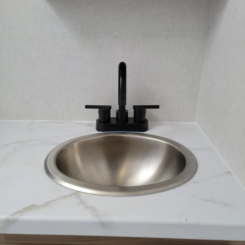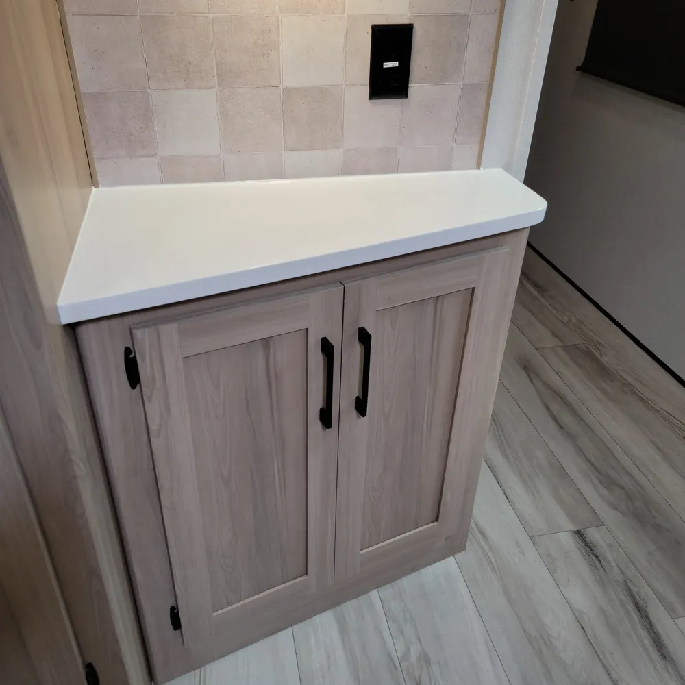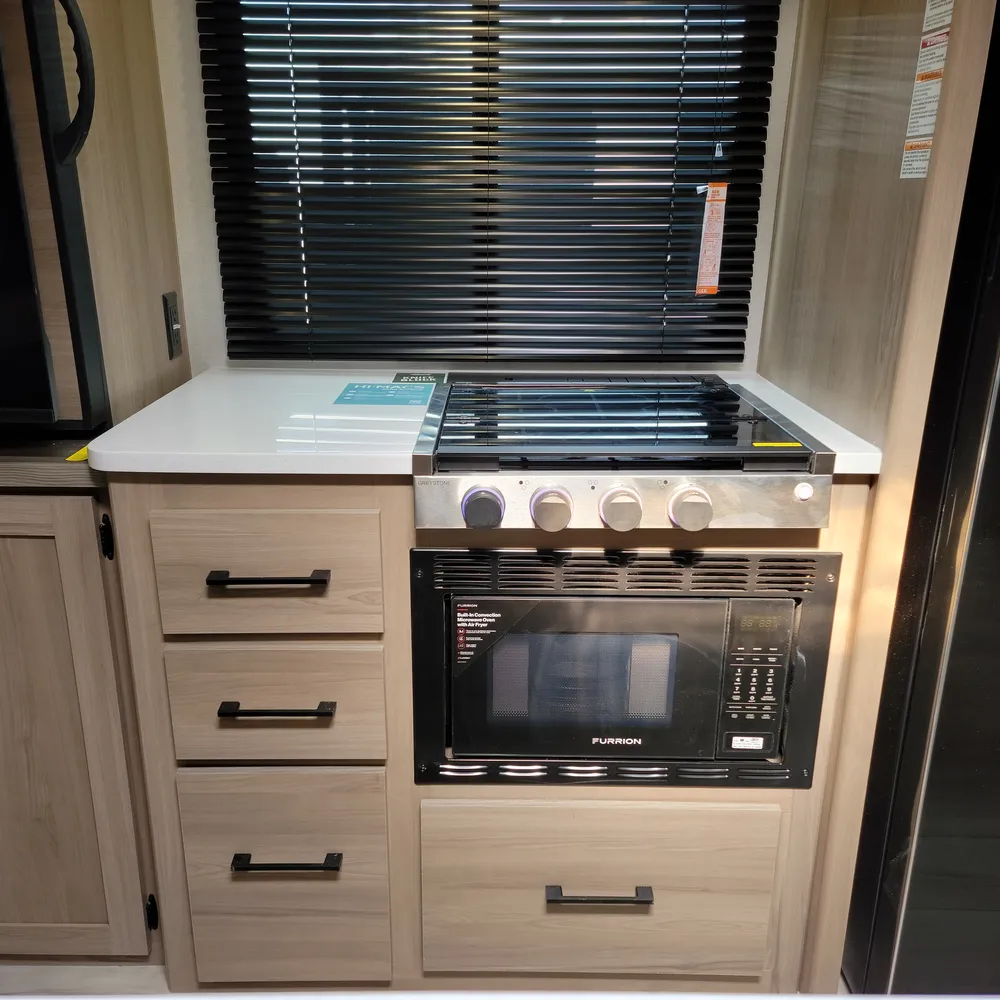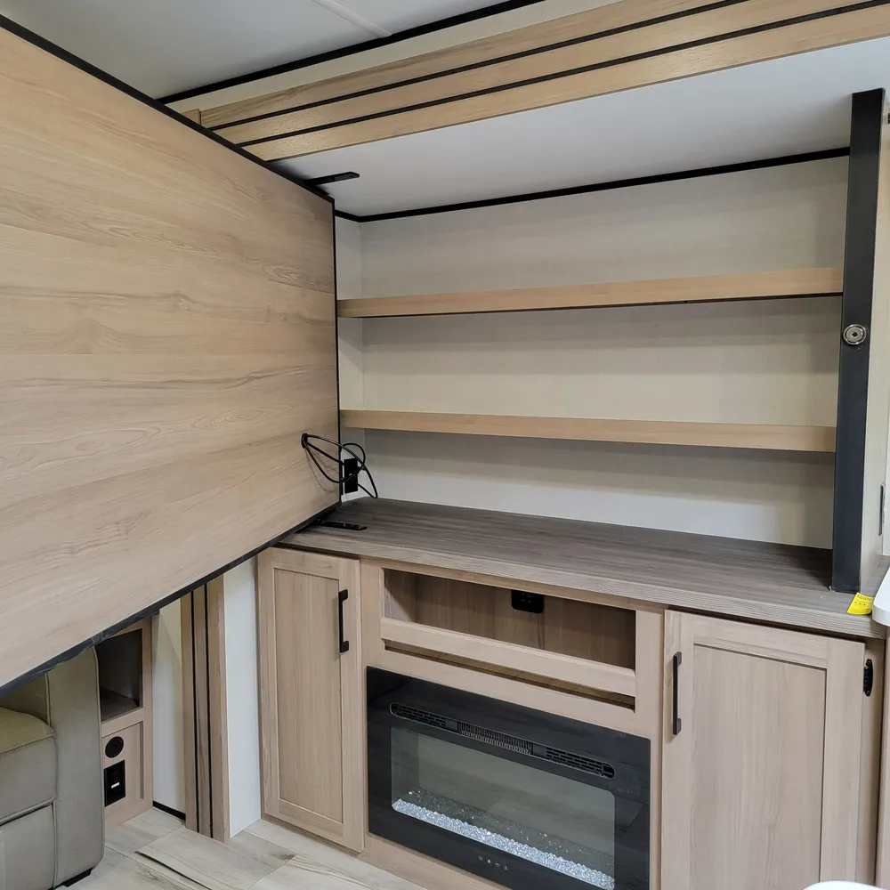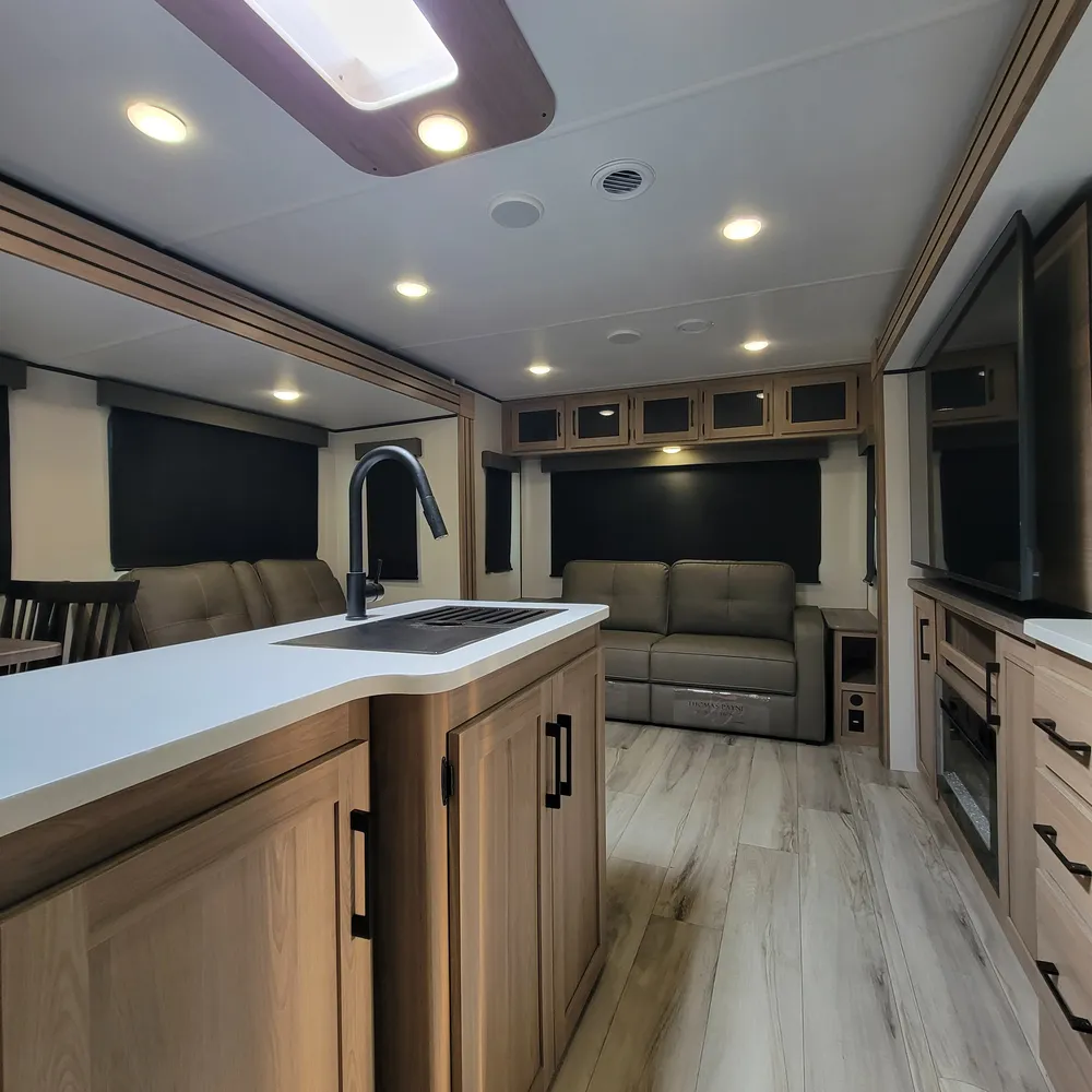 The Legacy 2950RL includes a 15,000 BTU ducted air conditioner with 50-amp service and prep for a second AC unit, plus a 35,000 BTU furnace for climate control. The 42,000 BTU Suburban tankless water heater provides on-demand hot water, while electric stabilizer jacks and power tongue jack simplify setup. The walkable roof, heated and enclosed underbelly, and full pass-through storage with extra-tall doors add to the premium feel. The painted fiberglass front cap with LED light strips and aluminum rims complete the upscale exterior. This couple-focused trailer is ready for summer.