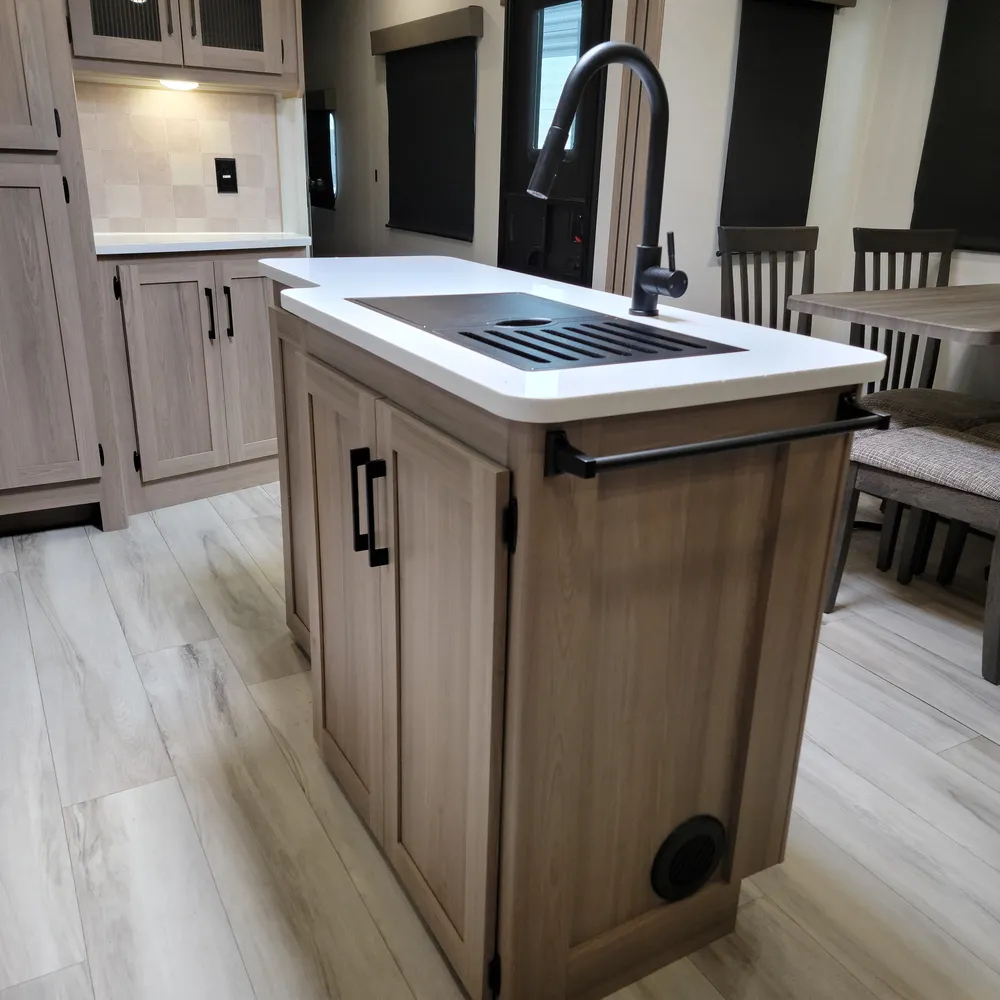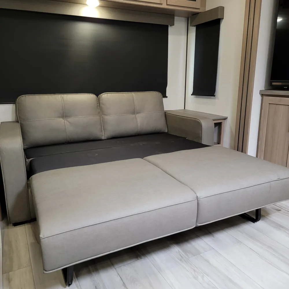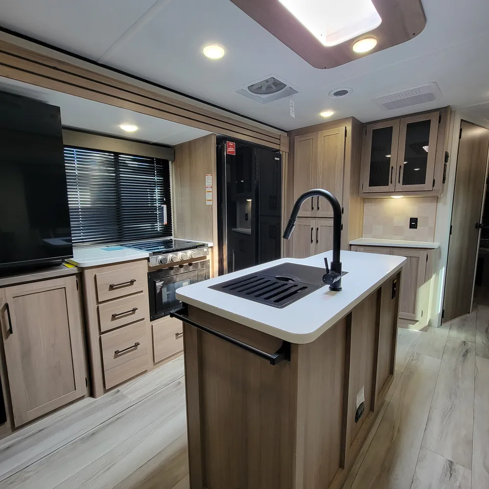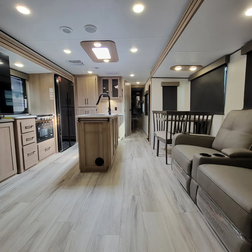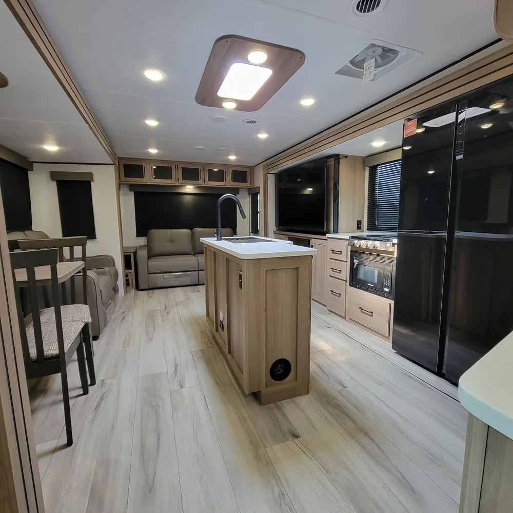The kitchen impresses with a center island featuring a dual sink with split covers, 16 cubic foot 12V refrigerator, three-burner flush-mount gas range with glass cover, and air fryer/convection/microwave combo. A convenient hutch provides space for a coffee station, while the freestanding dinette offers flexible dining space.
