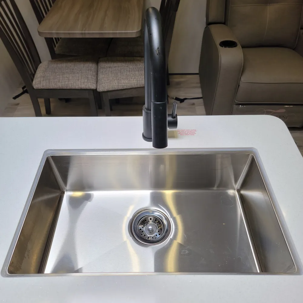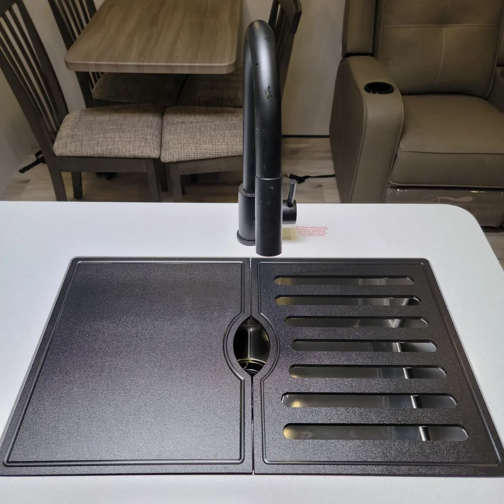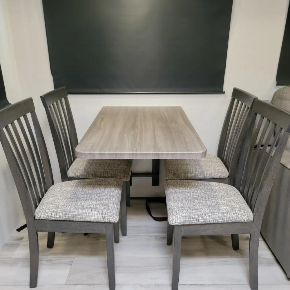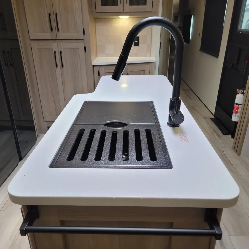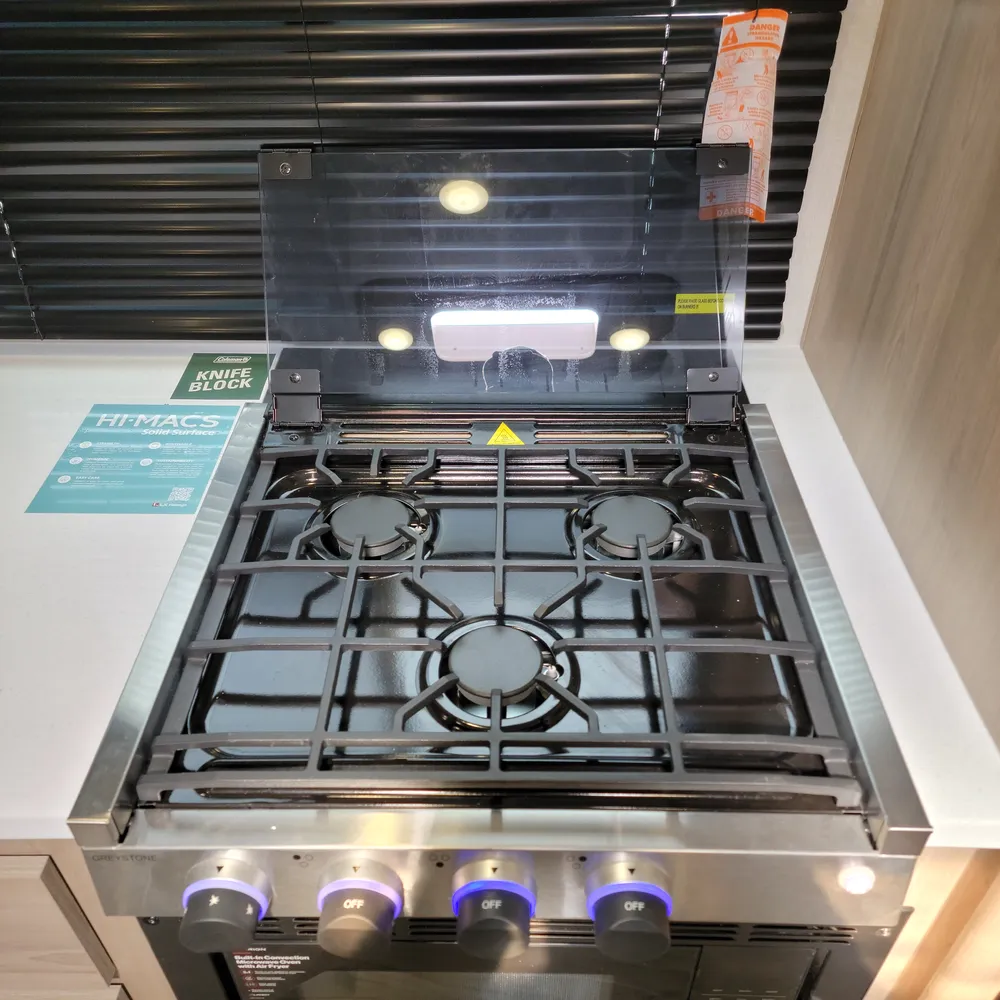 The kitchen impresses with a center island featuring a dual sink with split covers, 16 cubic foot 12V refrigerator, three-burner flush-mount gas range with glass cover, and air fryer/convection/microwave combo. A convenient hutch provides space for a coffee station, while the freestanding dinette offers flexible dining space.