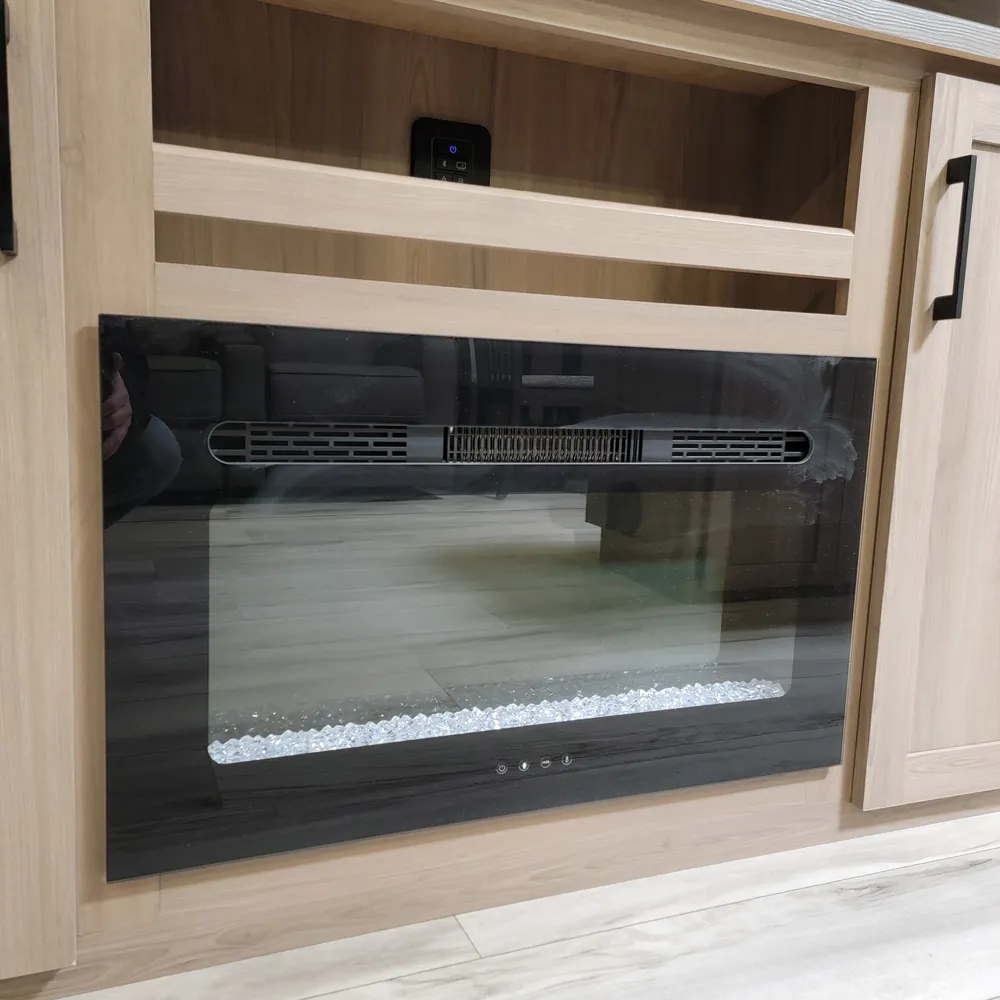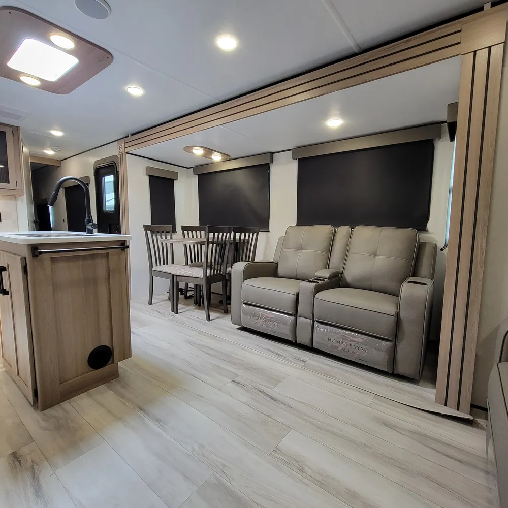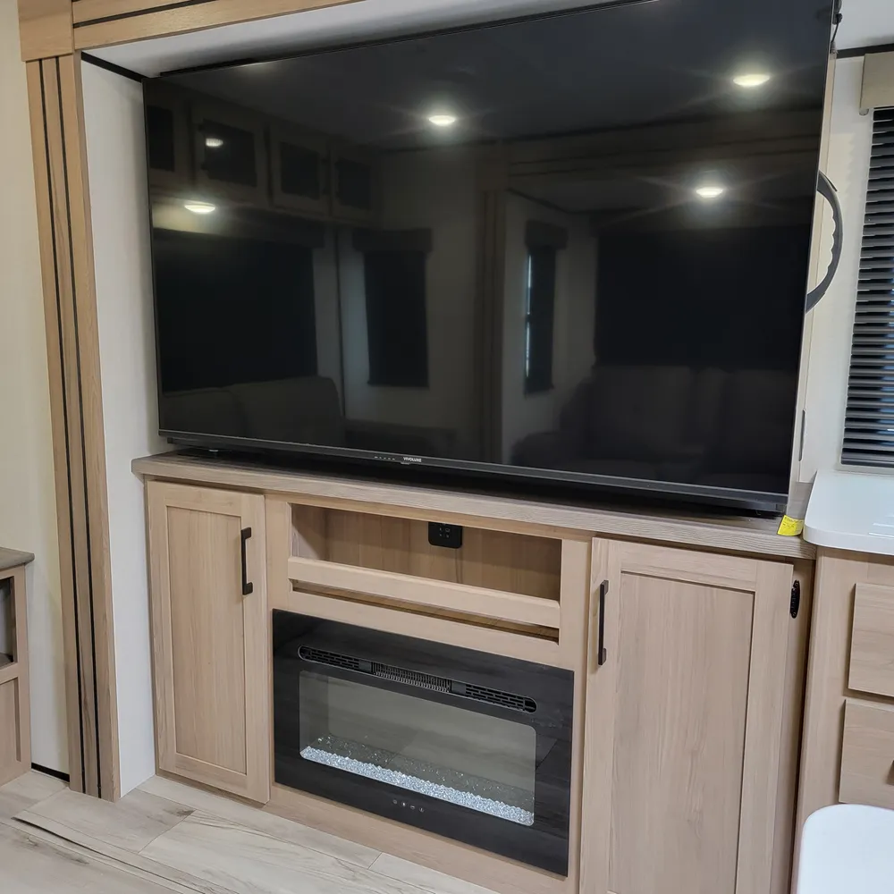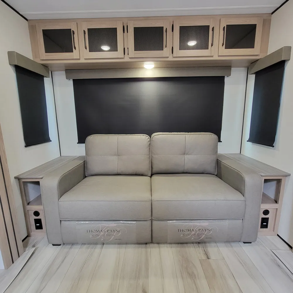 The 2950RL distinguishes itself with a spacious rear living layout featuring opposing slideouts that create an expansive entertainment area. The rear includes theater seating and a tri-fold sleeper sofa arranged around a 65-inch LED Smart TV with electric fireplace.