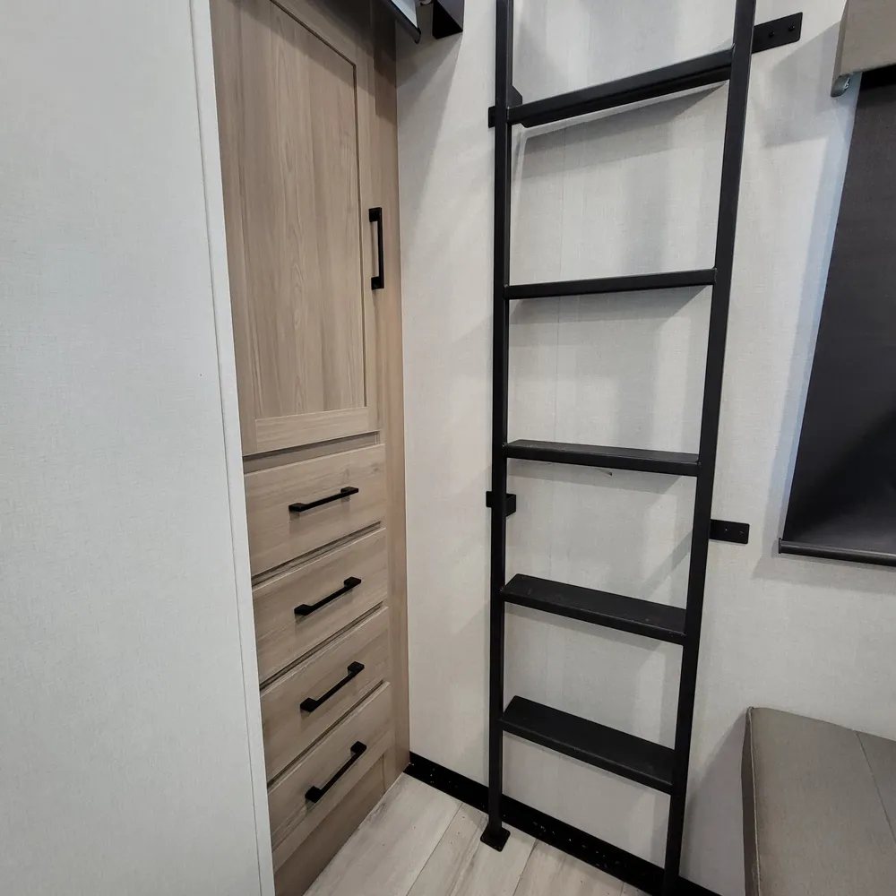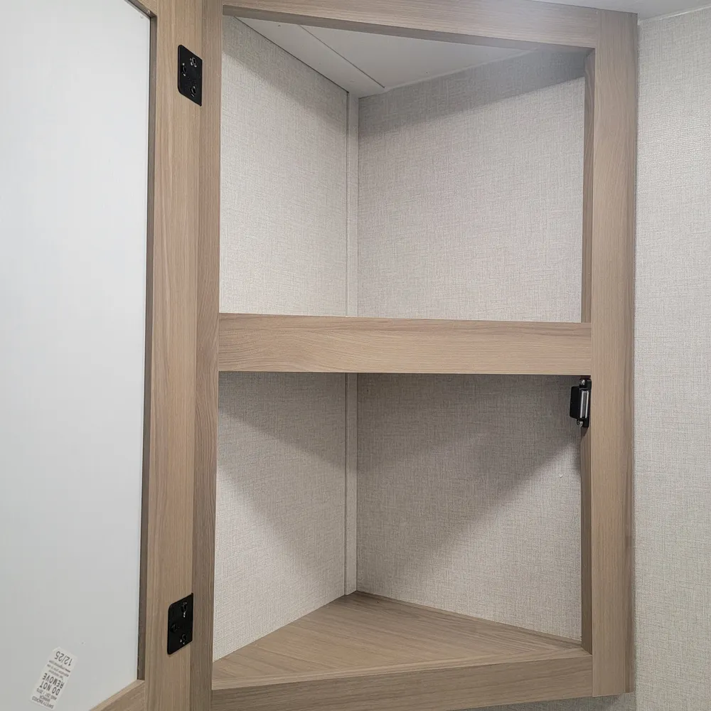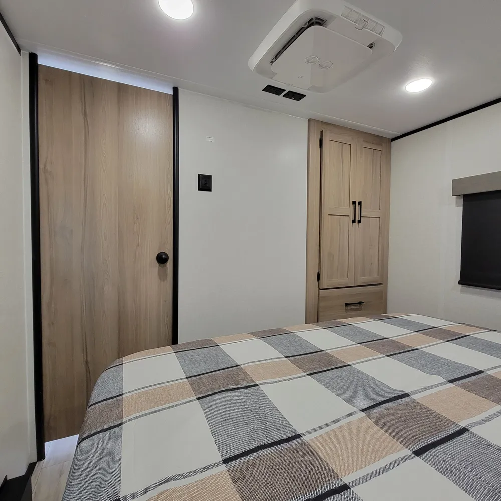 The front bedroom offers a king bed (70″ x 80″) with underbed storage, nightstands with hidden storage, and a wardrobe. The main bathroom includes a 30″ x 40″ shower with retractable door, elongated porcelain foot-flush toilet, upgraded Oxygenics Fury showerhead, and extra tall medicine cabinet. The 82-inch interior height maintains an open feel throughout.