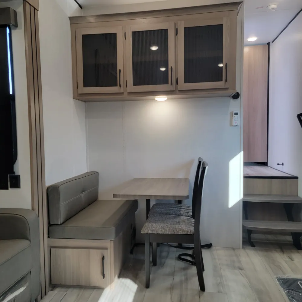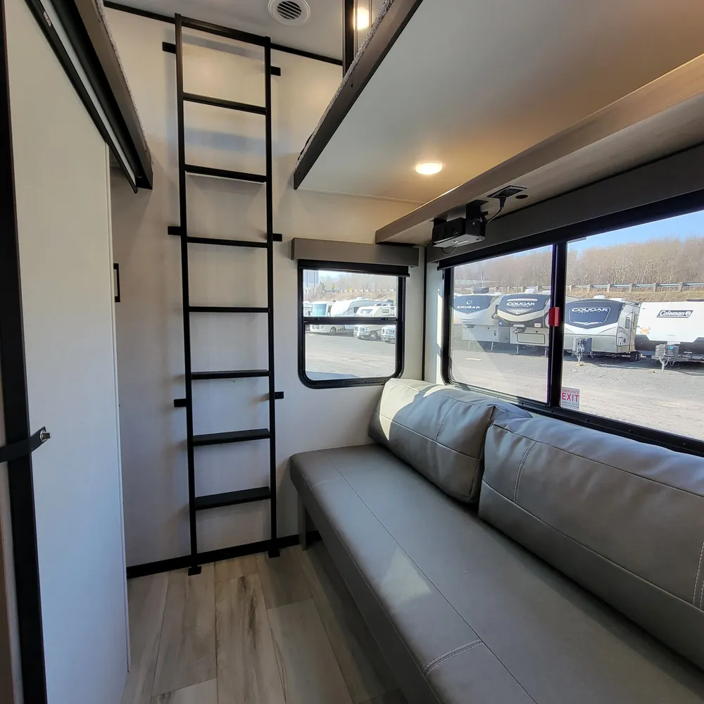 The 3000LOFT stands out with a rear loft bunkhouse featuring two elevated side bunks accessed by a center ladder, a sofa bed below, and a dedicated half-bathroom. Kids get their own zone complete with a projector and screen for movies and games. The main level features aslideout housing a tri-fold sleeper sofa, creating an open living area. The booth dinette with two freestanding chairs provides dining space separate from the slideout.