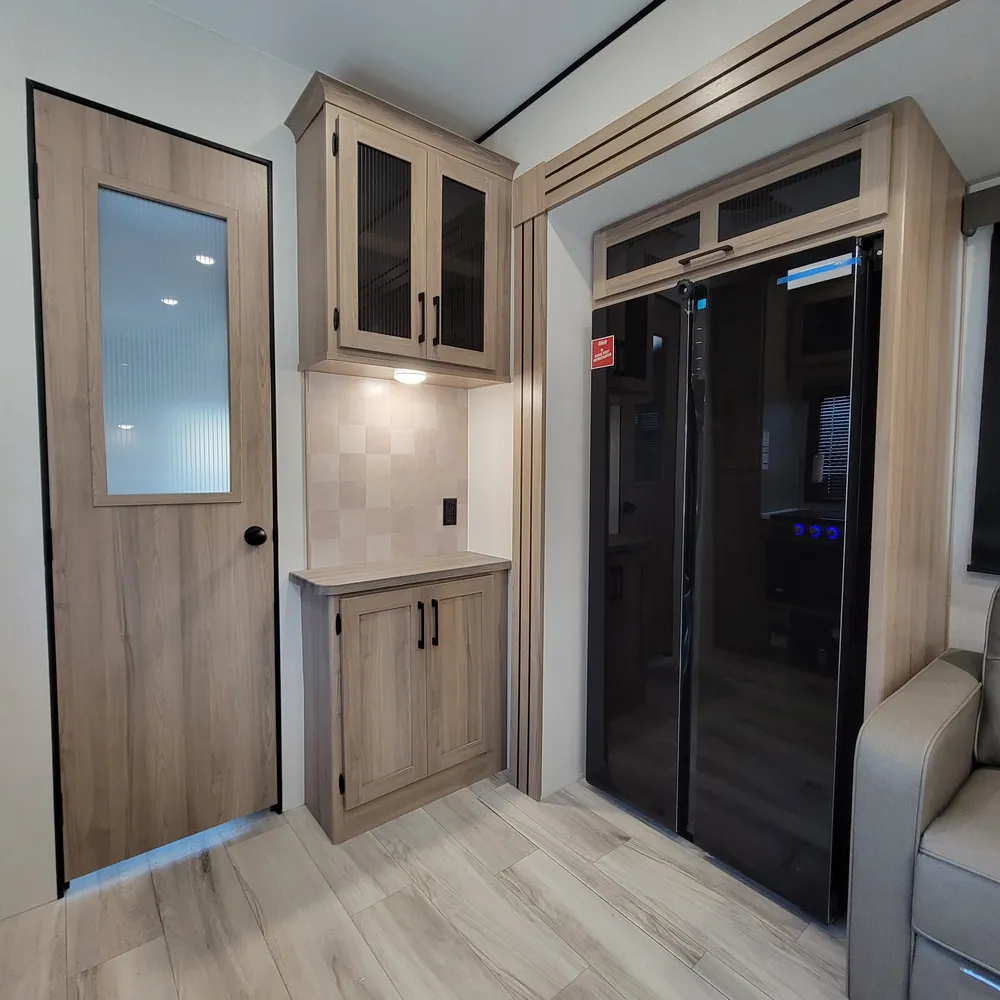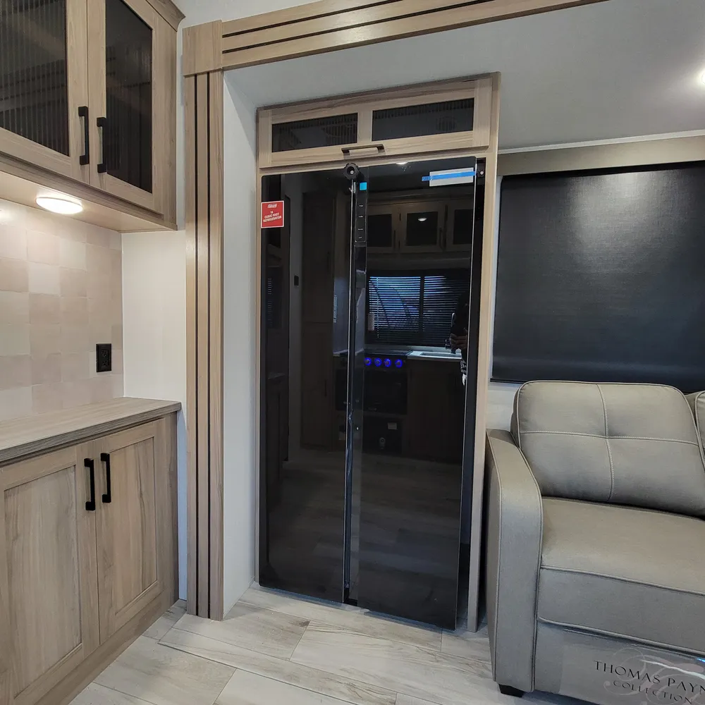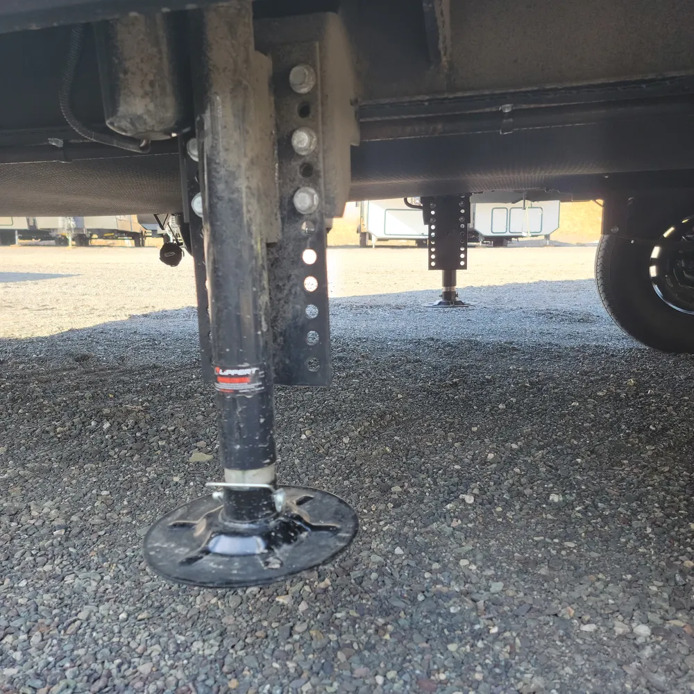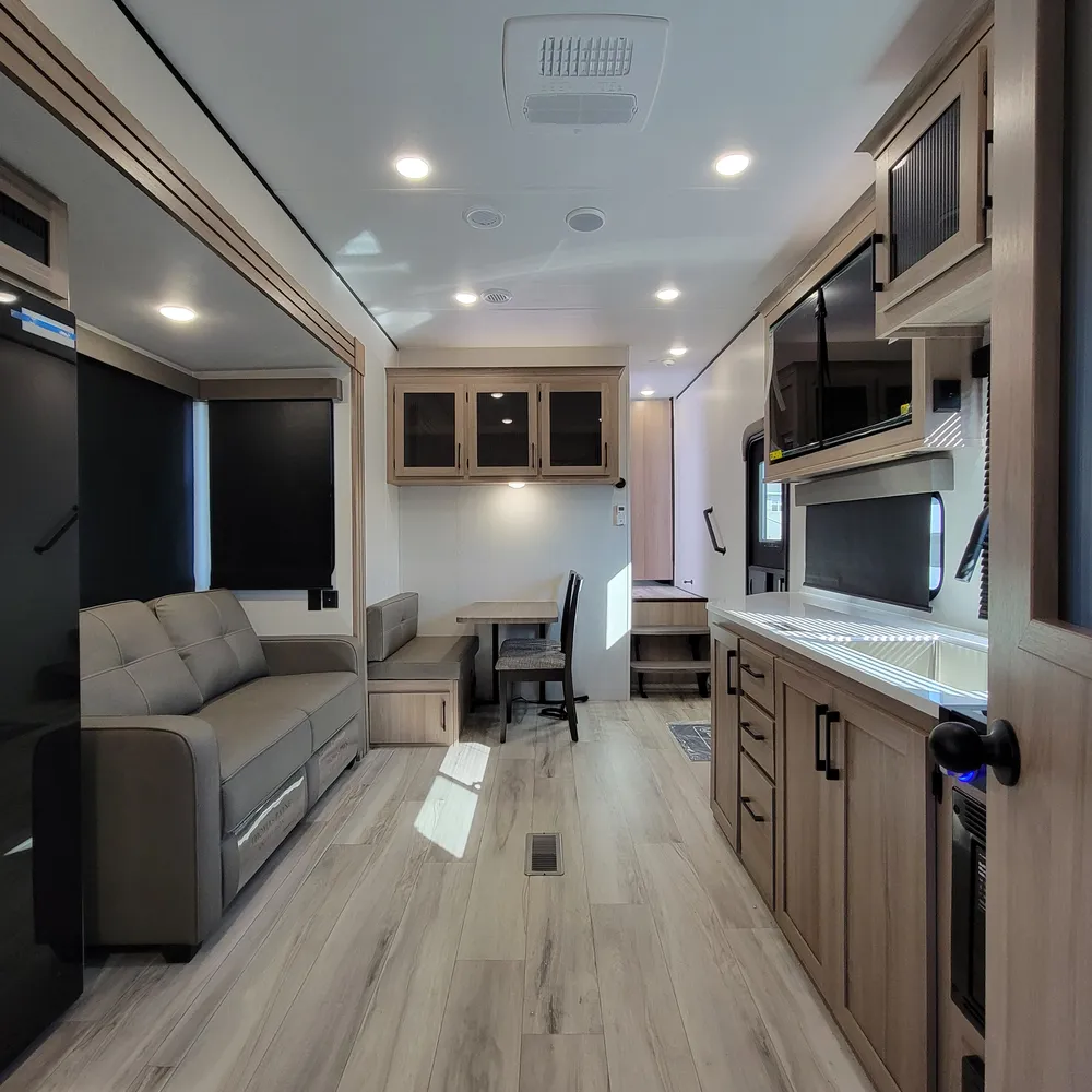 Dual air conditioners (18,000 BTU Chill Cube and 8,000 BTU) combine with a 35,000 BTU furnace and 42,000 BTU tankless water heater. Built on an I-beam frame with walkable roof, one-piece heated underbelly, and full pass-through storage with extra tall doors. Power awning, electric stabilizer jacks, and Helux pin box complete this family-focused fifth wheel.