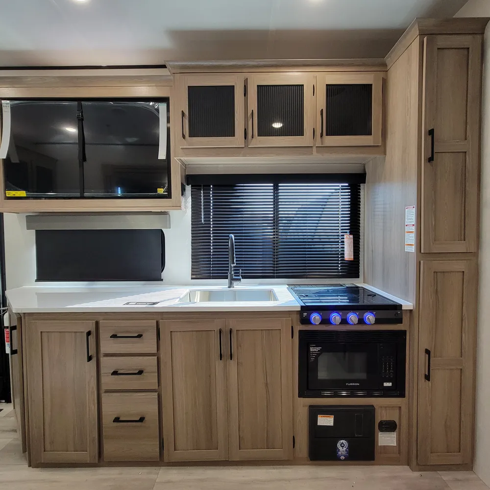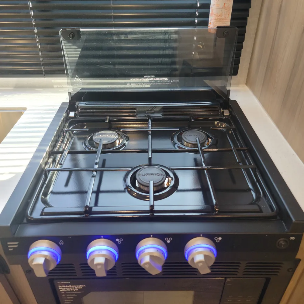 The kitchen delivers with a three-burner flush-mount gas range, air fryer convection microwave combo, 16 cubic foot 12V refrigerator, solid surface countertops, and high-rise faucet with pullout sprayer. A 50-inch LED Smart TV anchors the entertainment area.