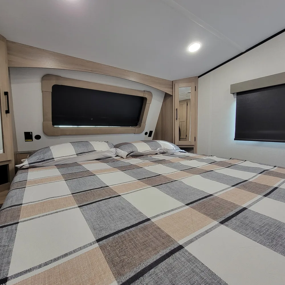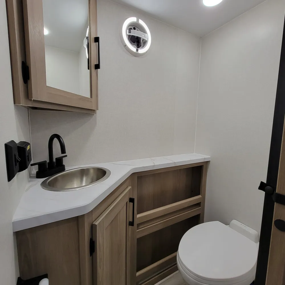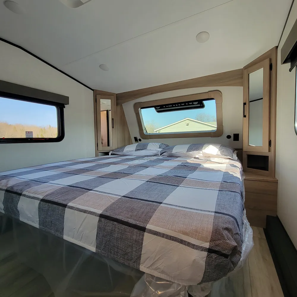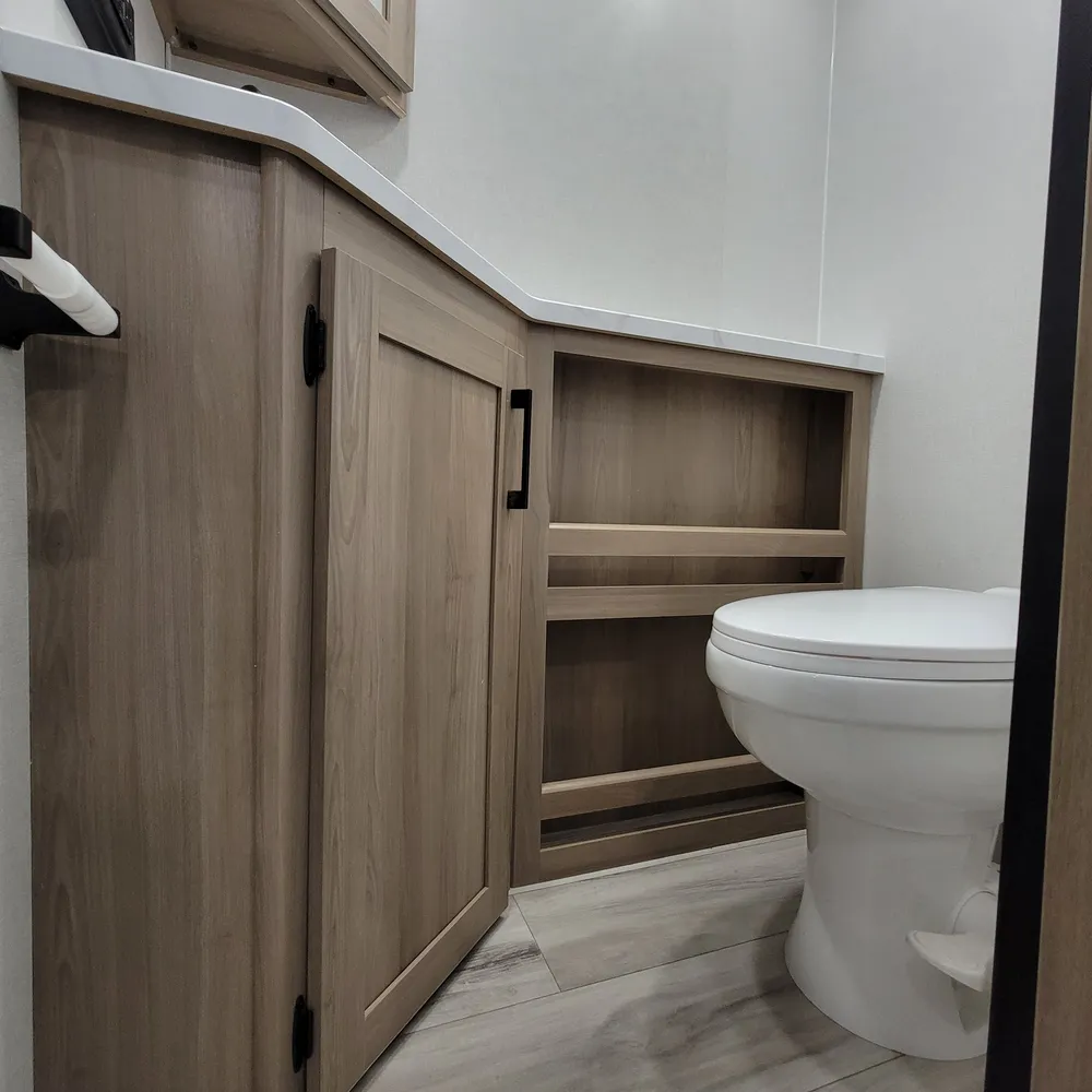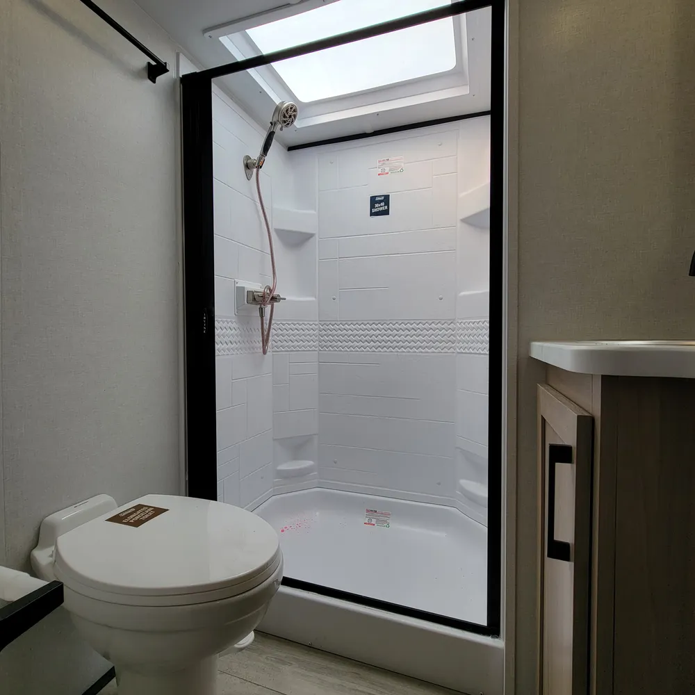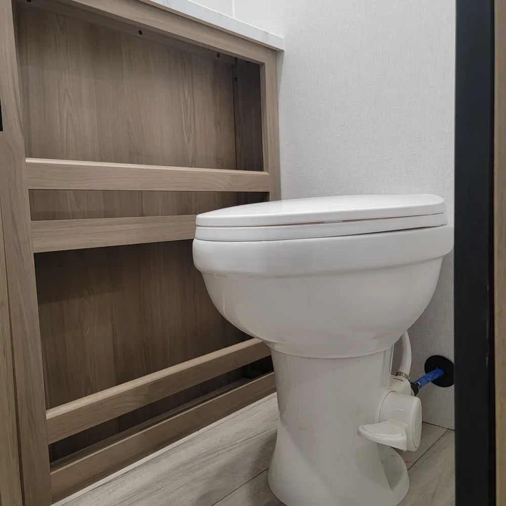 The front bedroom offers a king bed (70″ x 80″) with underbed storage, nightstands with hidden storage, and wardrobe space. The main bathroom includes a 30″ x 40″ shower with retractable door, elongated porcelain foot-flush toilet, upgraded Oxygenics Fury showerhead, and extra-tall medicine cabinet. The 82-inch interior height maintains an open feel throughout.