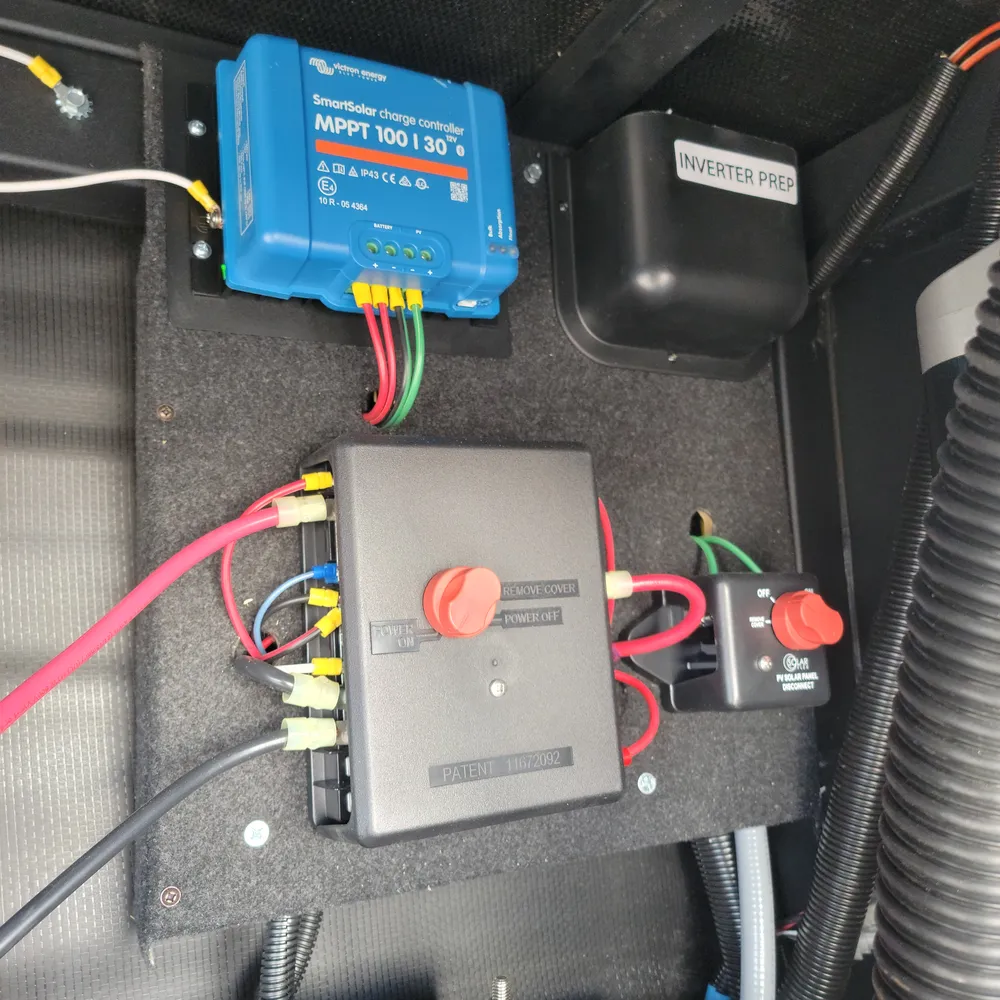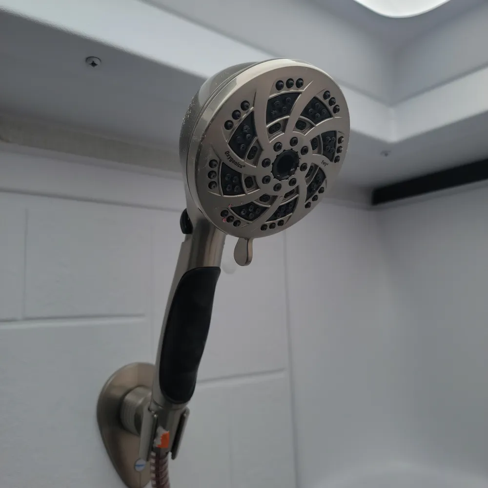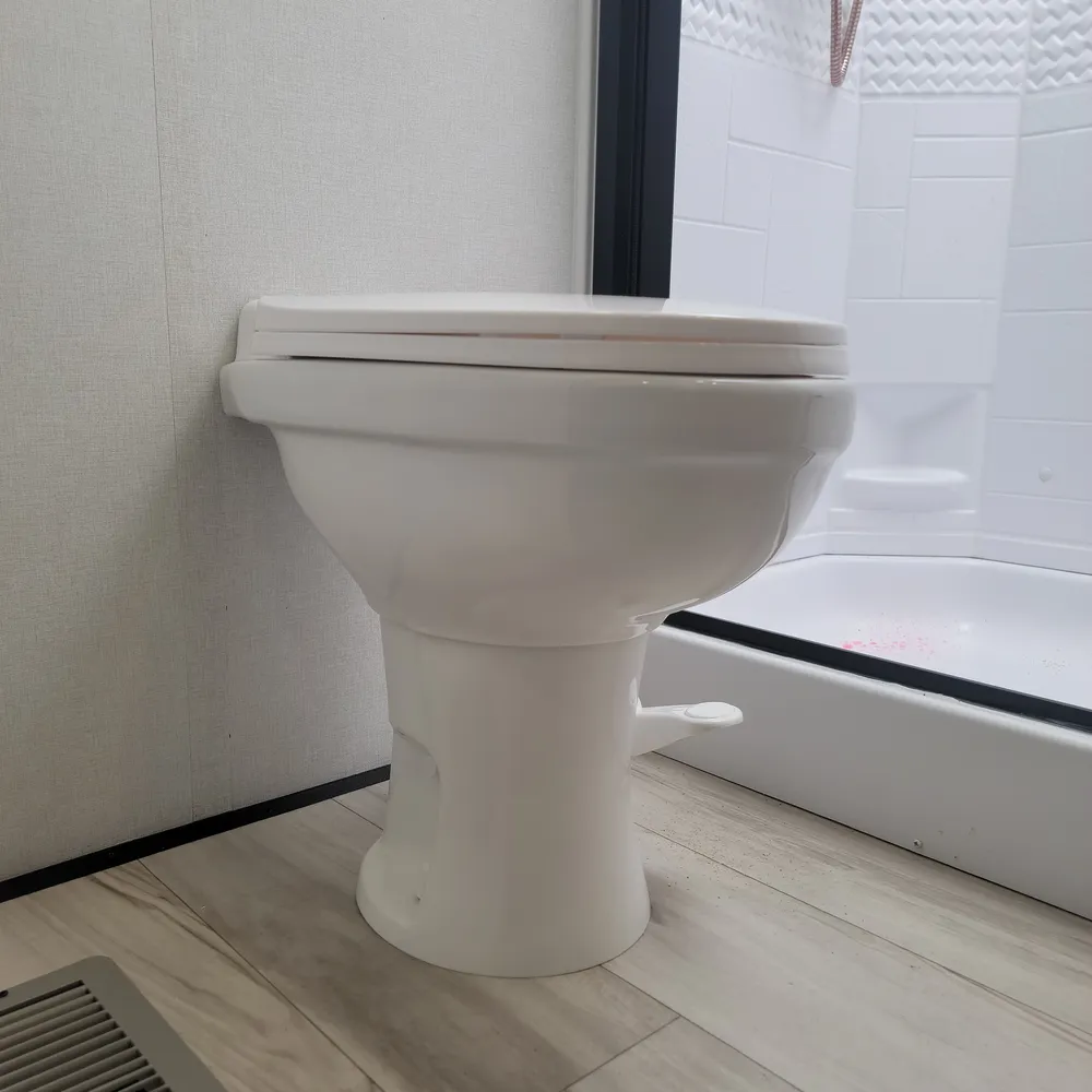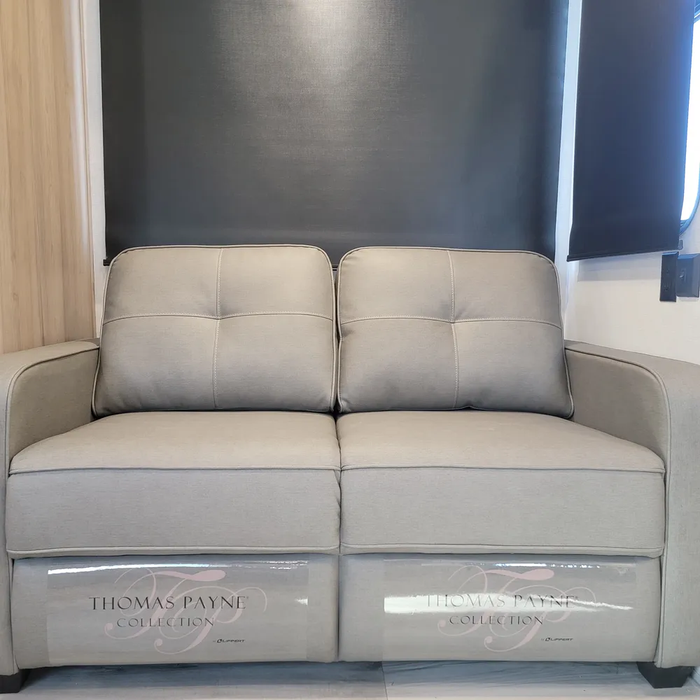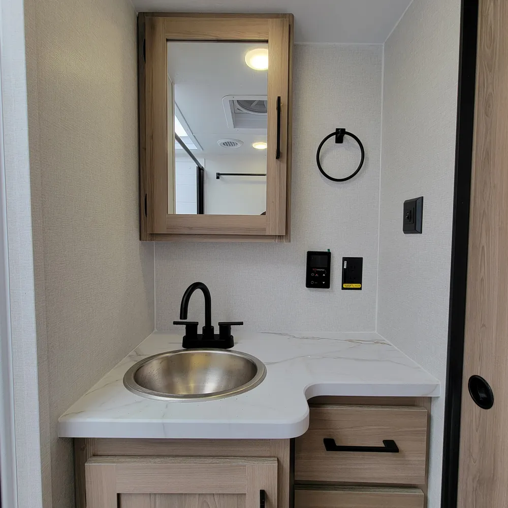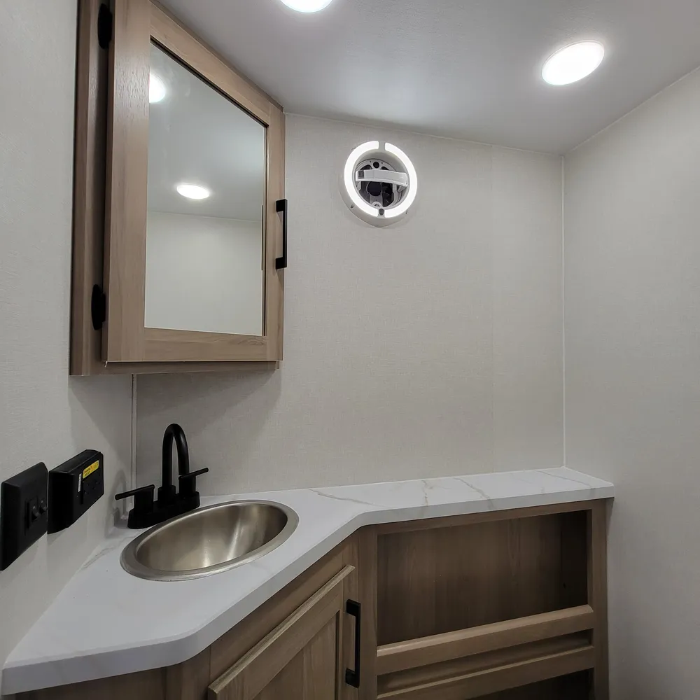 The front bedroom offers a king bed (70″ x 80″) with underbed storage, nightstands with hidden storage, and wardrobe space. The main bathroom includes a 30″ x 40″ shower with retractable door, elongated porcelain foot-flush toilet, upgraded Oxygenics Fury showerhead, and extra-tall medicine cabinet. The 82-inch interior height maintains an open feel throughout.