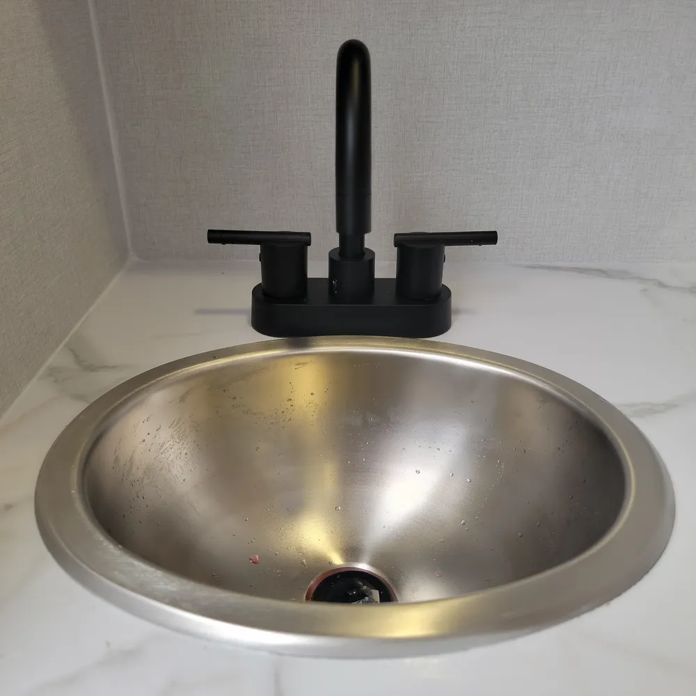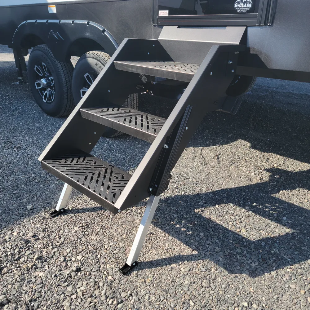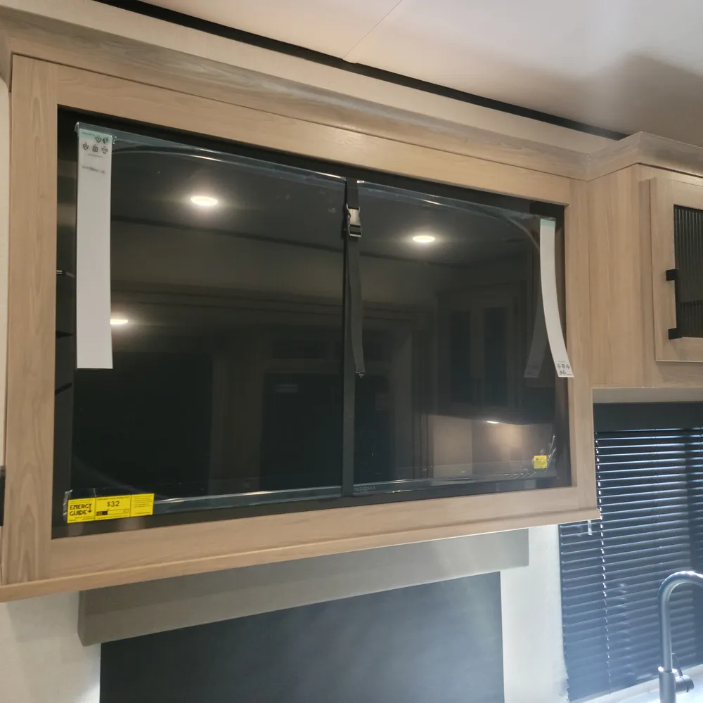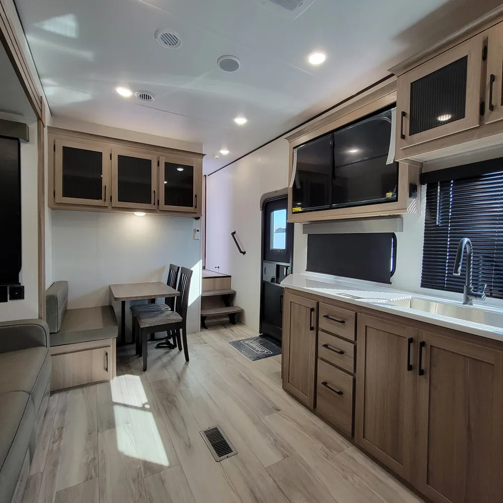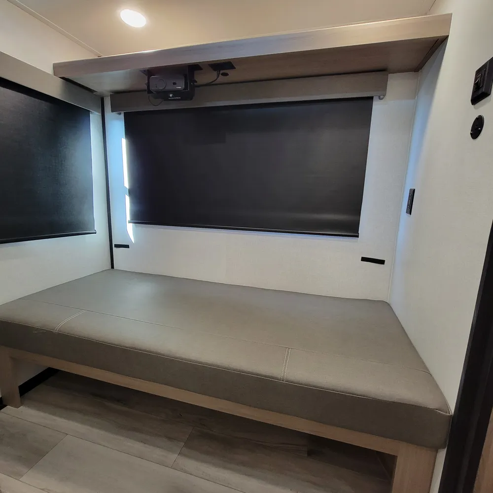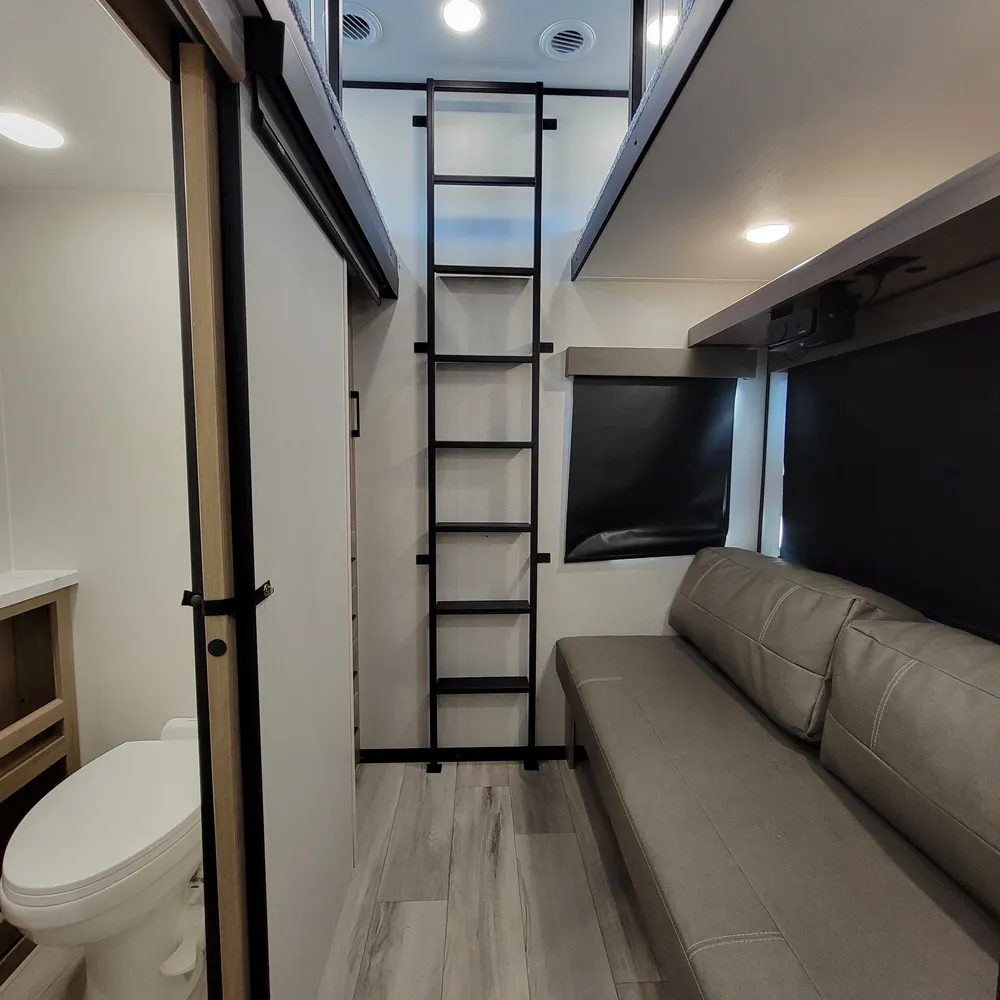The standout feature is the rear loft designed as a private kids zone. This elevated space includes 2 side bunks accessed by a center ladder, a sofa bed below, projector with screen for movies and games, wardrobe closet, and a half-bathroom with toilet and sink. Kids get their own entertainment area separate from the main living space. The main level features a tri-fold sleeper sofa facing a 50-inch LED Smart TV. A freestanding dinette provides dining and game space. The kitchen delivers with a 16 cubic foot 12V refrigerator, air fryer/convection/microwave combo, three-burner gas range with glass cover, solid surface countertops, and coffee station nook. The high-rise faucet with pullout sprayer handles cleanup.