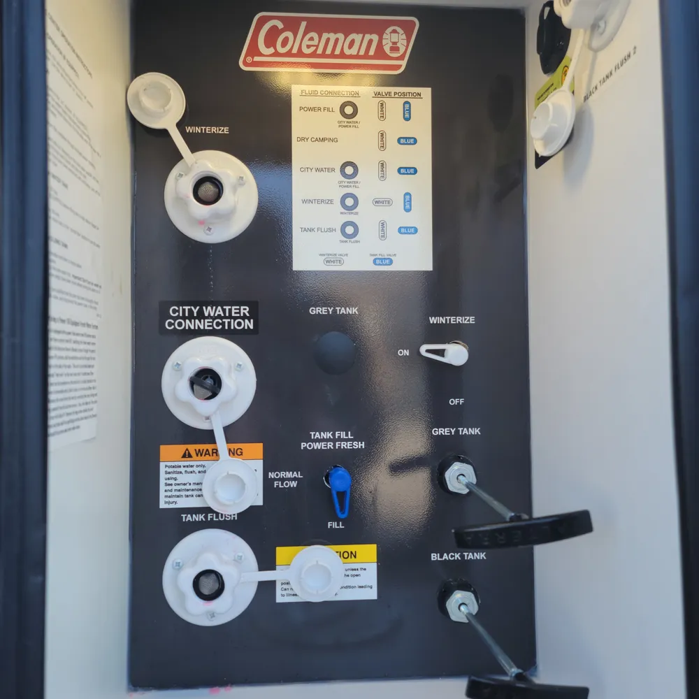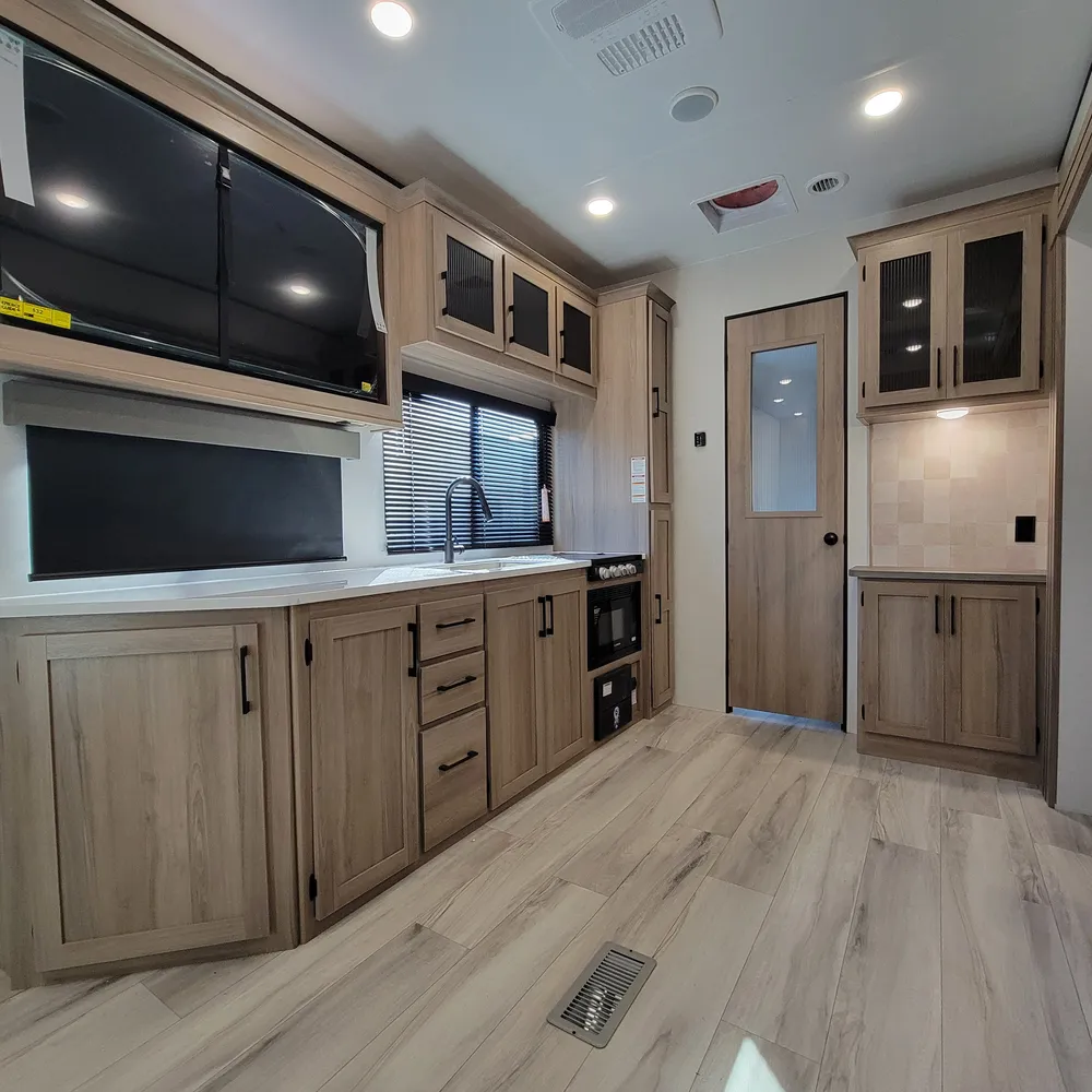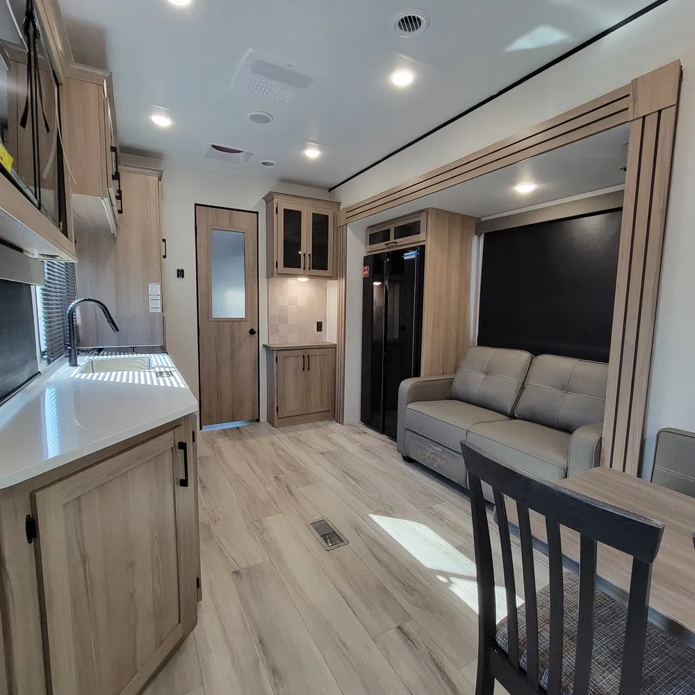 Dual air conditioners (18,000 BTU Chill Cube and 8,000 BTU) combine with a 35,000 BTU furnace and 42,000 BTU tankless water heater for climate control. Built with a painted fiberglass front cap with LED light strips, aluminum rims, automatic self leveling system, and heated and enclosed underbelly. Full pass-through storage handles gear for this family-focused fifth wheel ready for Atlantic Canada adventures.