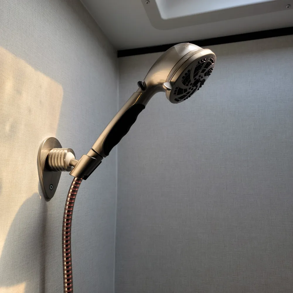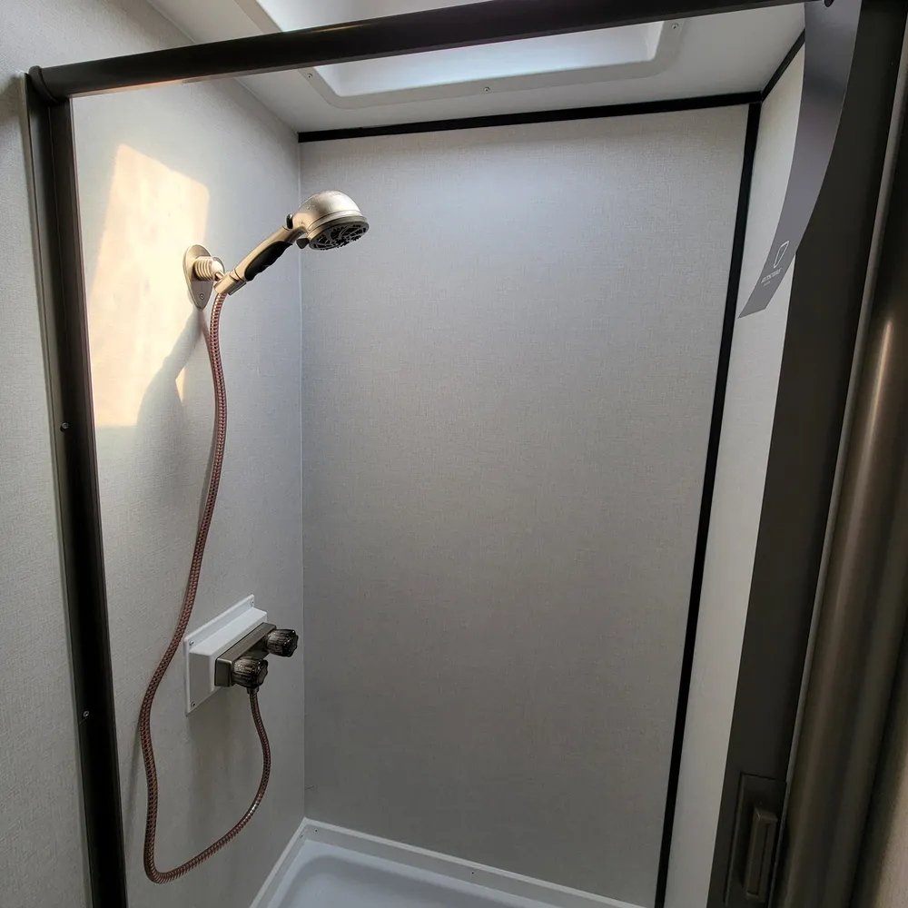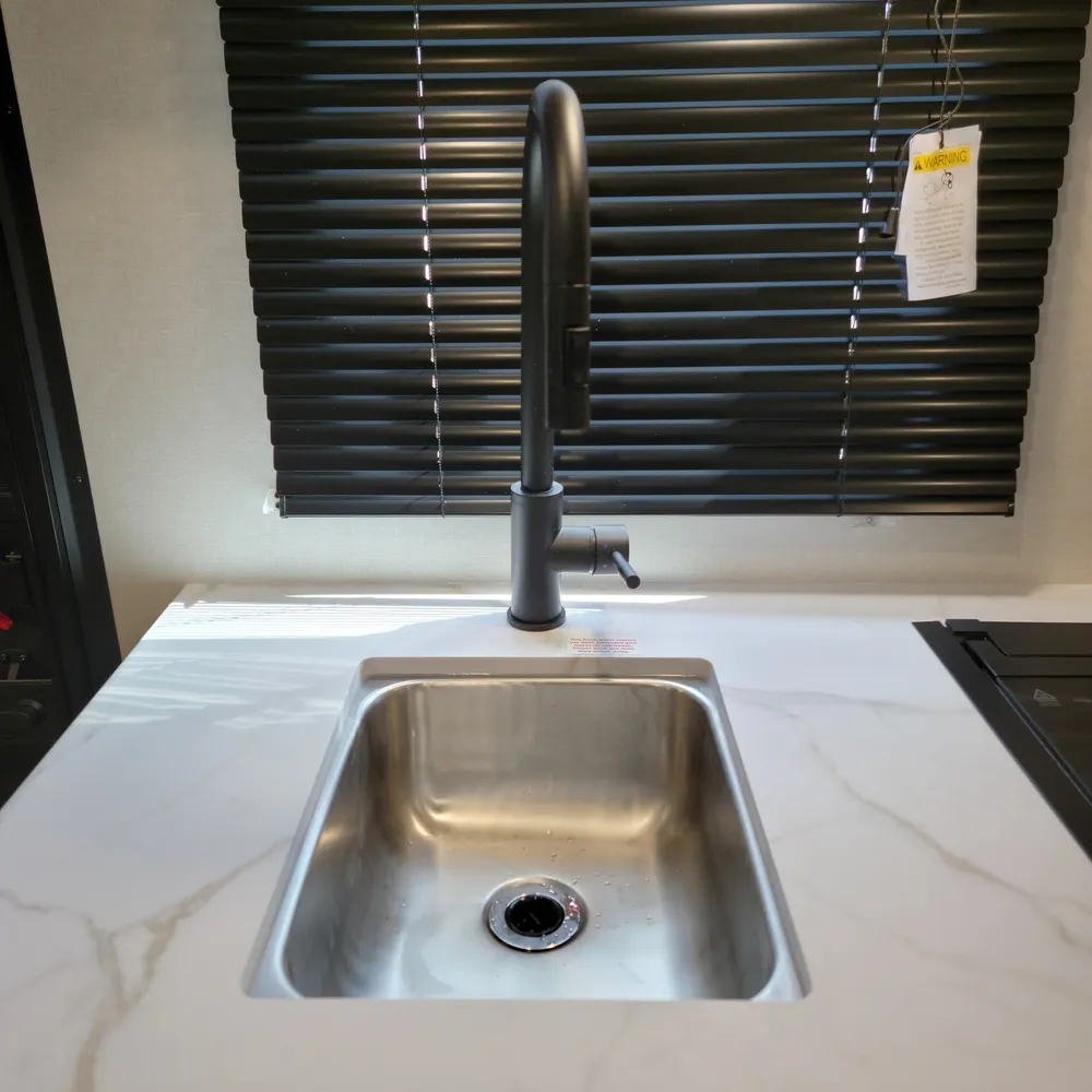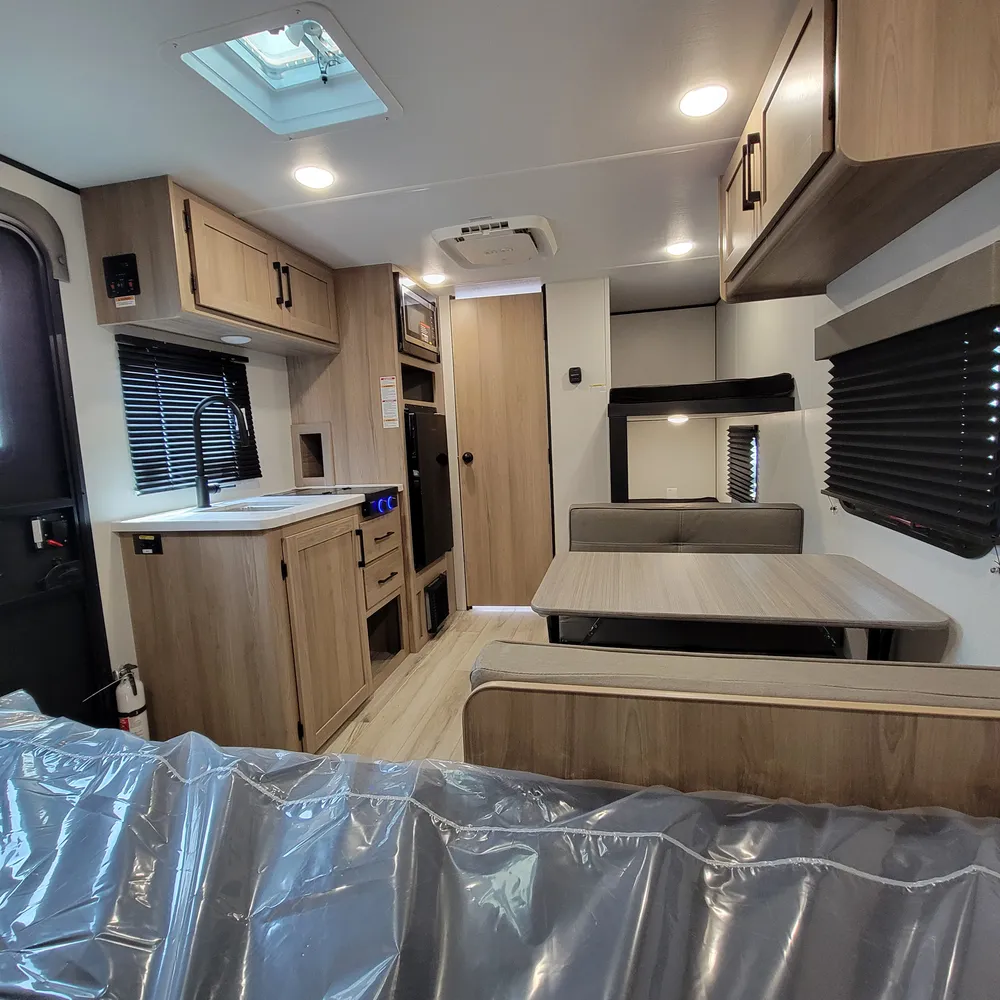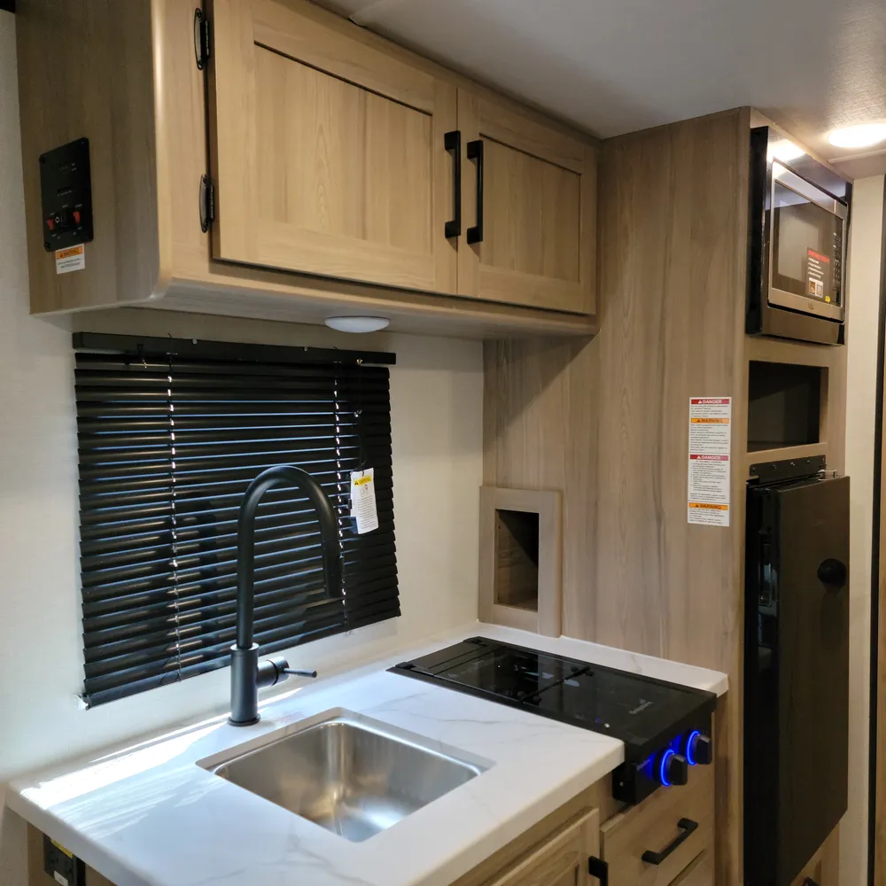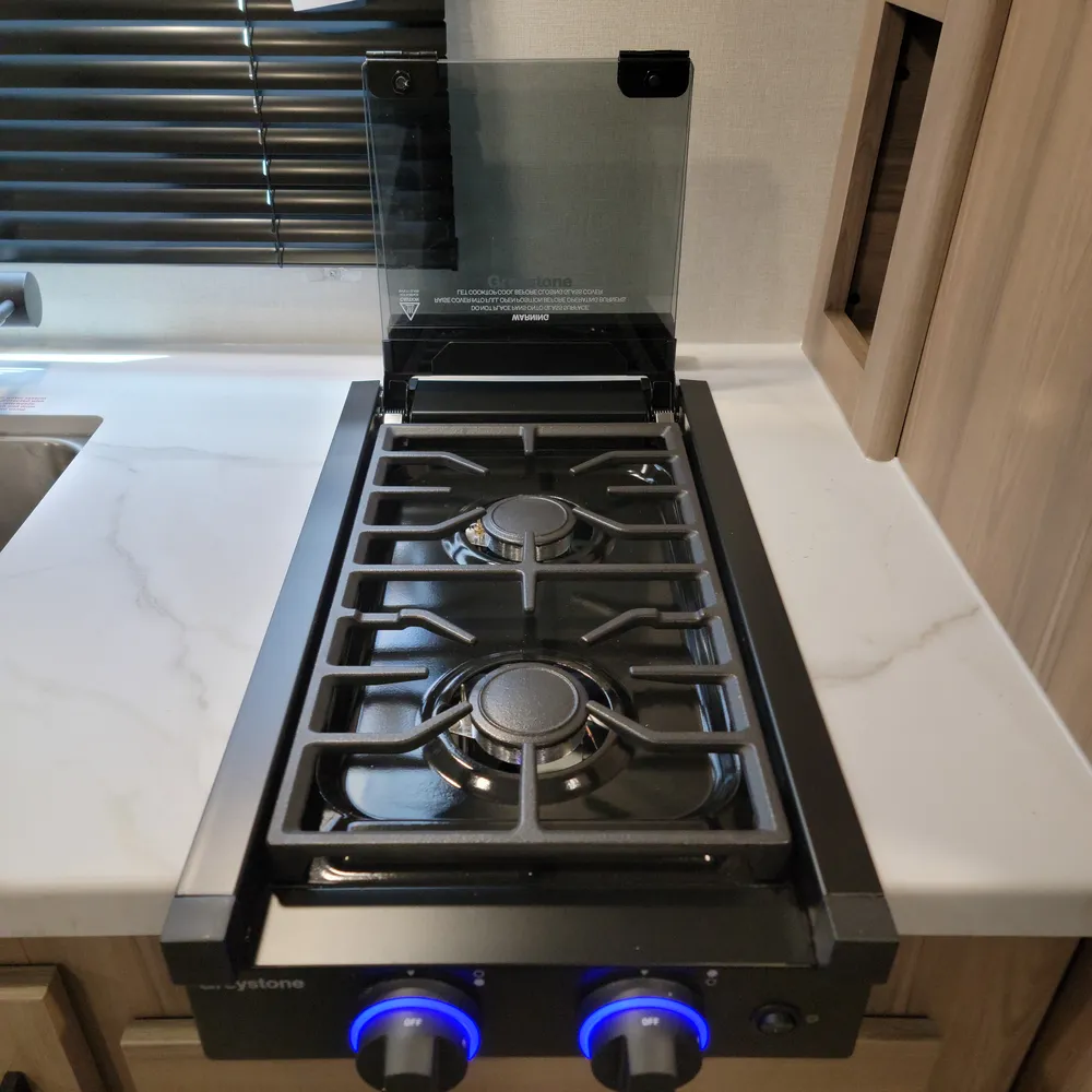 The main living space includes a dinette that seats four for meals and converts to additional sleeping space when needed. The kitchen is well-equipped with a 3.3 cubic foot 12V refrigerator, two-burner gas range, microwave, and high-rise kitchen faucet with pullout sprayer, along with seamless countertops and dedicated trash storage. The rear bathroom features shower with a retractable shower door, skylight, upgraded Oxygenics Fury showerhead, and foot-flush toilet.