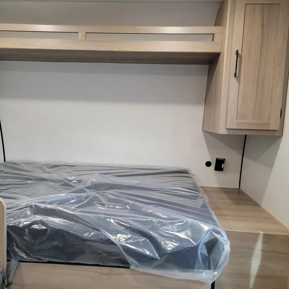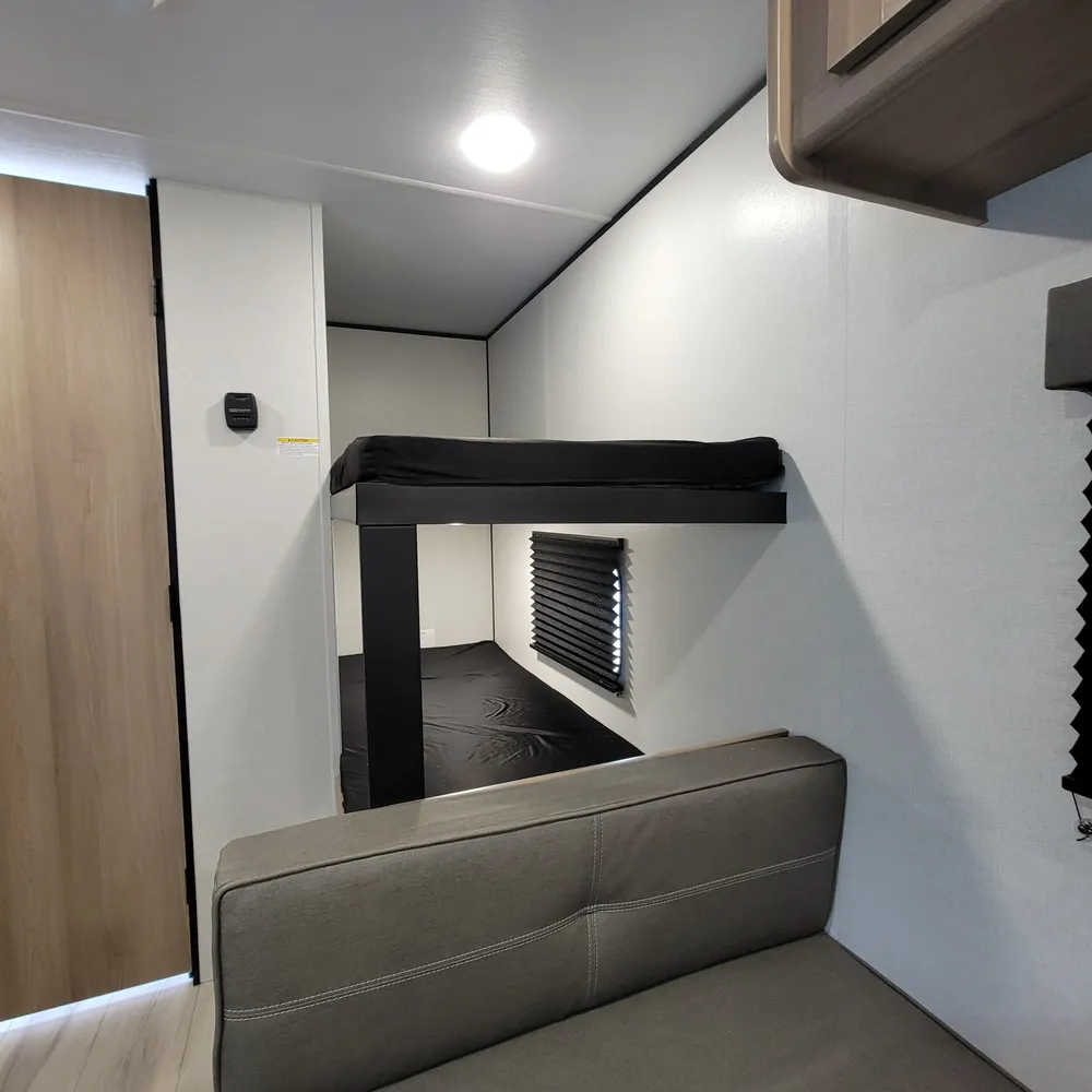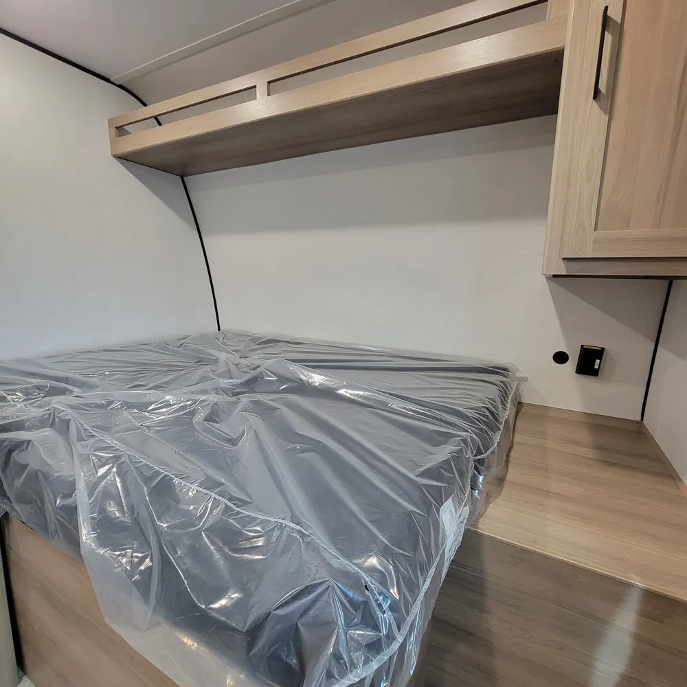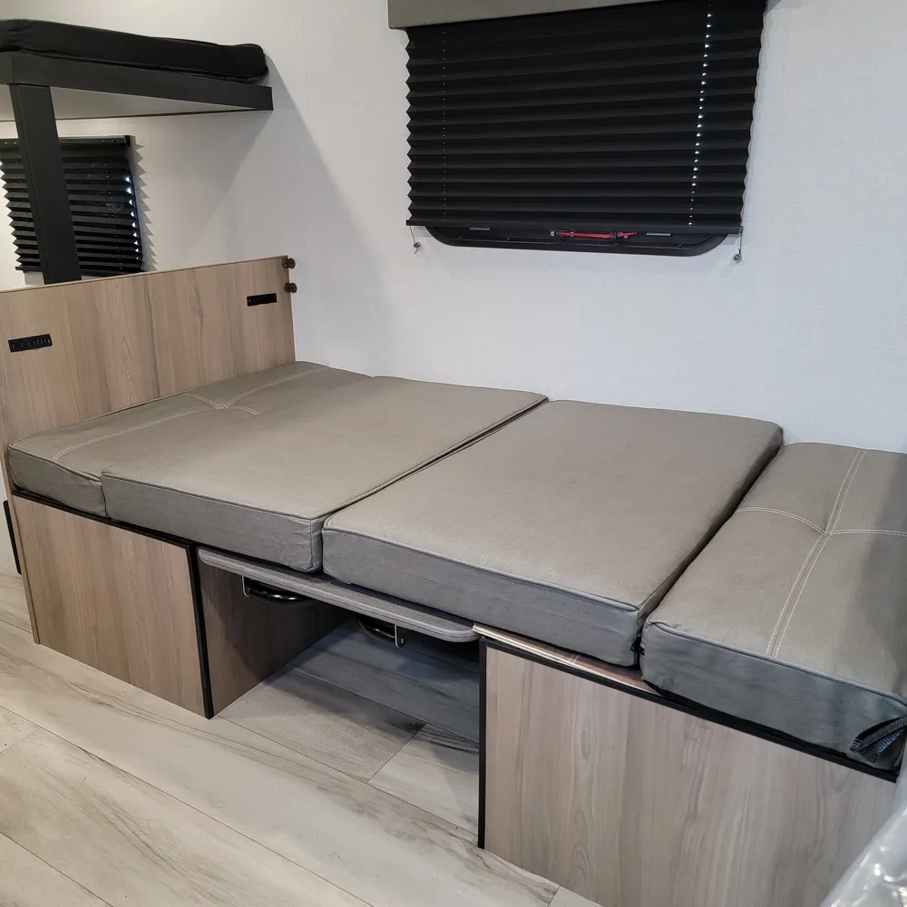 The 17BX features an open-concept layout with the sleeping area up front, including a queen bed with underbed storage, wardrobe, and two single bunks for kids. Multiple bedside outlets and USB charging ports keep devices powered throughout your trip.