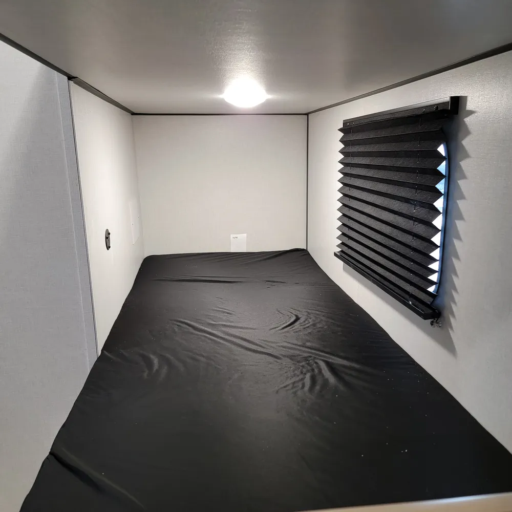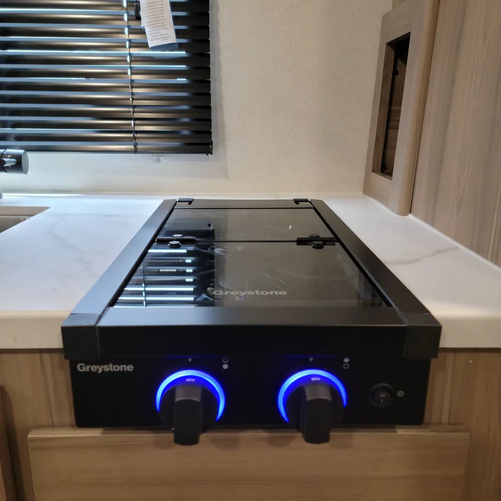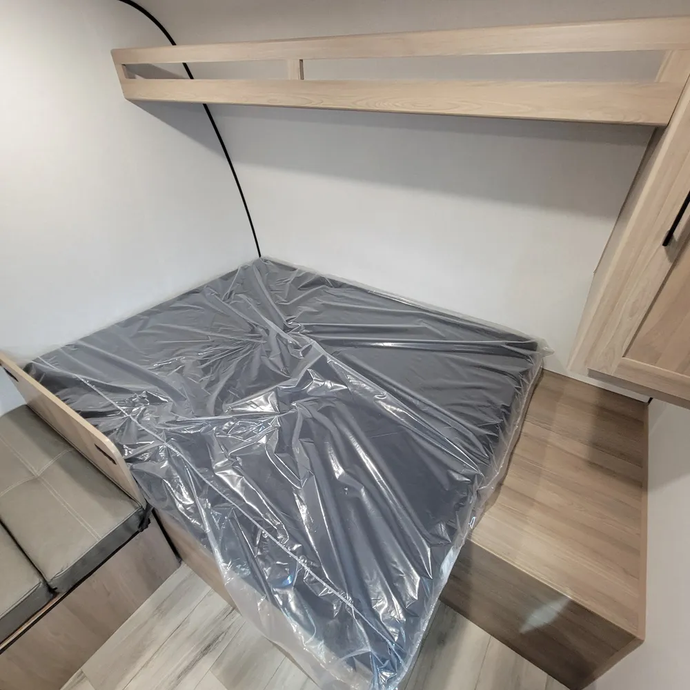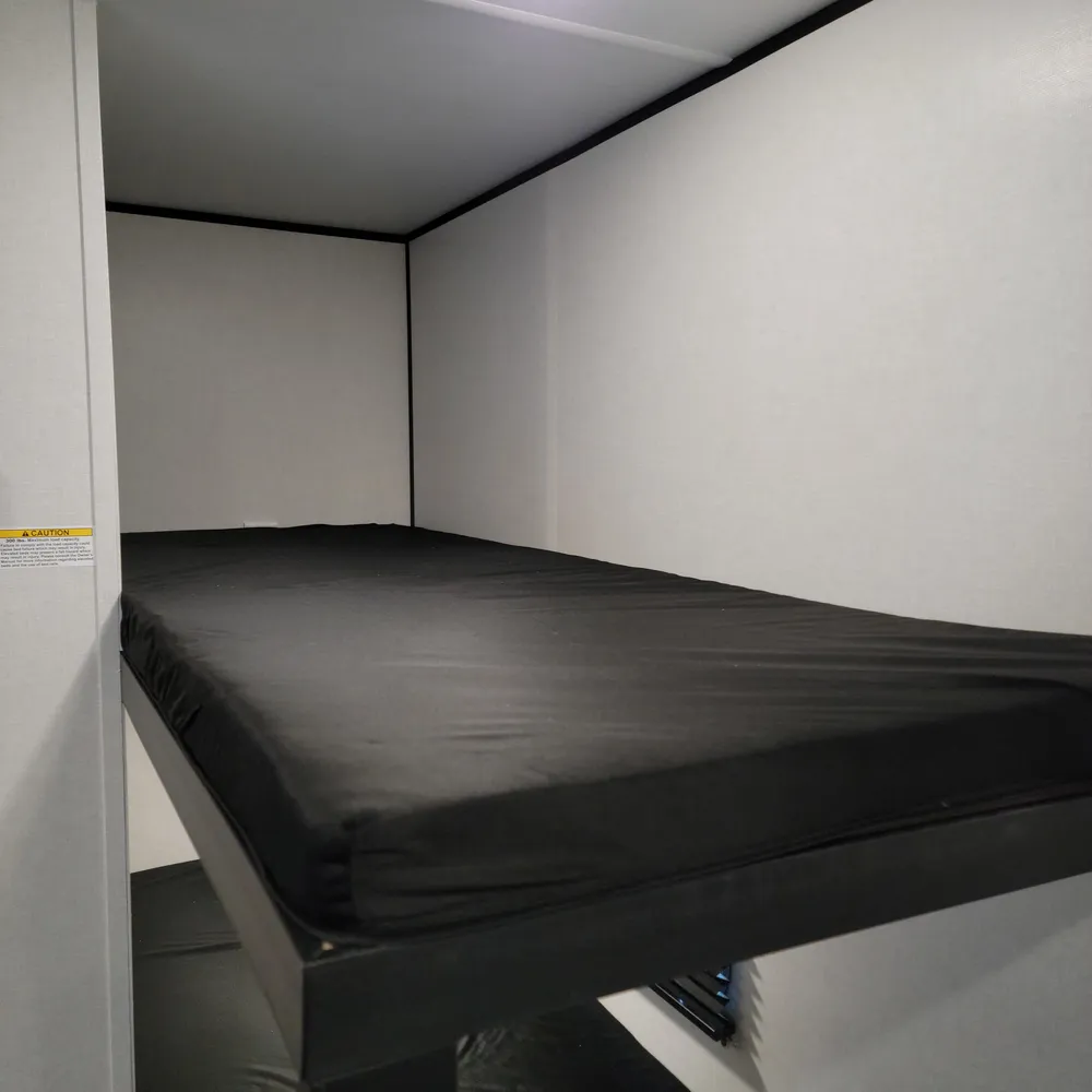The 17BX features an open-concept layout with the sleeping area up front, including a queen bed with underbed storage, wardrobe, and two single bunks for kids. Multiple bedside outlets and USB charging ports keep devices powered throughout your trip.