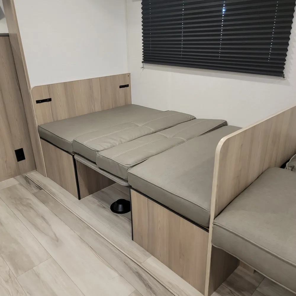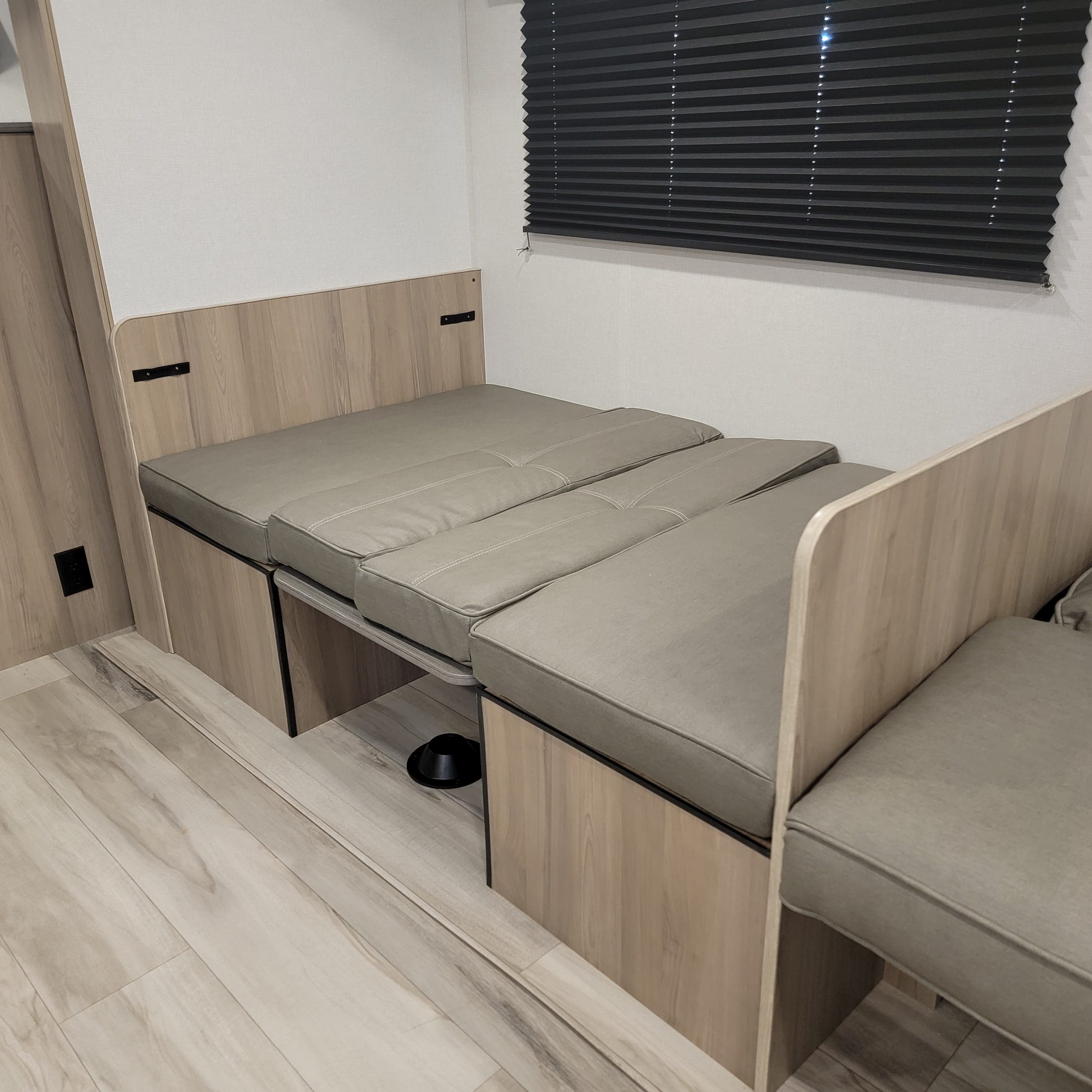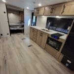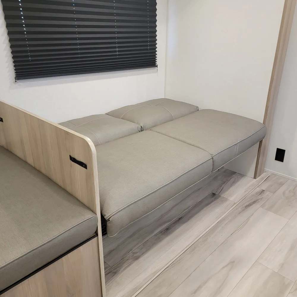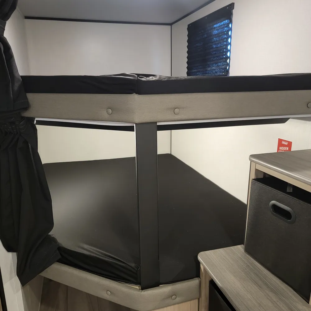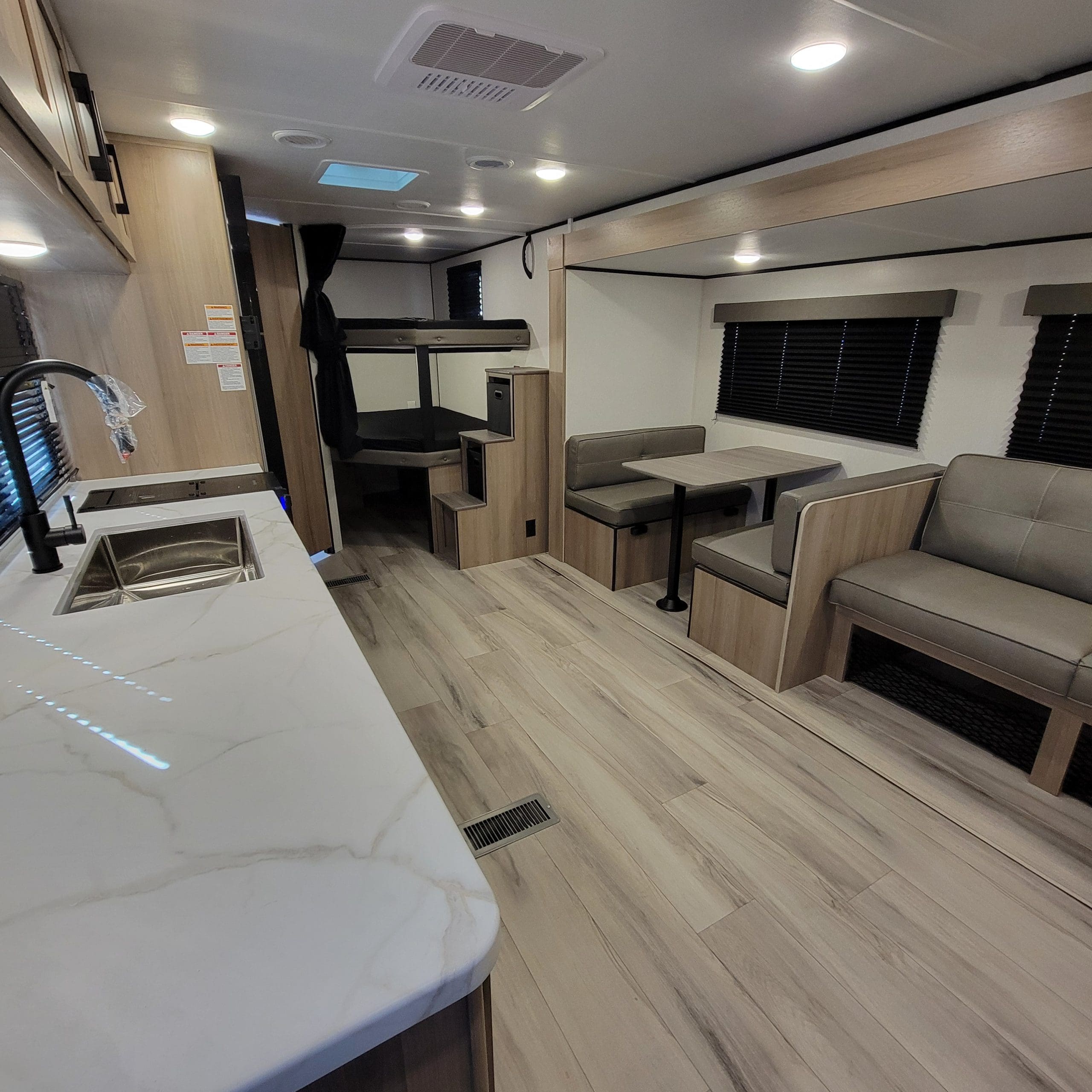 The layout gives kids their own space in the bunks while parents get privacy up front. There’s a full kitchen and plenty of room for the whole family on weekend trips.