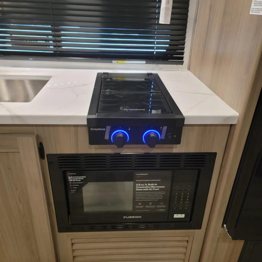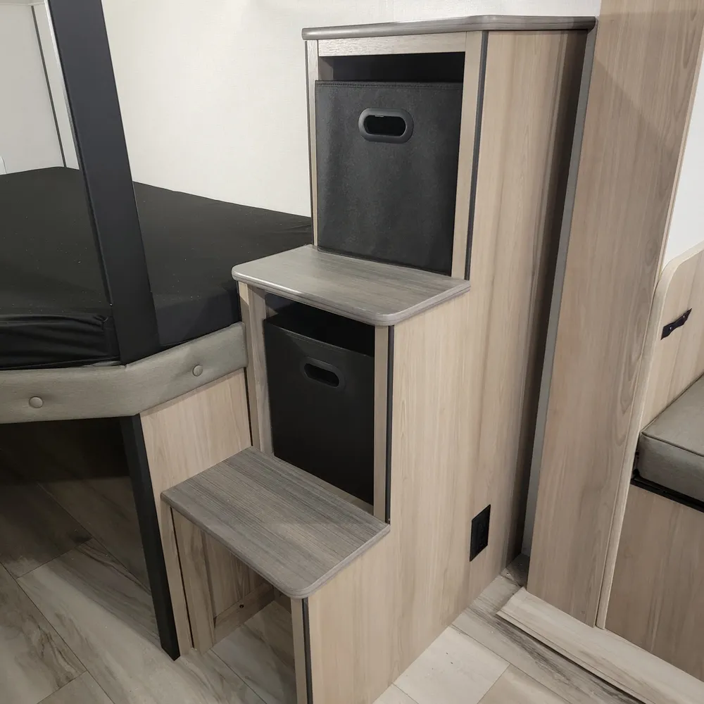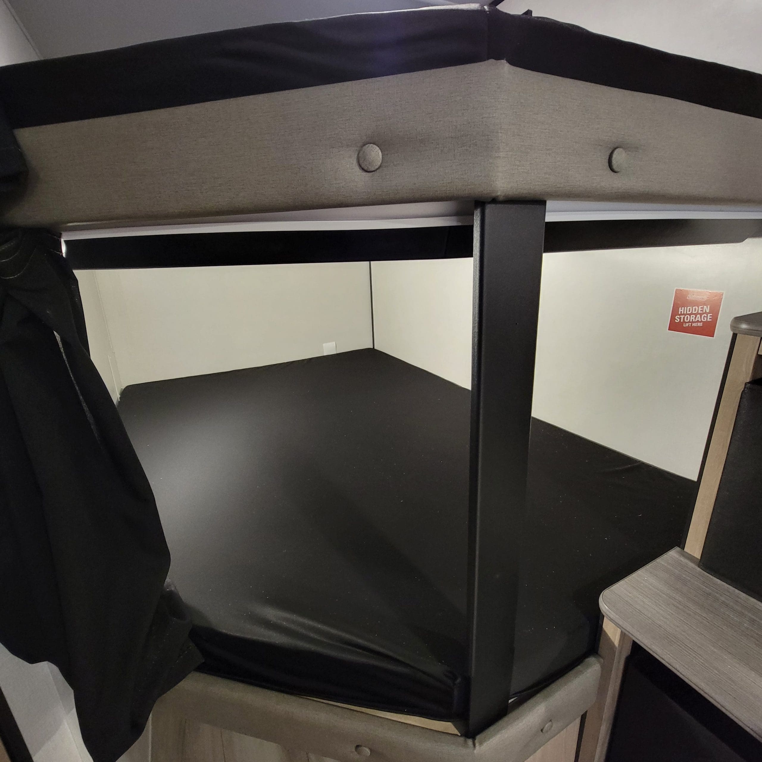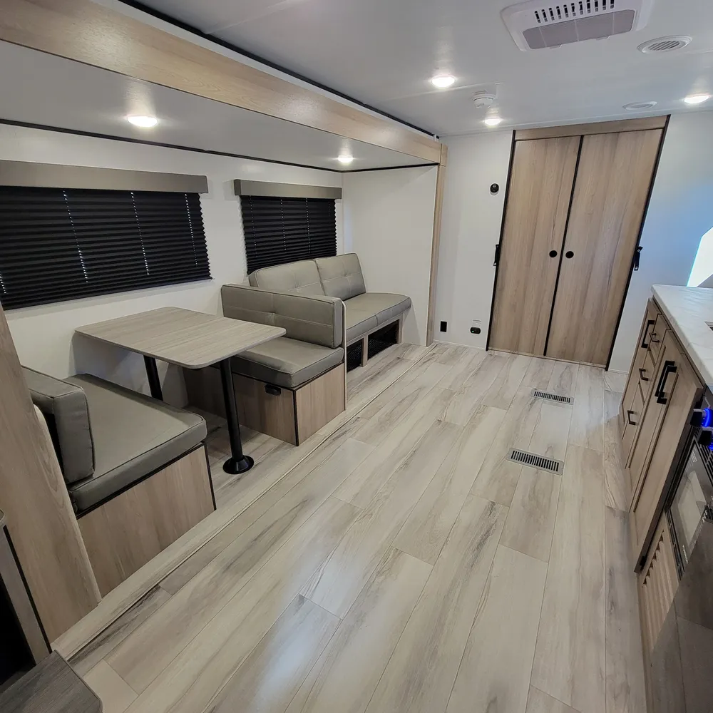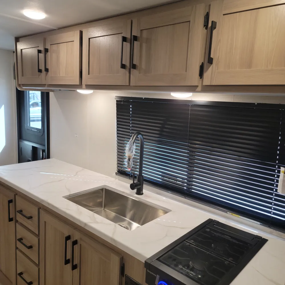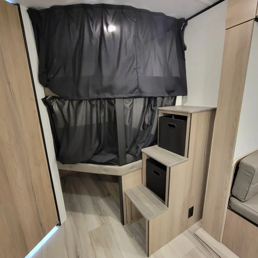 The layout gives kids their own space in the bunks while parents get privacy up front. There’s a full kitchen and plenty of room for the whole family on weekend trips.