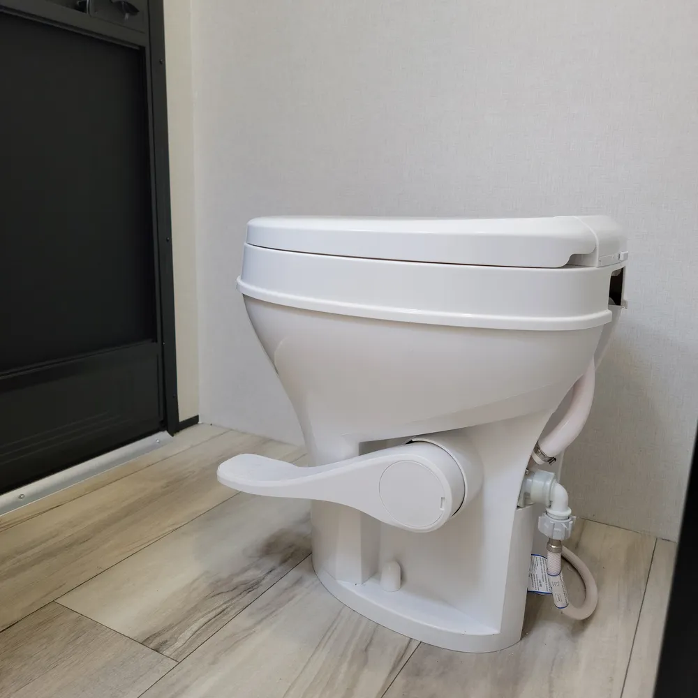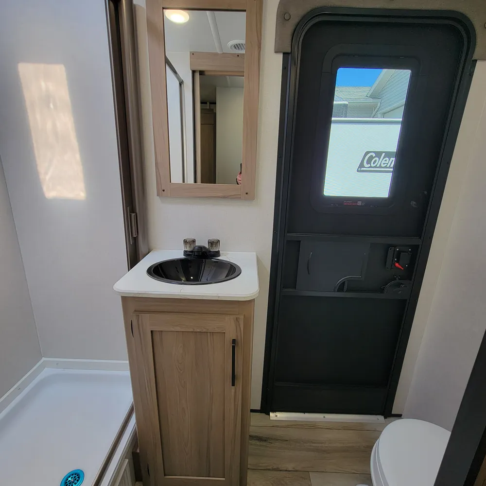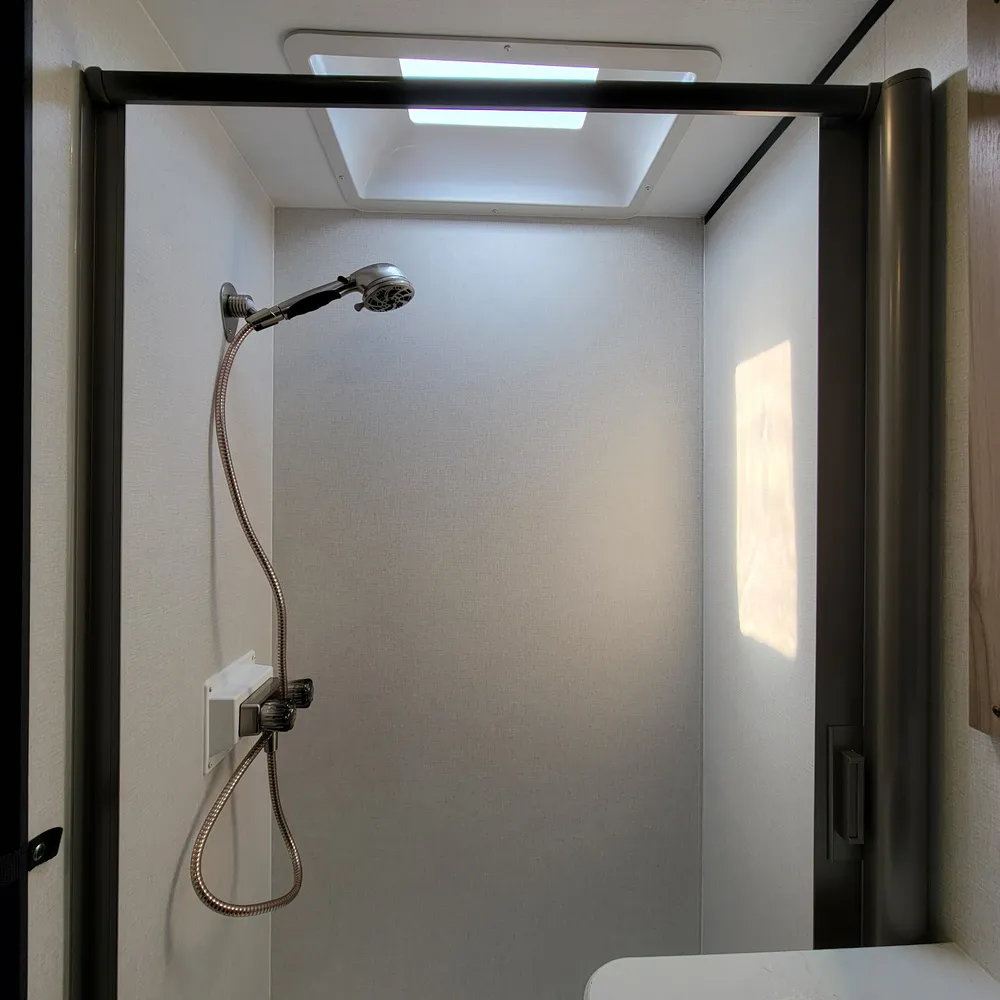 The full bathroom includes a shower with skylight, retractable shower door, upgraded Oxygenics Fury showerhead, vanity sink and foot lush toilet. A second entry door provides direct access to the bathroom from outside, keeping the main living area clean when coming in from outdoors.