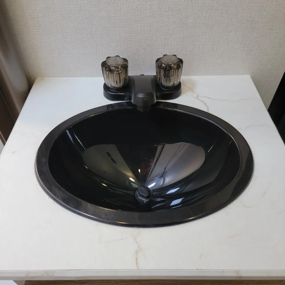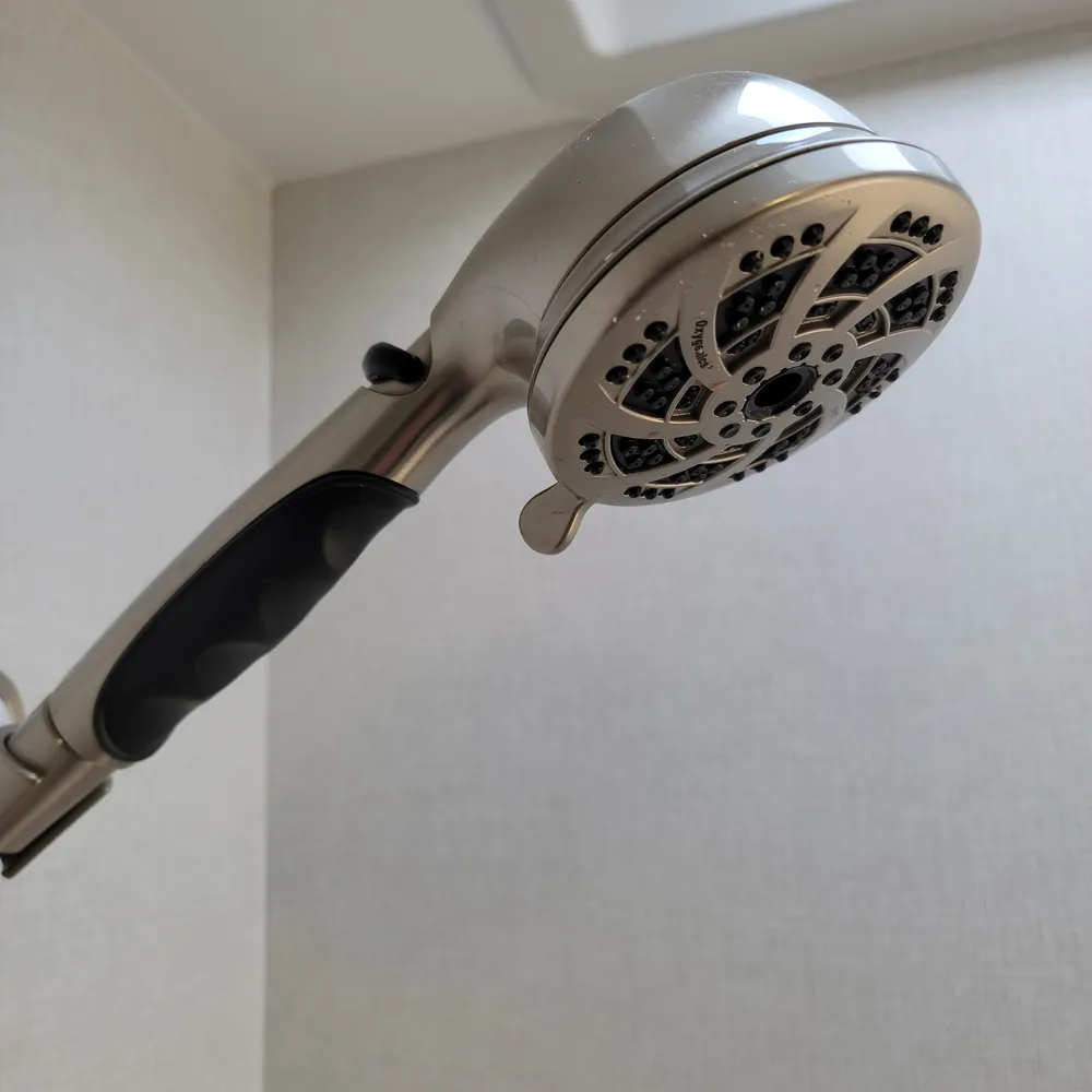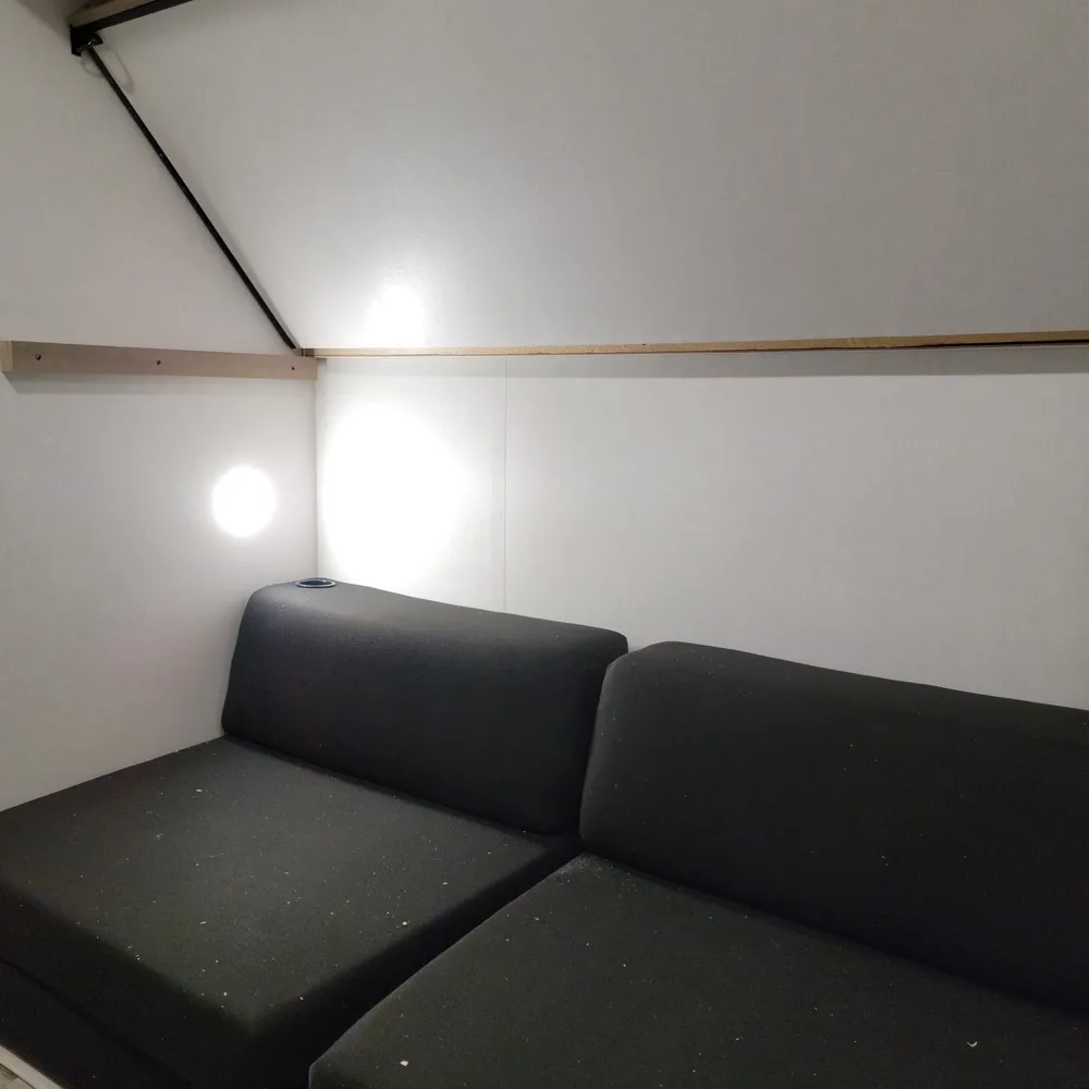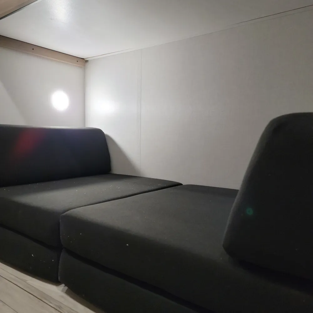 The full bathroom includes a shower with skylight, retractable shower door, upgraded Oxygenics Fury showerhead, vanity sink and foot lush toilet. A second entry door provides direct access to the bathroom from outside, keeping the main living area clean when coming in from outdoors.