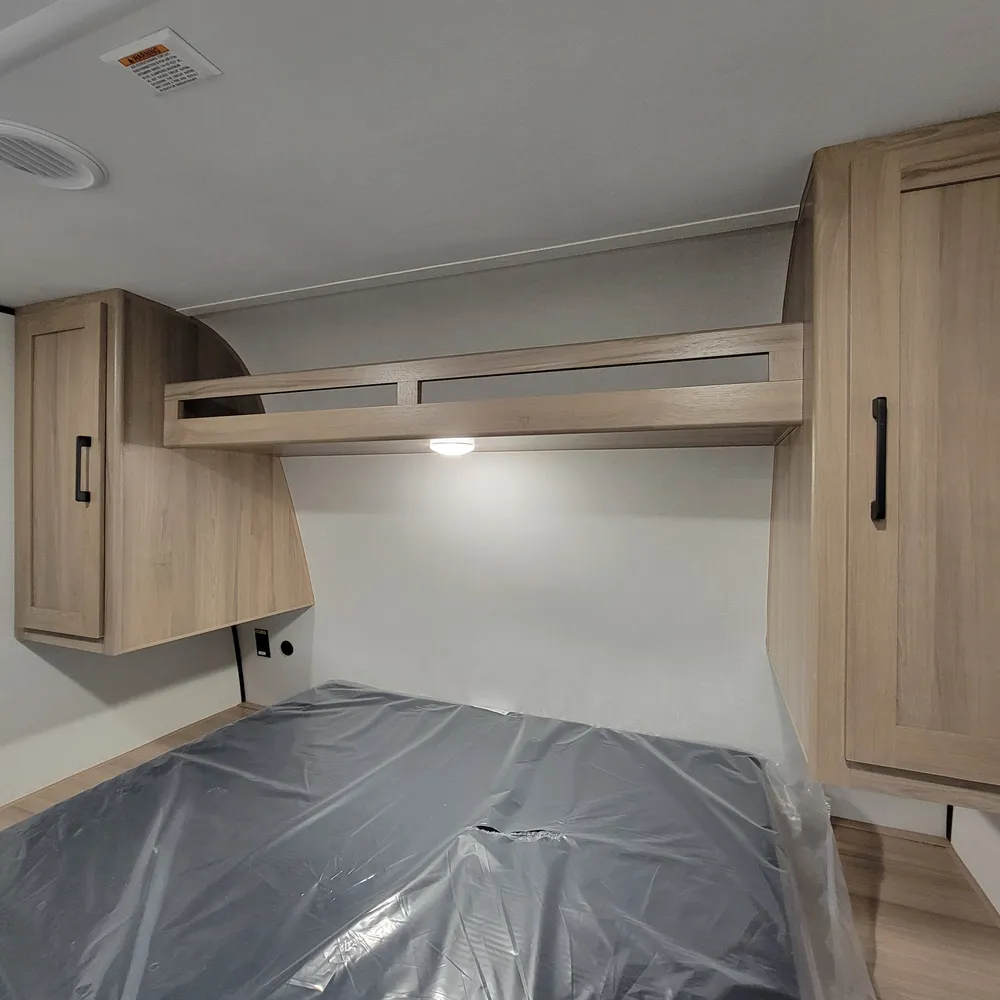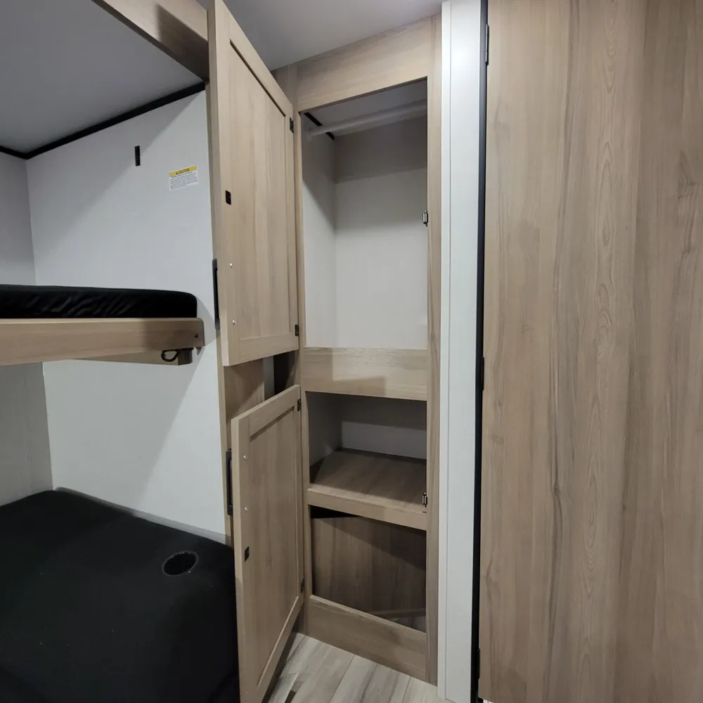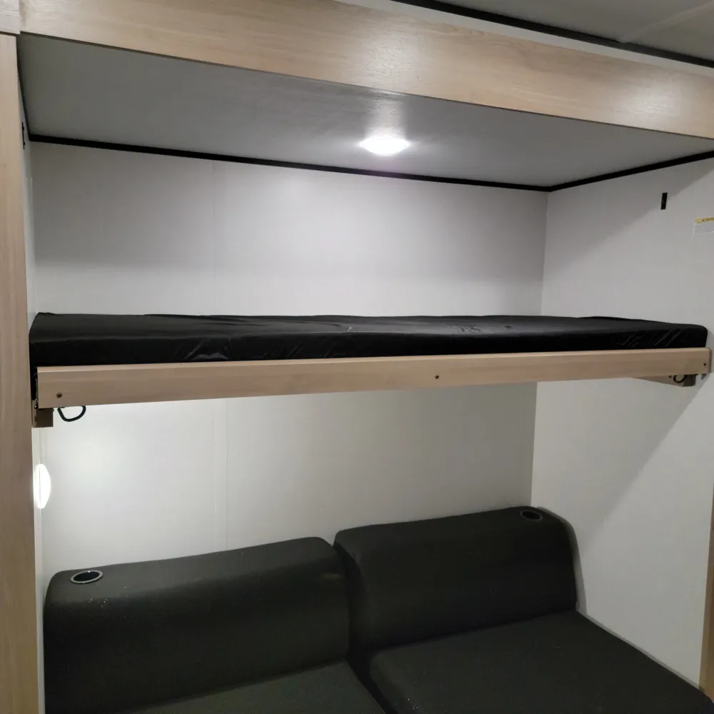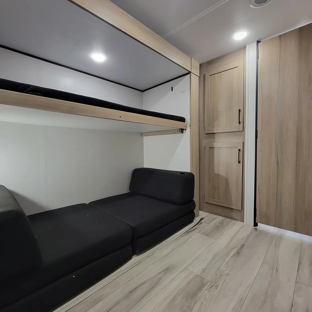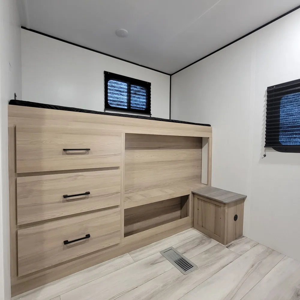 Built with an I-beam frame, heated and enclosed underbelly, and Tru-Fit slide construction. The 15,000 BTU ducted air conditioner and 35,000 BTU furnace combine with a 42,000 BTU Suburban tankless water heater. Power tongue jack, power awning, full pass-through storage with extra tall doors, exterior shower, and blackout night shades throughout complete this family bunkhouse trailer.