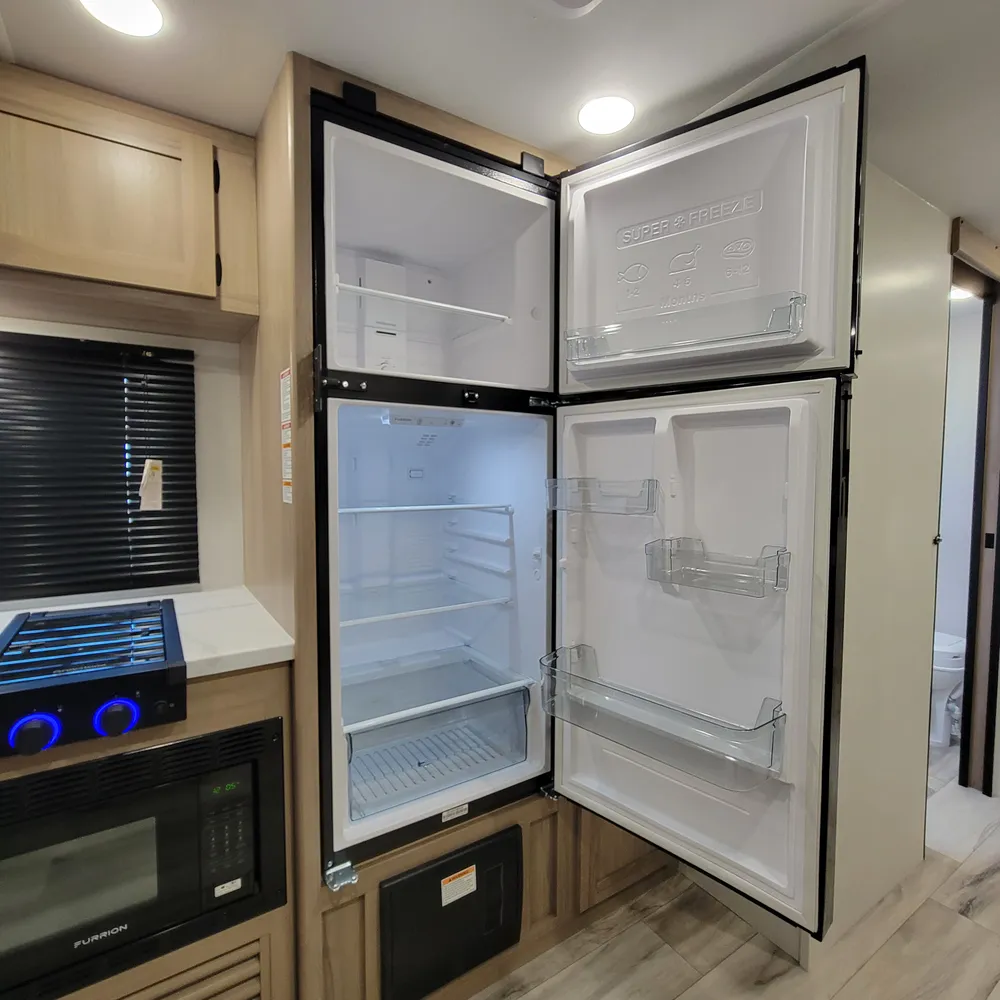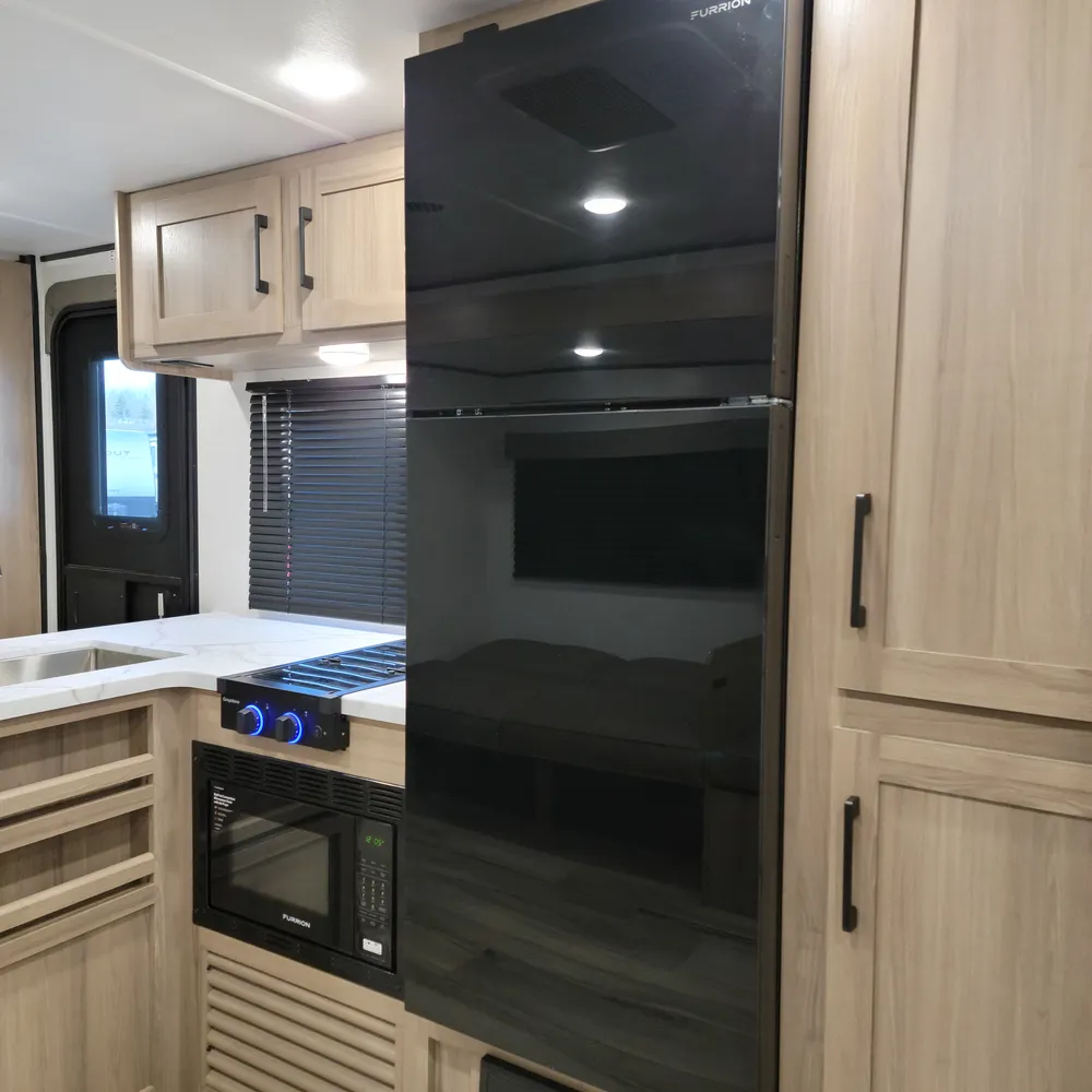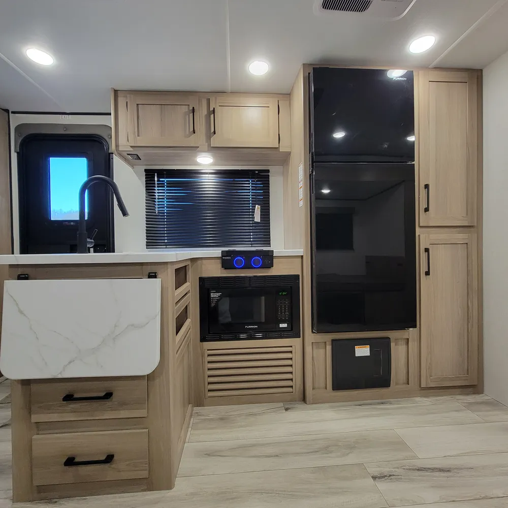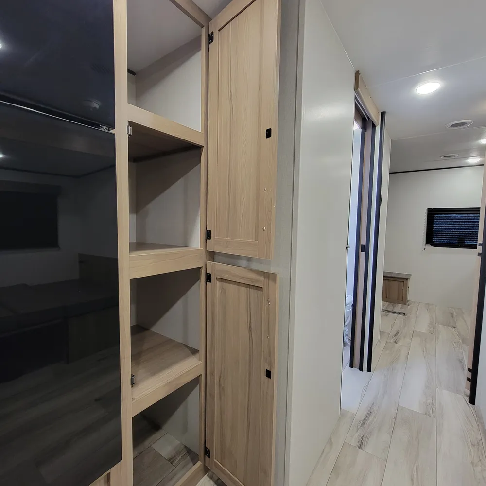 Built with an I-beam frame, heated and enclosed underbelly, and Tru-Fit slide construction. The 15,000 BTU ducted air conditioner and 35,000 BTU furnace combine with a 42,000 BTU Suburban tankless water heater. Power tongue jack, power awning, full pass-through storage with extra tall doors, exterior shower, and blackout night shades throughout complete this family bunkhouse trailer.