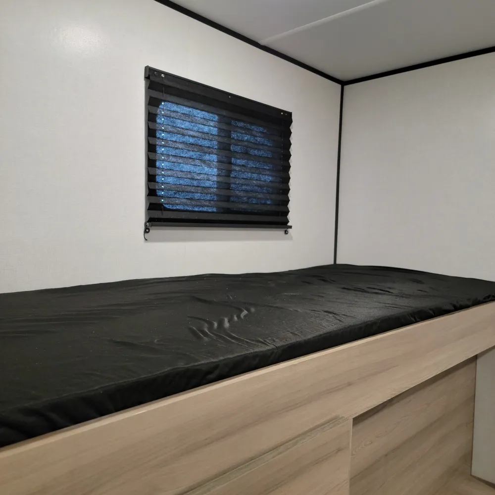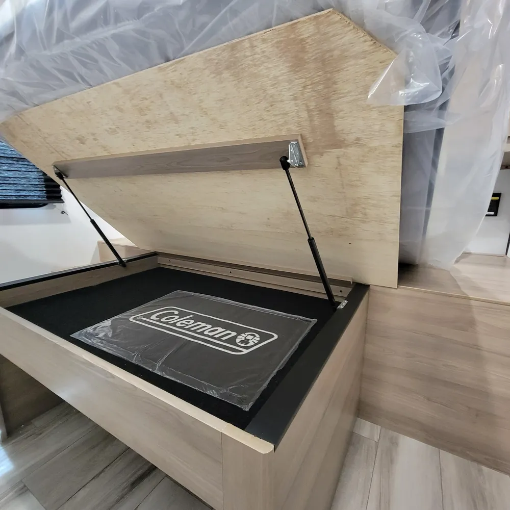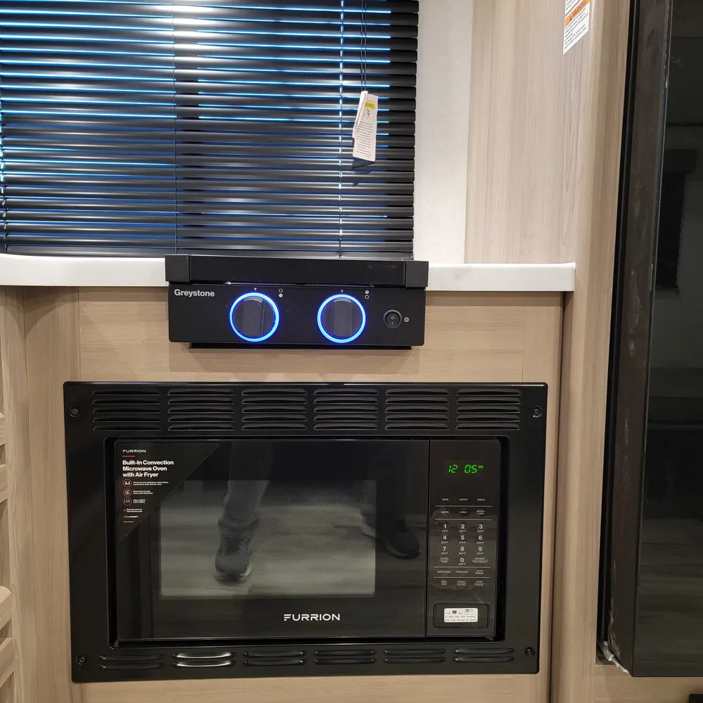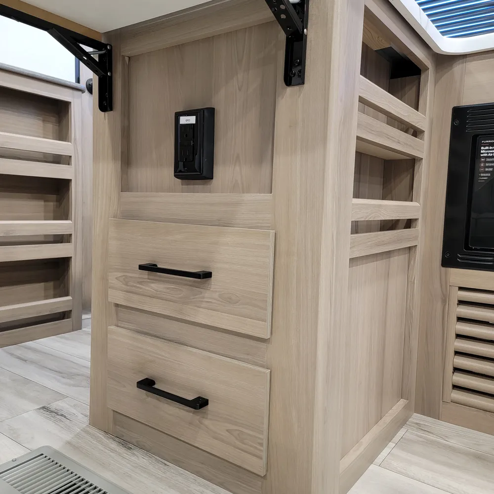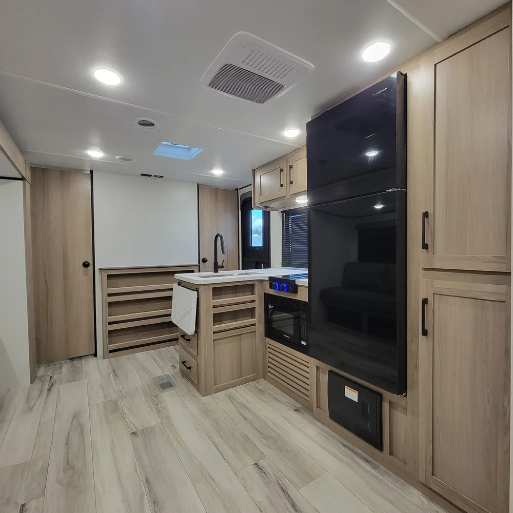 Built with an I-beam frame, heated and enclosed underbelly, and Tru-Fit slide construction. The 15,000 BTU ducted air conditioner and 35,000 BTU furnace combine with a 42,000 BTU Suburban tankless water heater. Power tongue jack, power awning, full pass-through storage with extra tall doors, exterior shower, and blackout night shades throughout complete this family bunkhouse trailer.