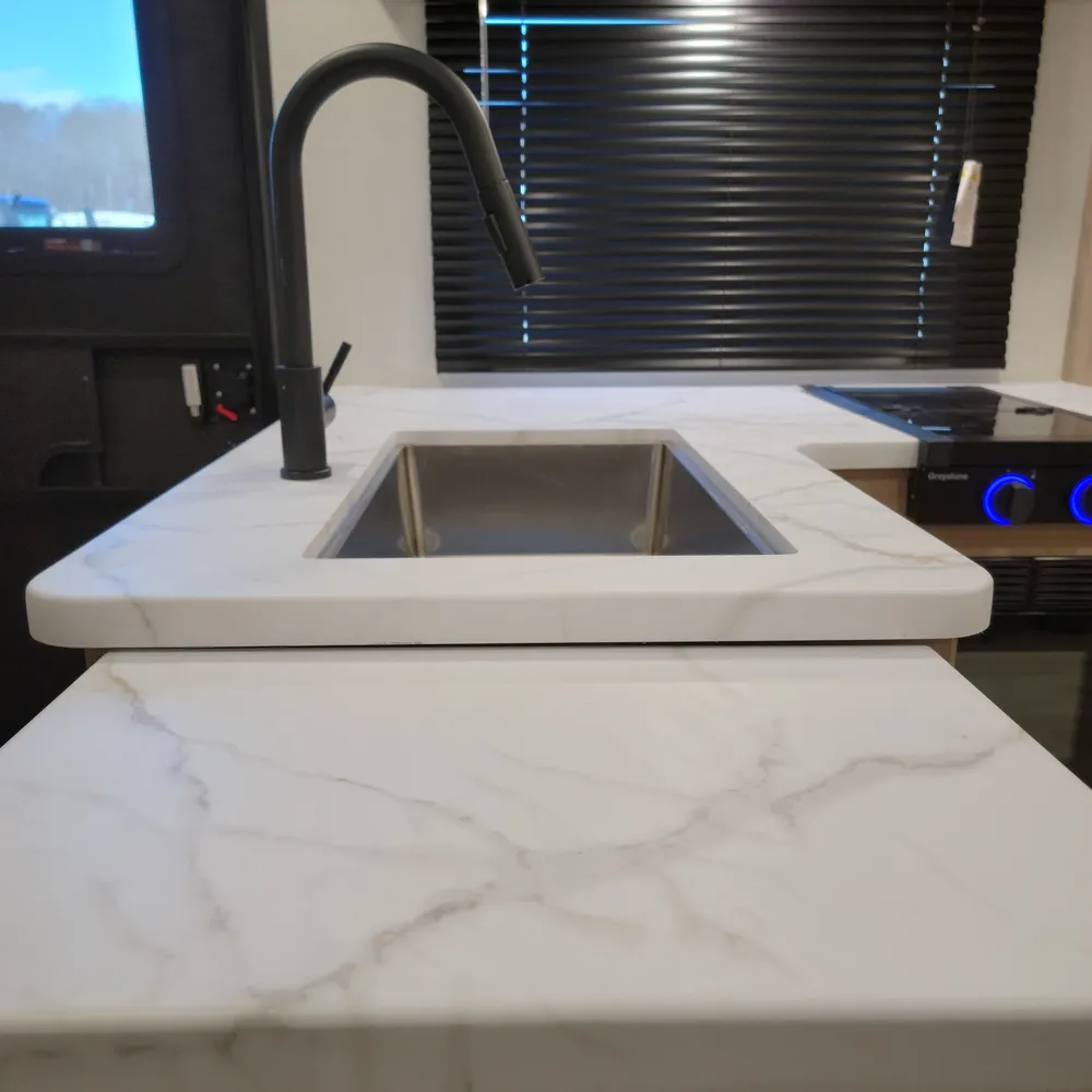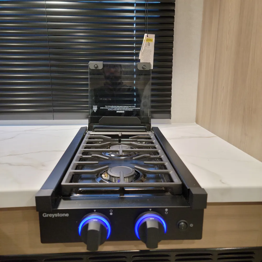 The main living area features a large super slideout with sofa and booth dinette, creating an open entertaining space. The kitchen offers seamless countertops, stainless steel sink, high-rise faucet with pullout sprayer, 2-burner gas range, air fryer/convection/microwave combo, 8 cubic foot 12V refrigerator, and dedicated trash can storage.  An outside kitchen with 2.6 cubic foot refrigerator and sink extends your cooking and entertaining space outdoors.