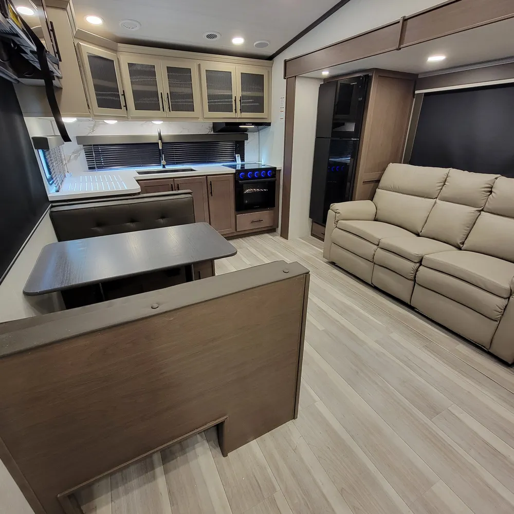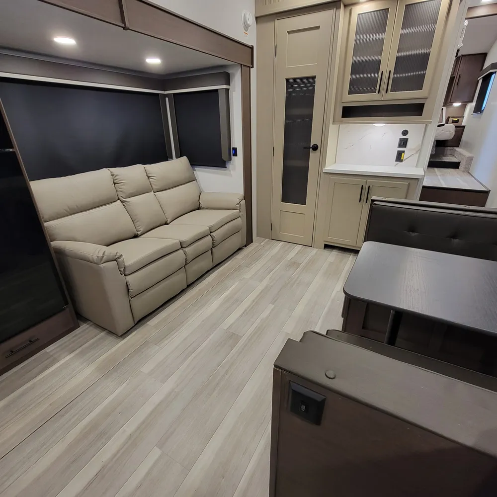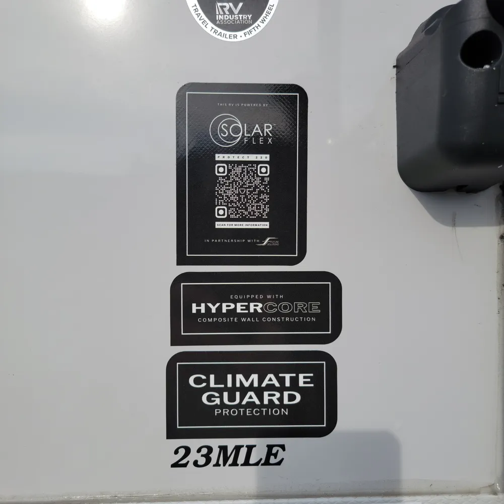The 2026 Cougar Half-Ton 23MLE is a compact, lightweight fifth wheel designed for half-ton trucks, featuring a private front bedroom, a rear chef’s kitchen, and flexible sleeping arrangements for 5-6 people with a standard tri-fold sofa or optional theater seating and booth dinette. Key features include a hutch, significant pass-through storage, & an outdoor fridge. The coach is built with a Climate Guard protection package, HyperCore composite sidewalls, and HyperDeck flooring for durability.