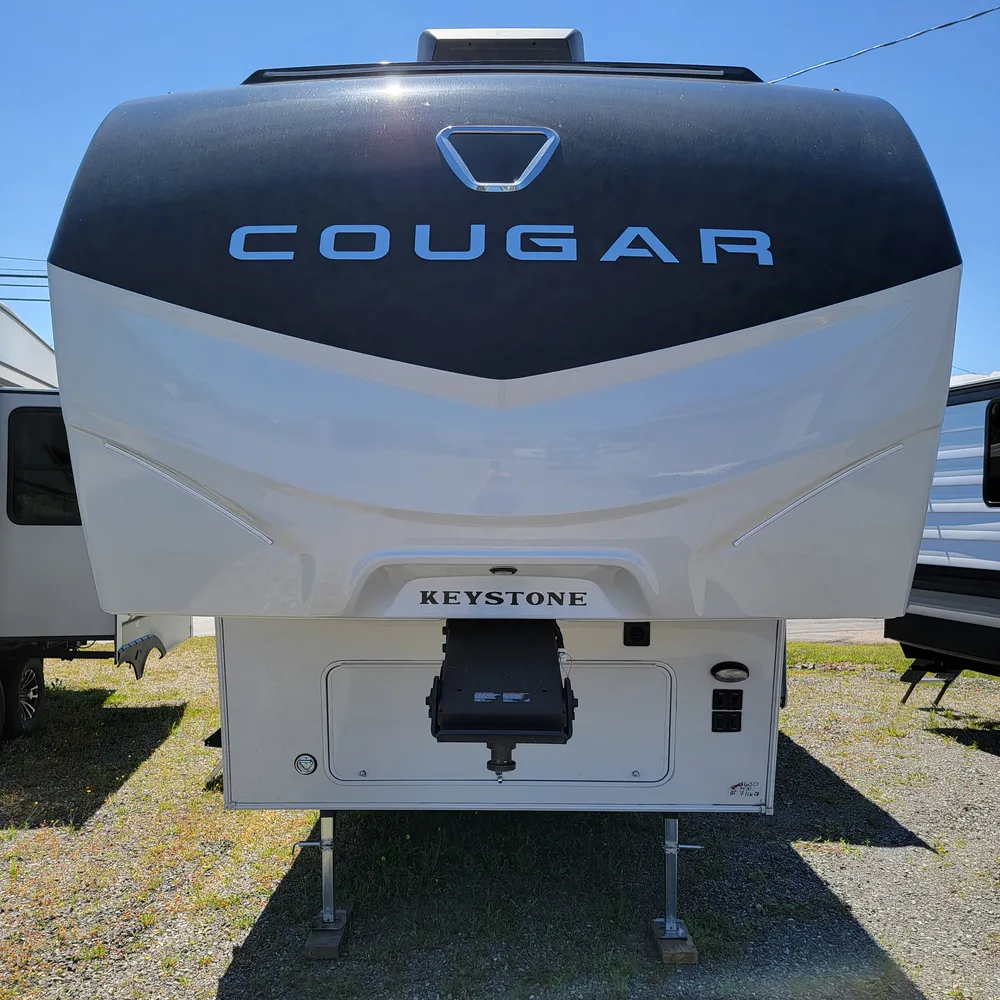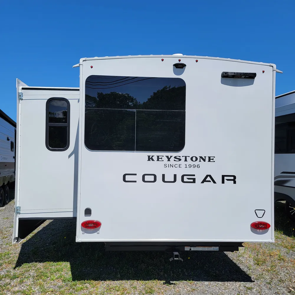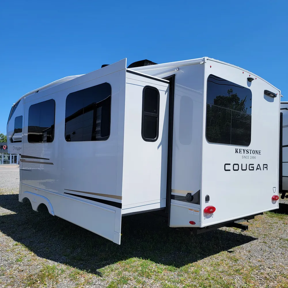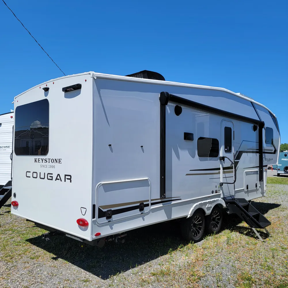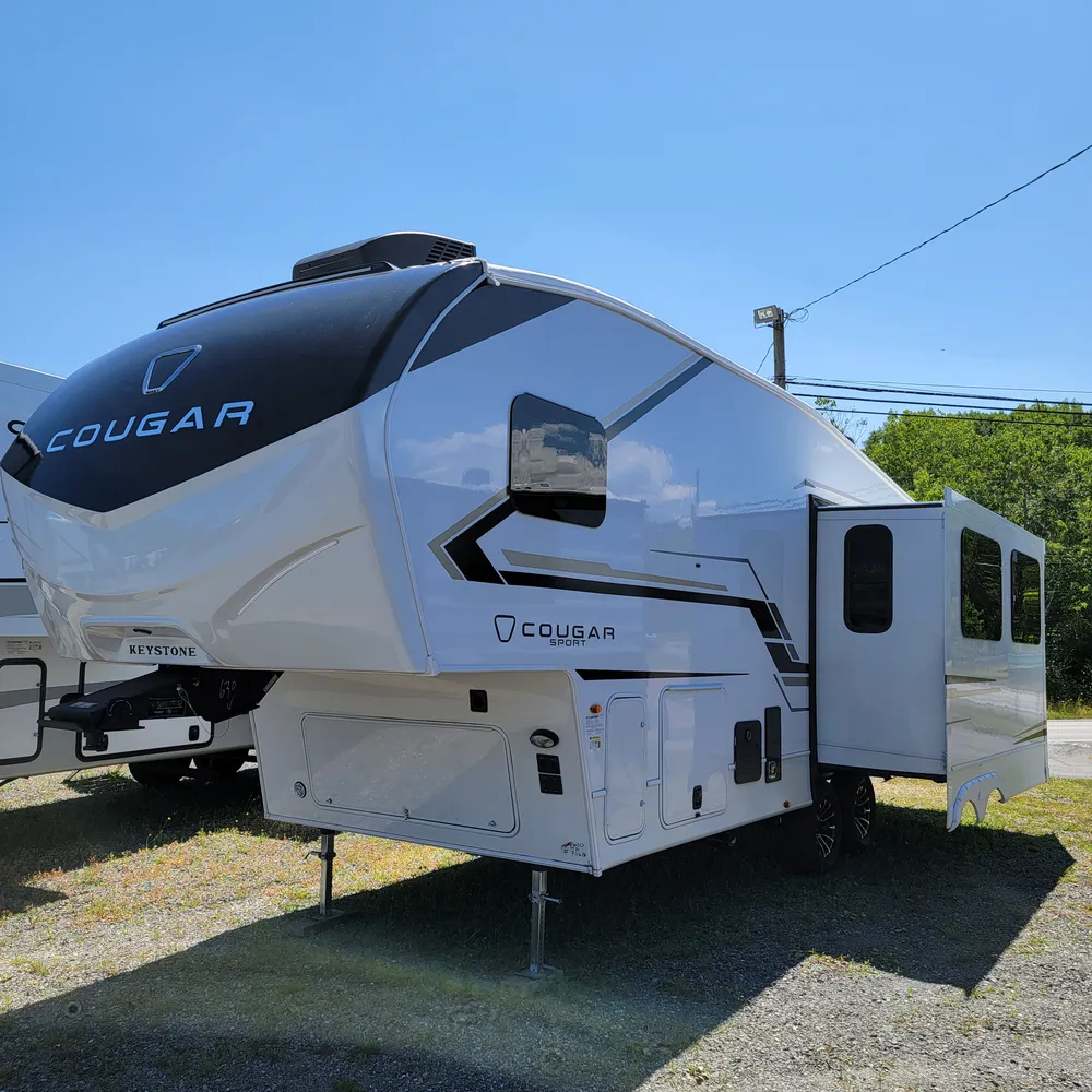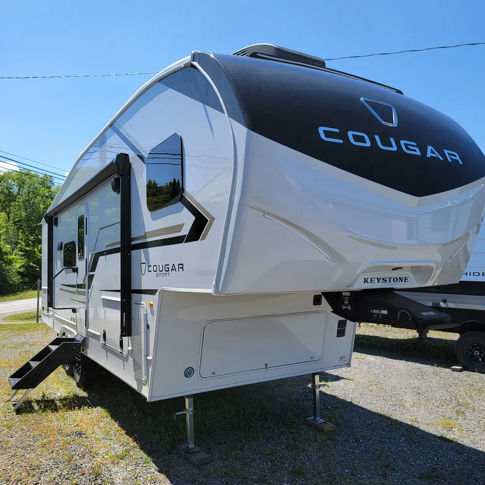 The 2026 Cougar Sport 2400RE is a fifth-wheel RV designed with a focus on lightweight towing and a spacious interior. It features a combined kitchen and living space with a large slide-out, a rear kitchen with a butler pantry, and a private front bedroom. The 2400RE is part of the Cougar Sport line, known for being smaller and lighter than the standard Cougar models, making it easier to tow.