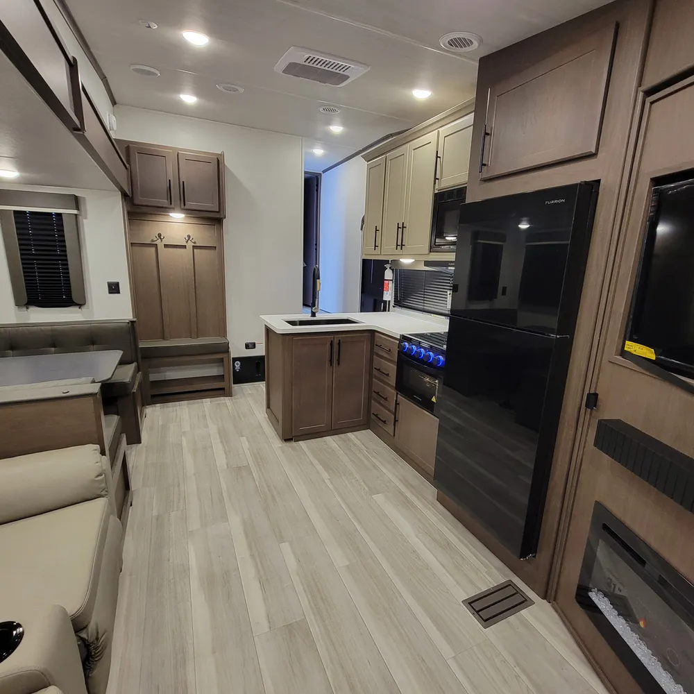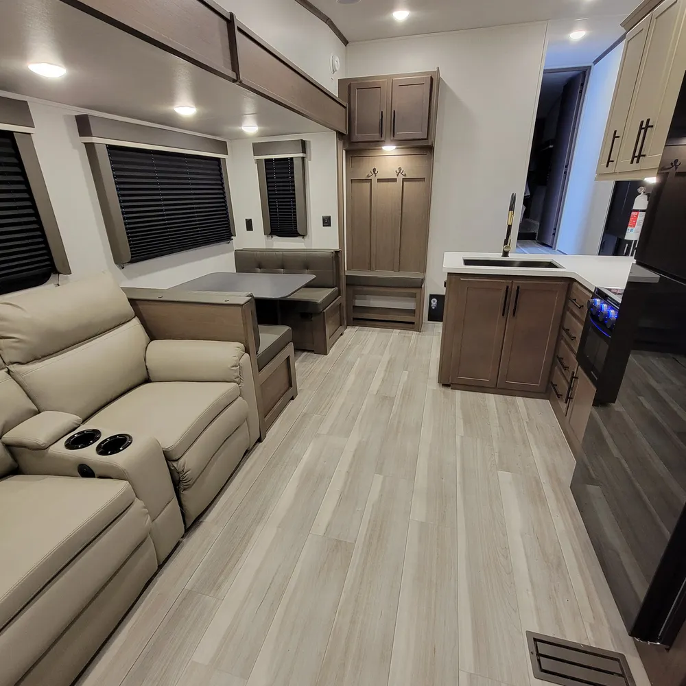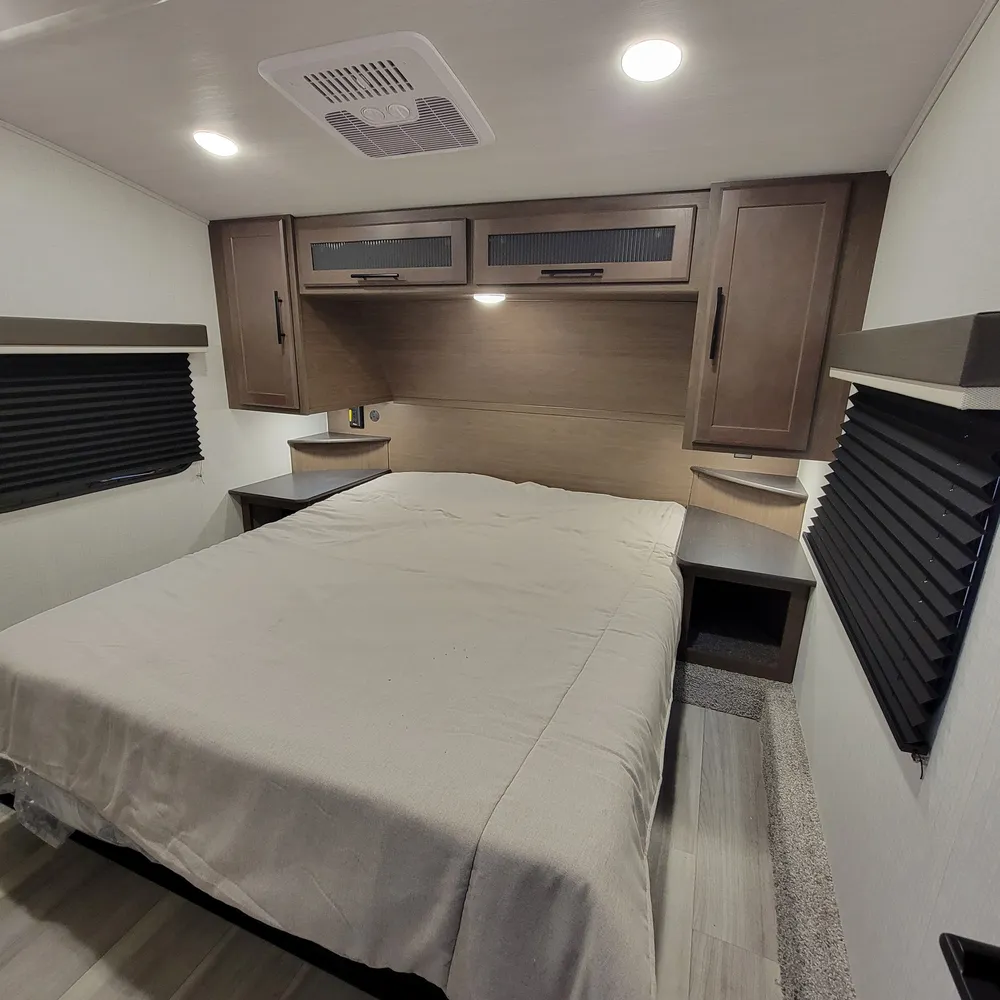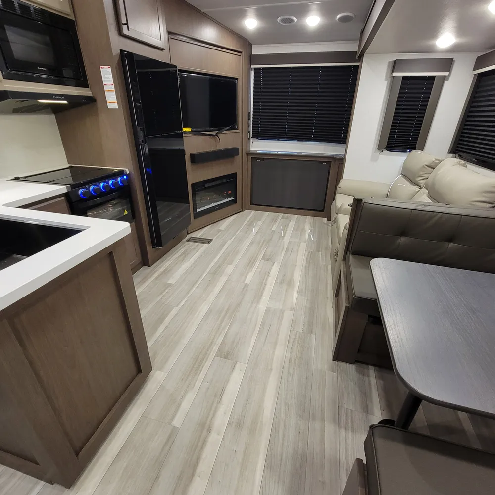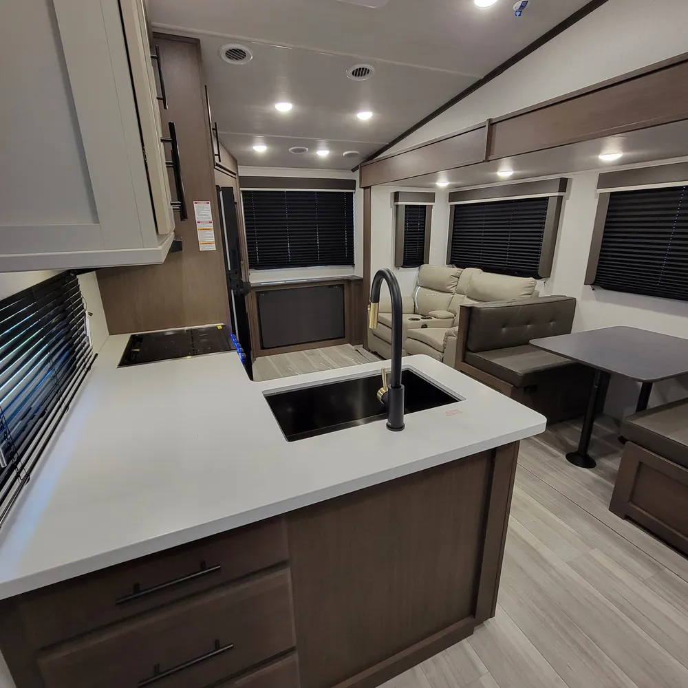 The 2026 Cougar Sport 2400RE is a fifth-wheel RV designed with a focus on lightweight towing and a spacious interior. It features a combined kitchen and living space with a large slide-out, a rear kitchen with a butler pantry, and a private front bedroom. The 2400RE is part of the Cougar Sport line, known for being smaller and lighter than the standard Cougar models, making it easier to tow.