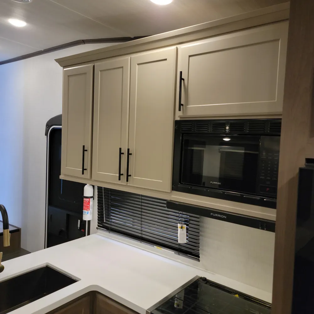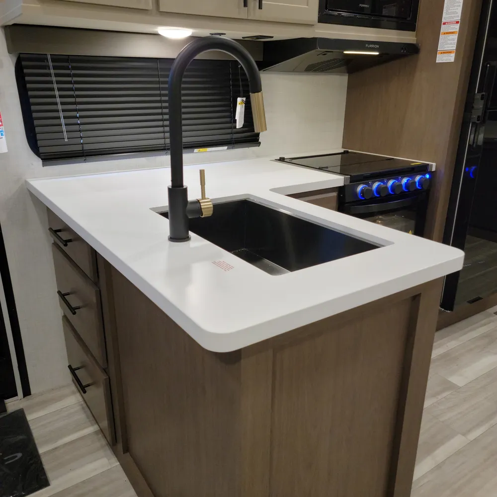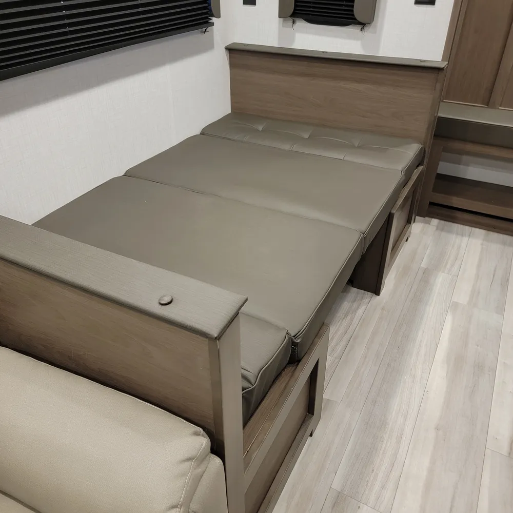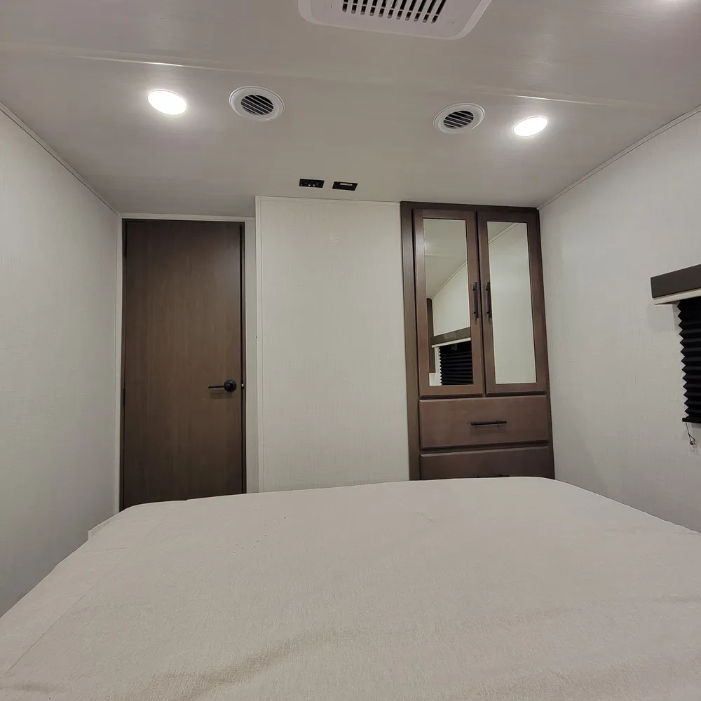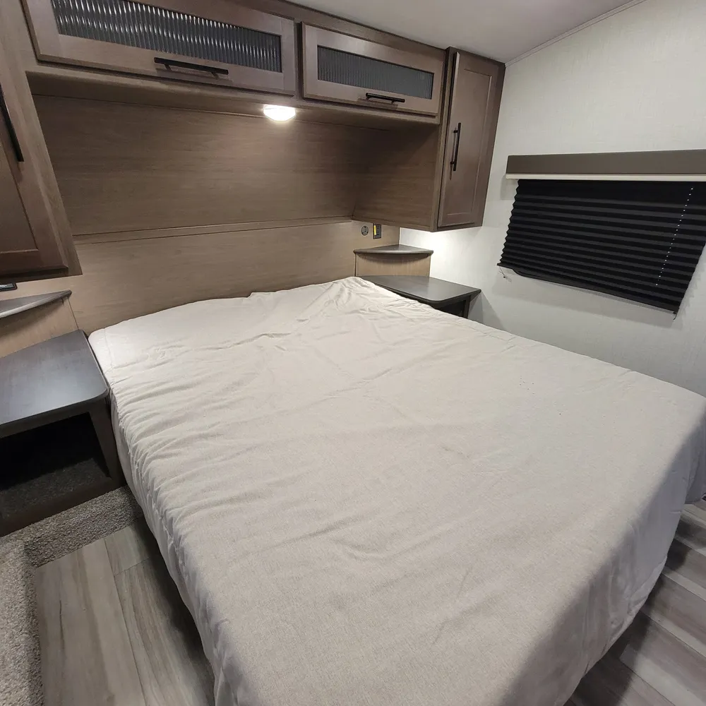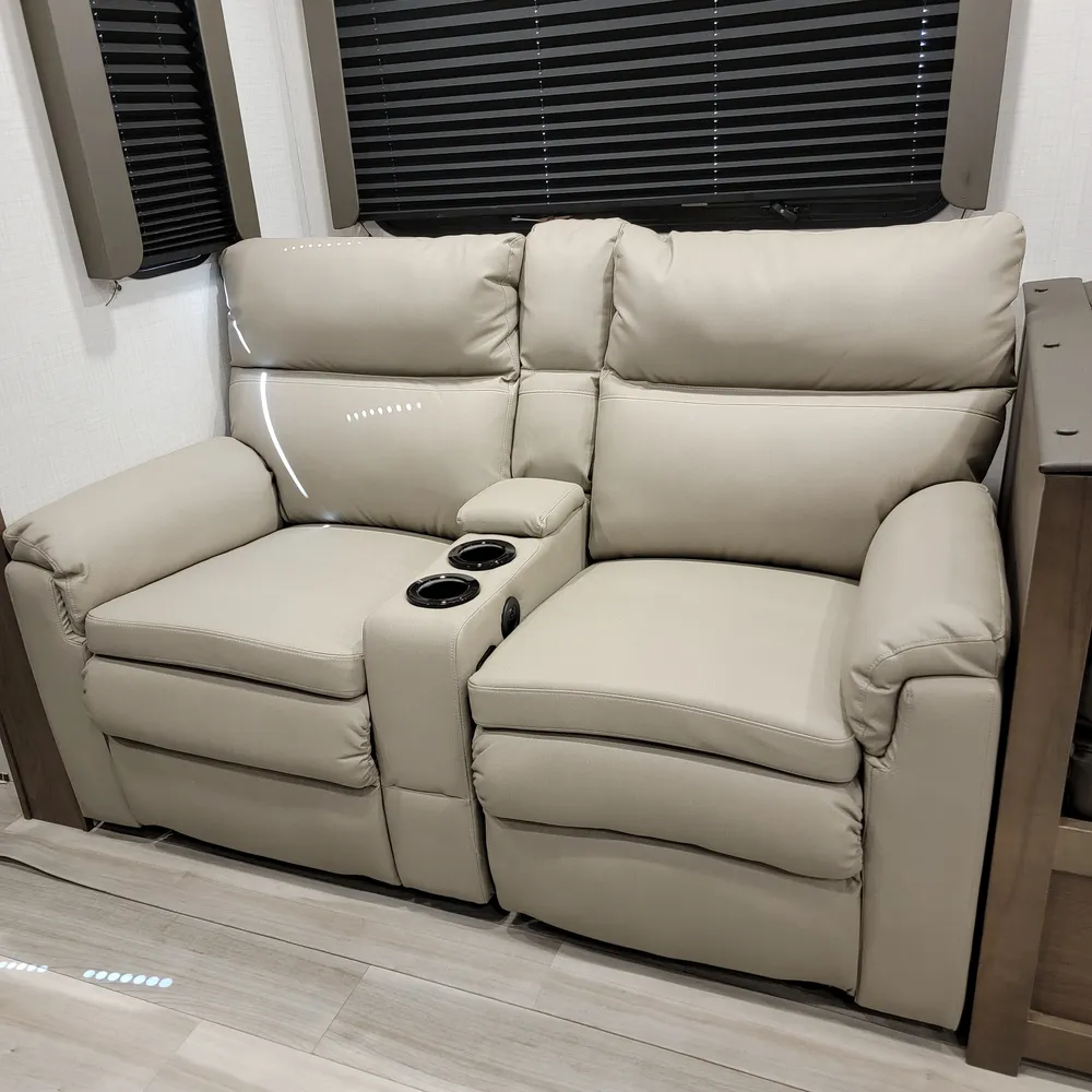 The 2026 Cougar Sport 2400RE is a fifth-wheel RV designed with a focus on lightweight towing and a spacious interior. It features a combined kitchen and living space with a large slide-out, a rear kitchen with a butler pantry, and a private front bedroom. The 2400RE is part of the Cougar Sport line, known for being smaller and lighter than the standard Cougar models, making it easier to tow.
