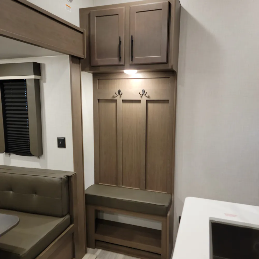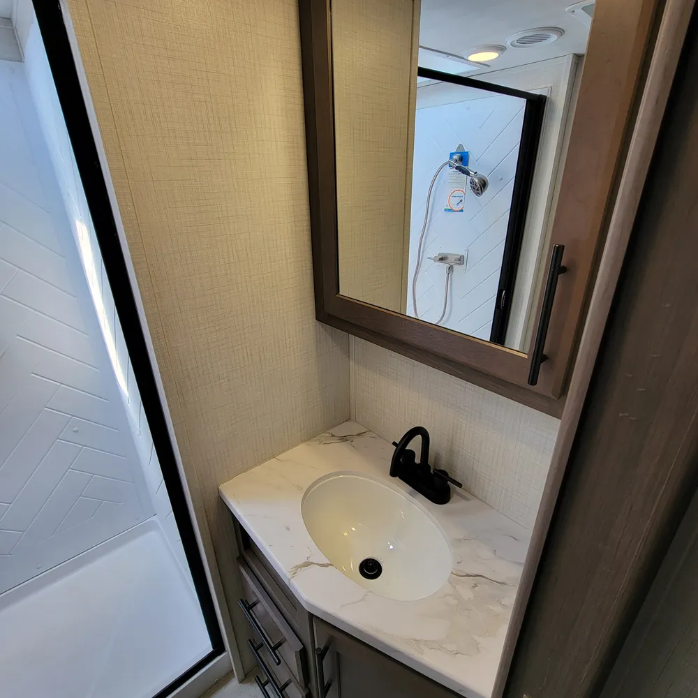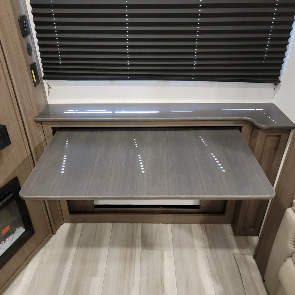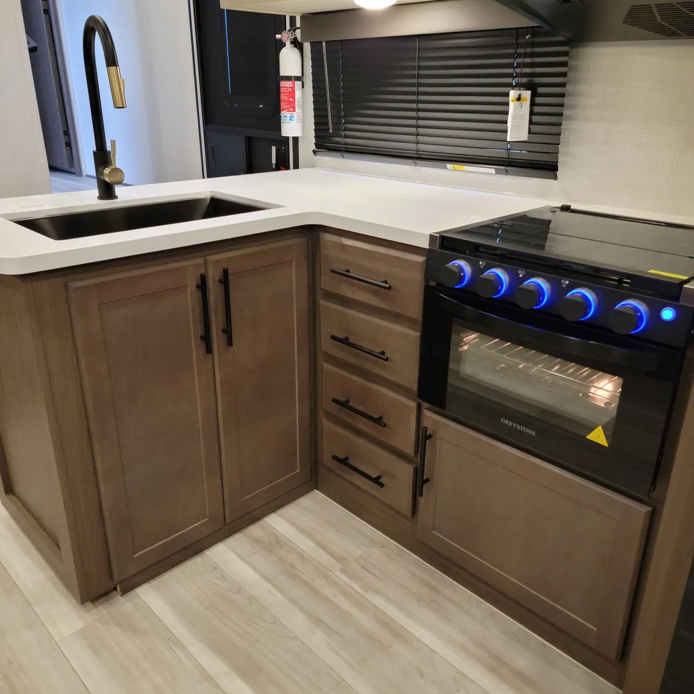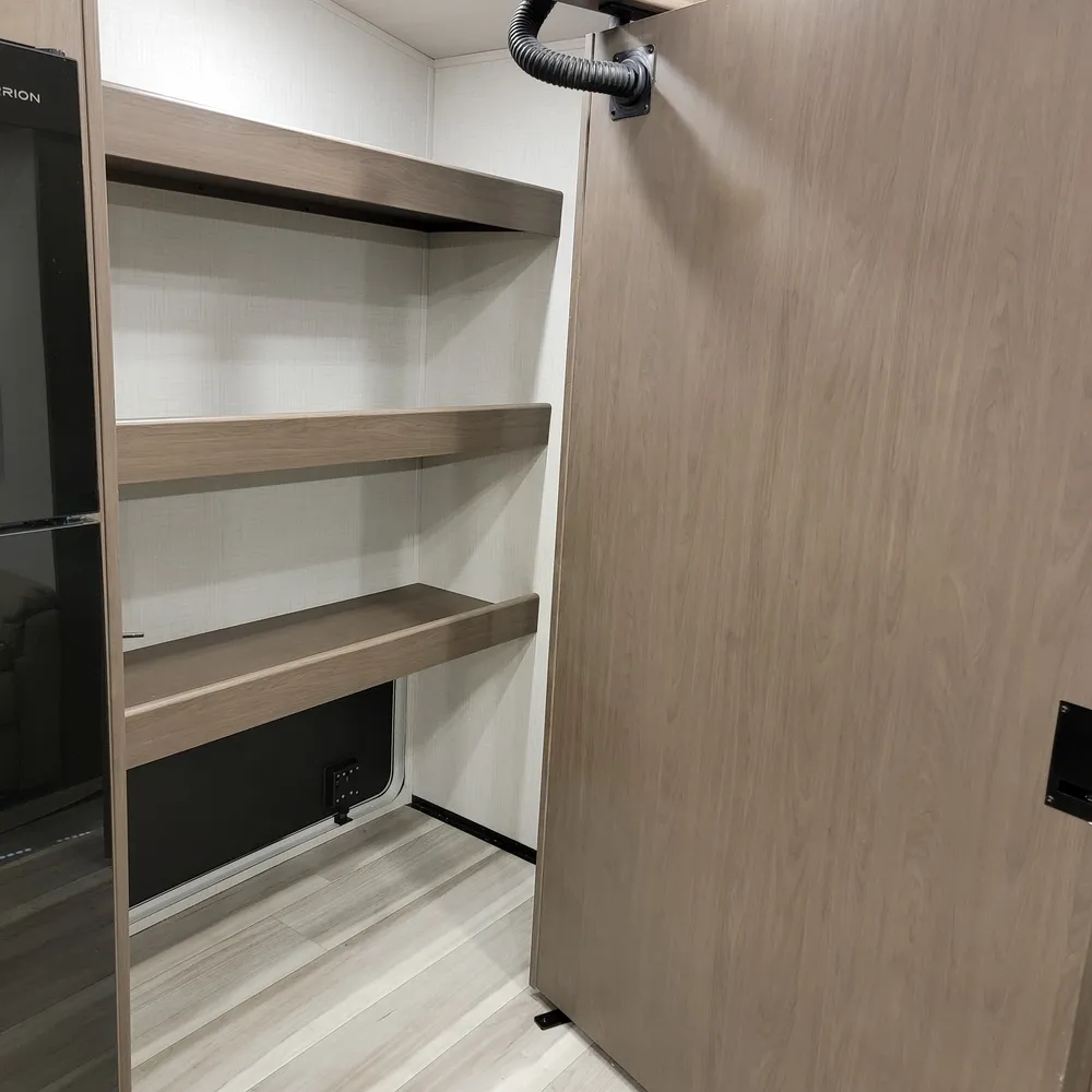 The 2026 Cougar Sport 2400RE is a fifth-wheel RV designed with a focus on lightweight towing and a spacious interior. It features a combined kitchen and living space with a large slide-out, a rear kitchen with a butler pantry, and a private front bedroom. The 2400RE is part of the Cougar Sport line, known for being smaller and lighter than the standard Cougar models, making it easier to tow.