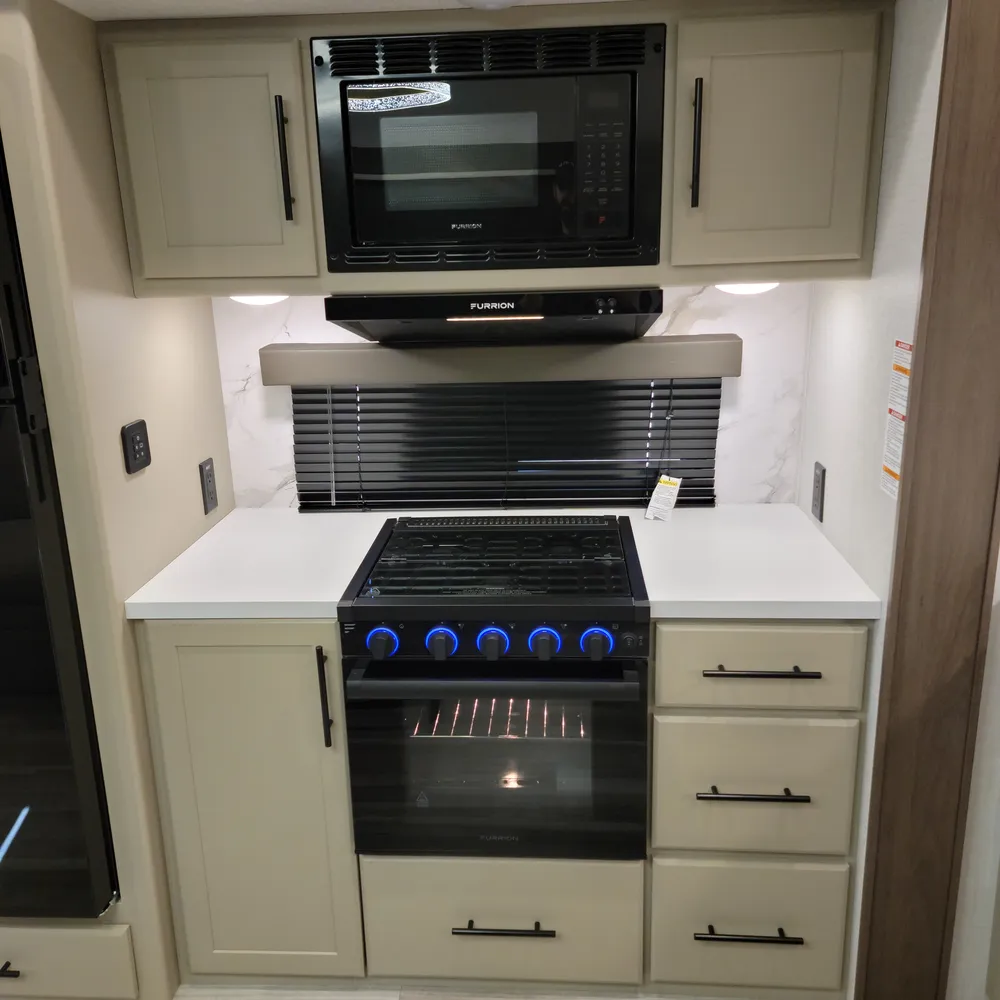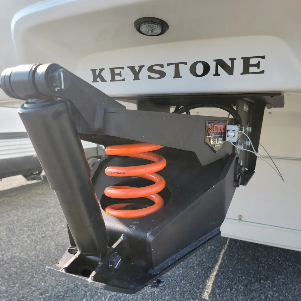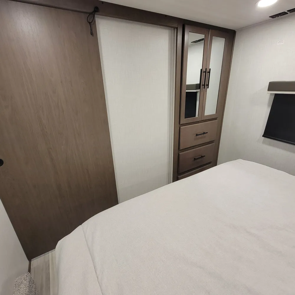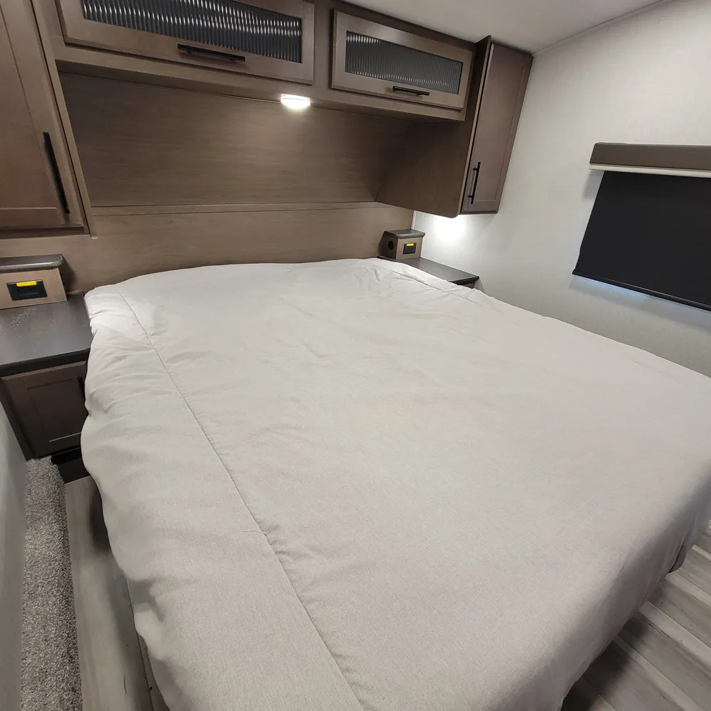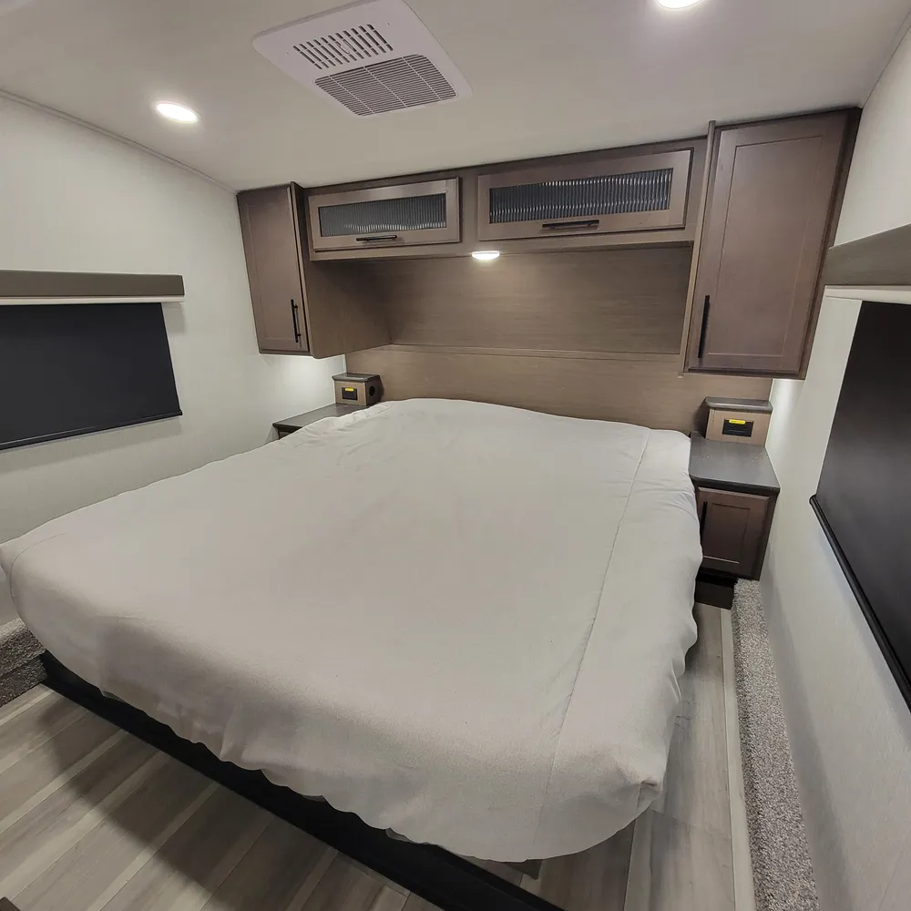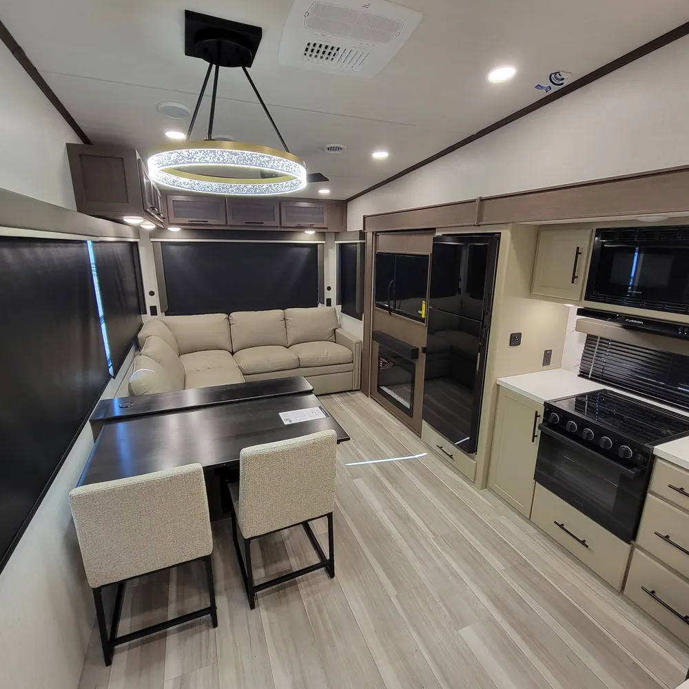 The 2026 Keystone Cougar Half-Ton 26RES is a popular choice for both short trips and extended stays. It offers a front private bedroom with a king bed, a large slide-out with an L-shaped sectional sofa, and a full bathroom. The 26RES also boasts a 18′ power awning, a hidden pantry behind the entertainment center, and a pivot dinette with two extra chairs.