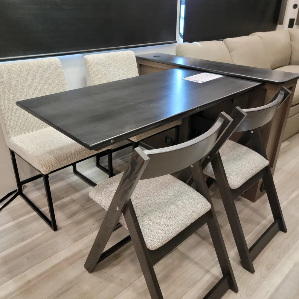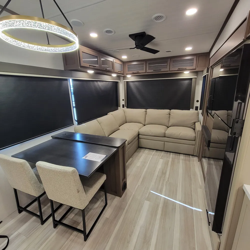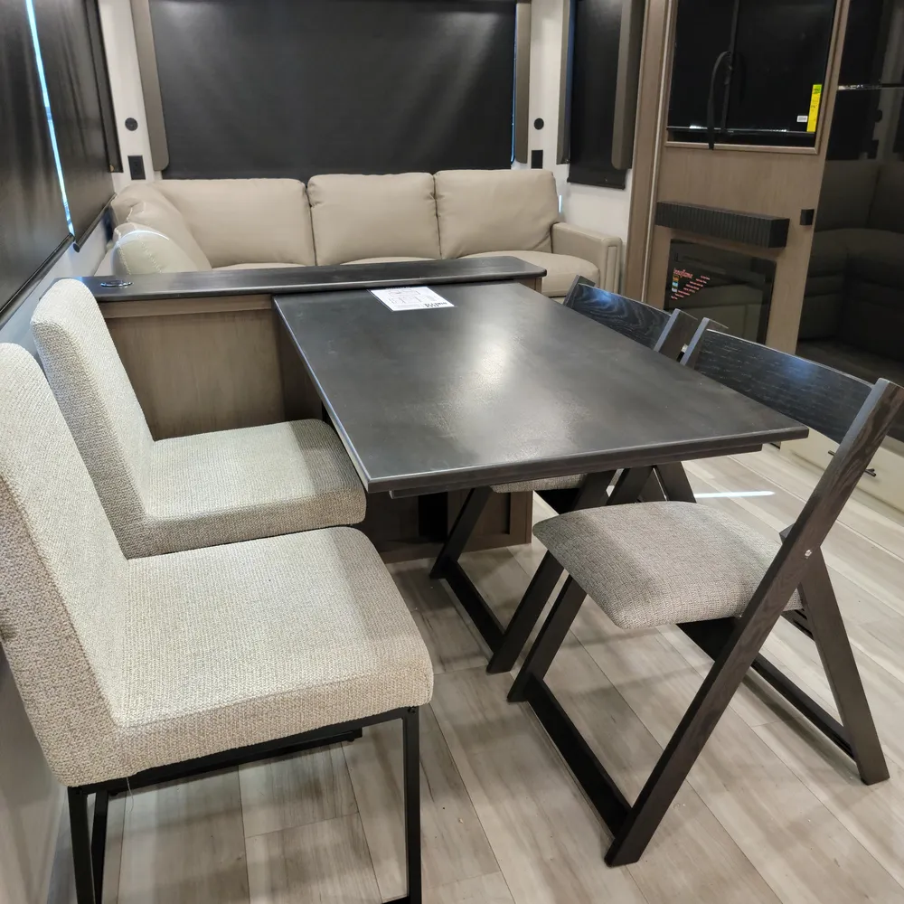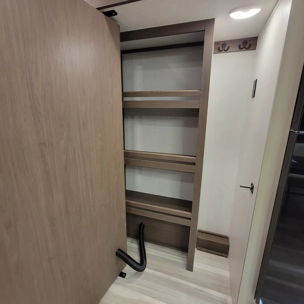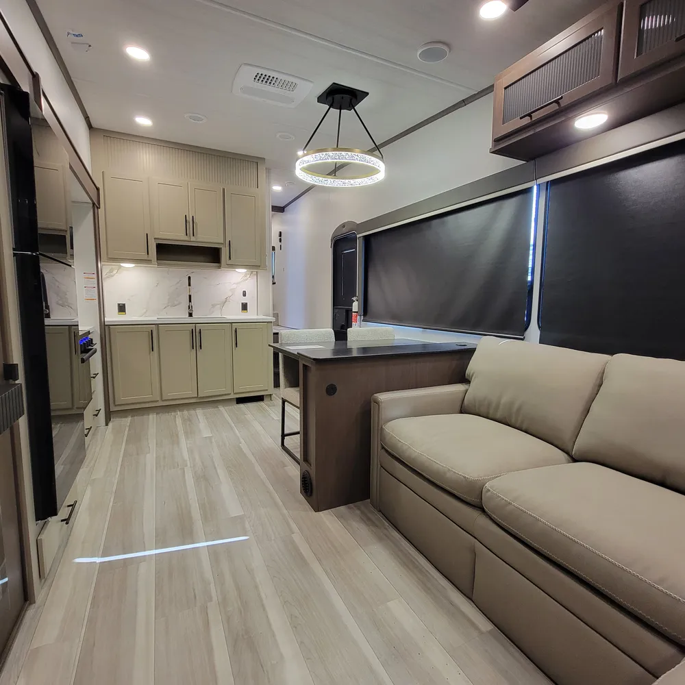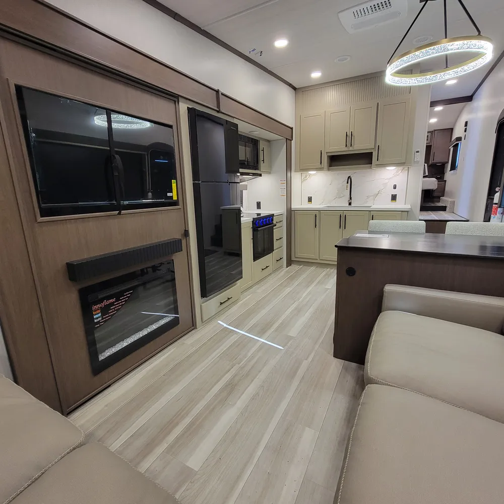 The 2026 Keystone Cougar Half-Ton 26RES is a popular choice for both short trips and extended stays. It offers a front private bedroom with a king bed, a large slide-out with an L-shaped sectional sofa, and a full bathroom. The 26RES also boasts a 18′ power awning, a hidden pantry behind the entertainment center, and a pivot dinette with two extra chairs.